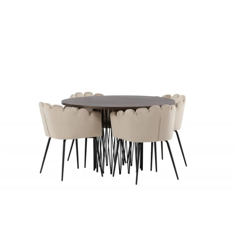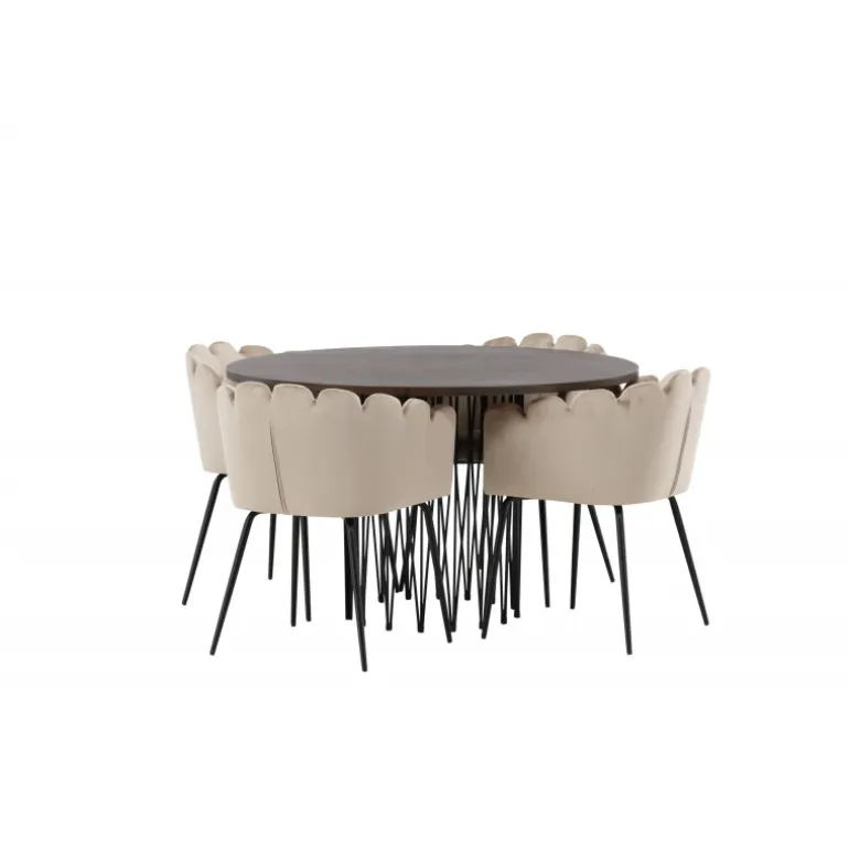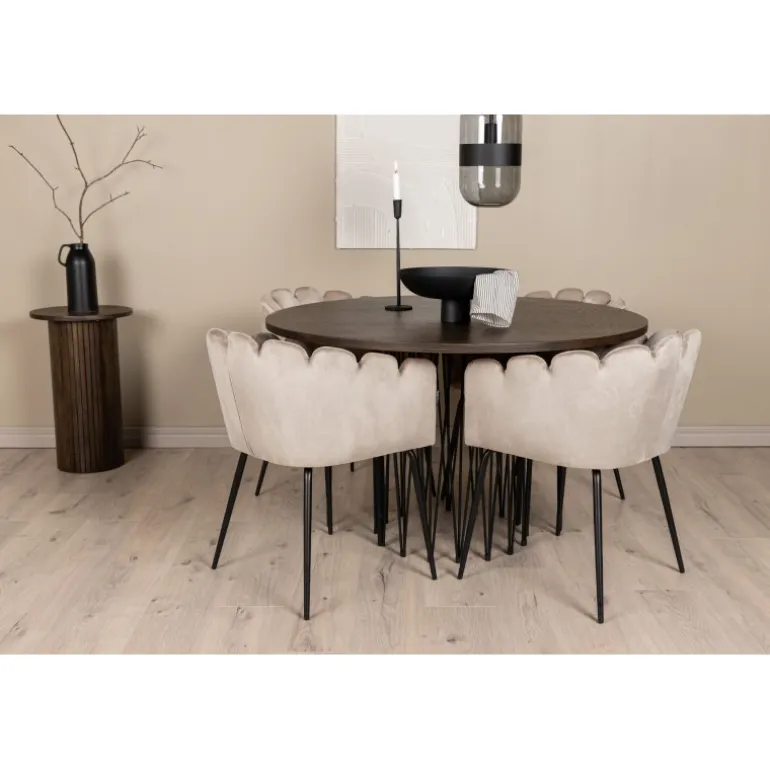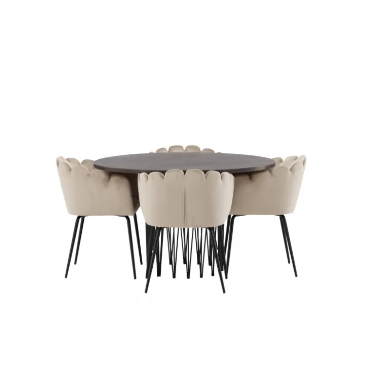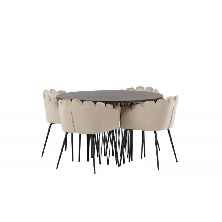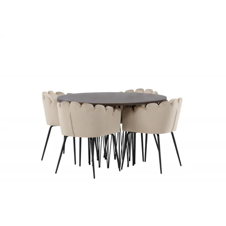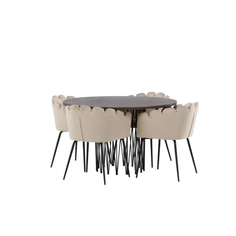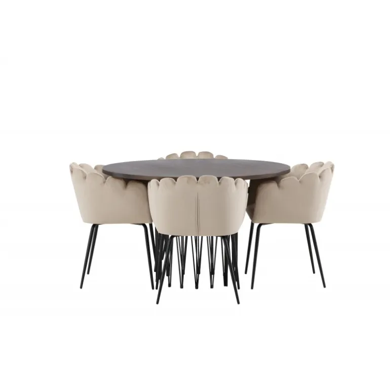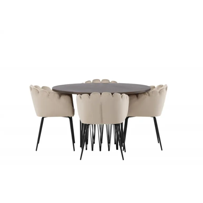 Indret hjertet af dit hjem med en Spisebordssæt, der udstråler luksus og komfort! Vores runde spisebord Sten har et fantastisk, skandinavisk design, der passer til enhver anledning. Bordet har en smuk brun bordplade i MDF med finer og en dekorativ cylinderformet ramme i sort metal. Her i perfekt kombination med vores iøjnefaldende stole fra Limhamn-serien. Stolen er en moderne favorit i mange husstande med sit indbydende design, dekorative muslingeskalsformede ryg med dekorative syninger og et rundt sæde i smagfuldt beige velourstof. Benene er i sort pulverlakeret metal. Sid komfortabelt og storslået!