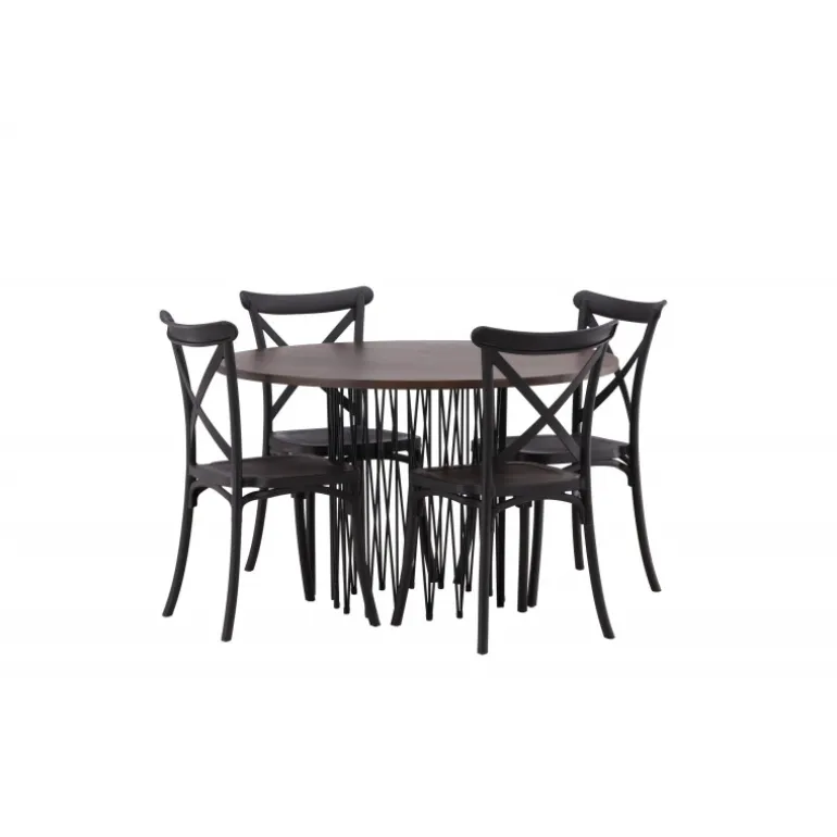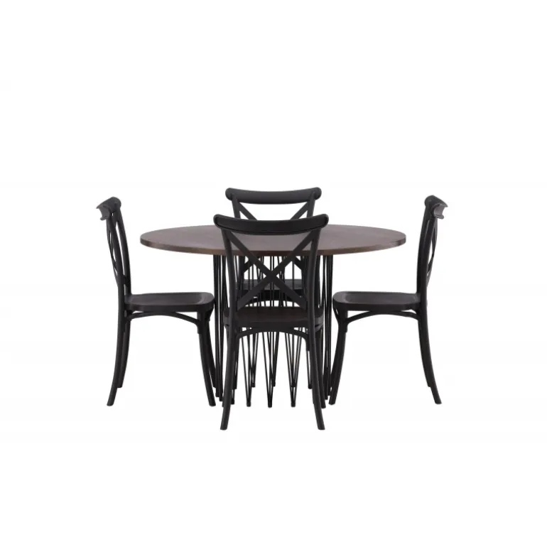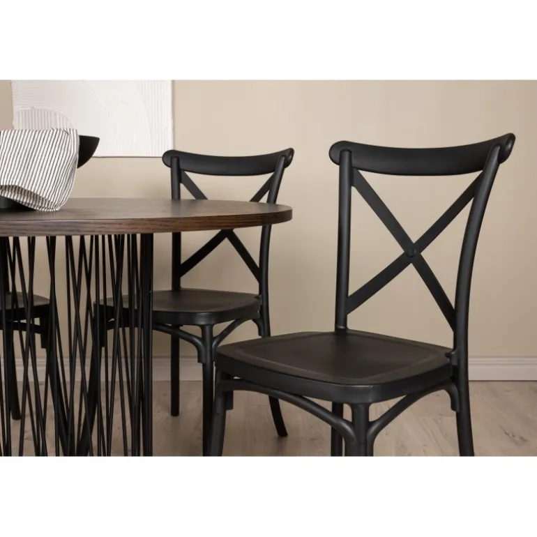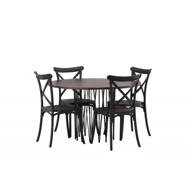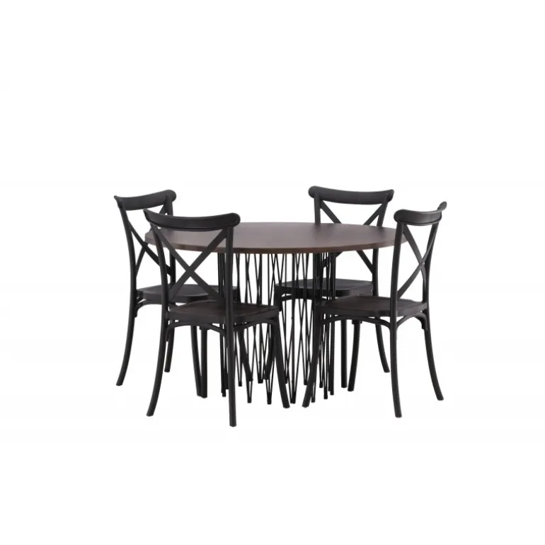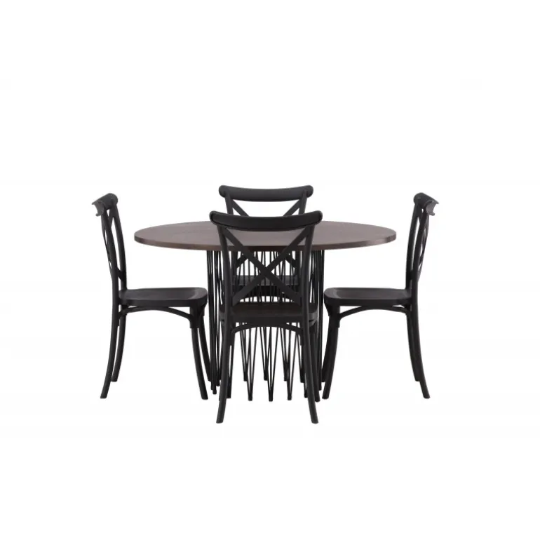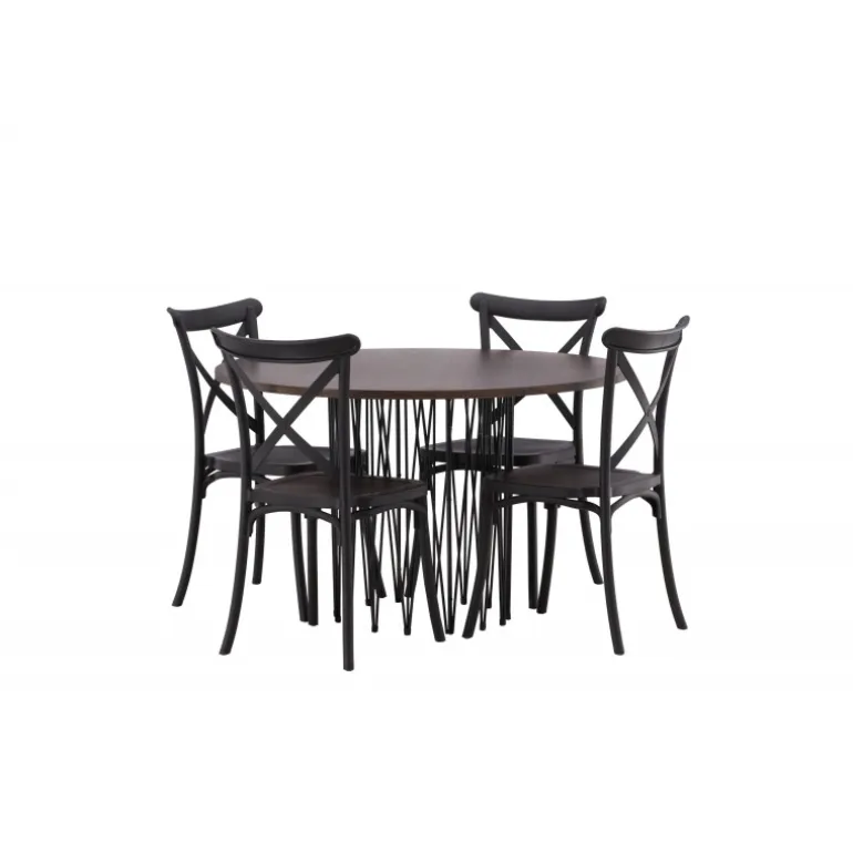 En Spisebordssæt, der kombinerer klassisk design og moderne former! Vores runde spisebord Sten har et dejligt skandinavisk design, der passer til enhver samling. Bordet har en smuk brun bordplade i MDF med finer og en dekorativ cylinderformet ramme i sort metal. Her sammen med spisebordsstole fra Crosett-serien. Stolene har et nostalgisk design med krydset ryg og lige linjer, konsekvent lavet af sort plastik. Her får du en stilfuld Spisebordssæt til at møblere dit hjem med!