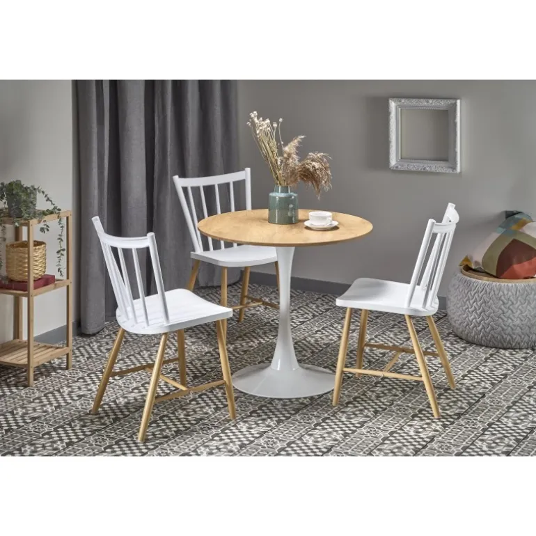 Oplev elegance og funktionalitet med STING bordet. Med en top i gylden eg og ben i hvid, passer dette bord perfekt ind i enhver moderne indretning. Laminat MDF og pulverlakeret stål sikrer holdbarhed og stil. Ideel til både spisestue og kontor, dette bord kombinerer æstetik og funktionalitet. Mål: fi 80/73 cm.
