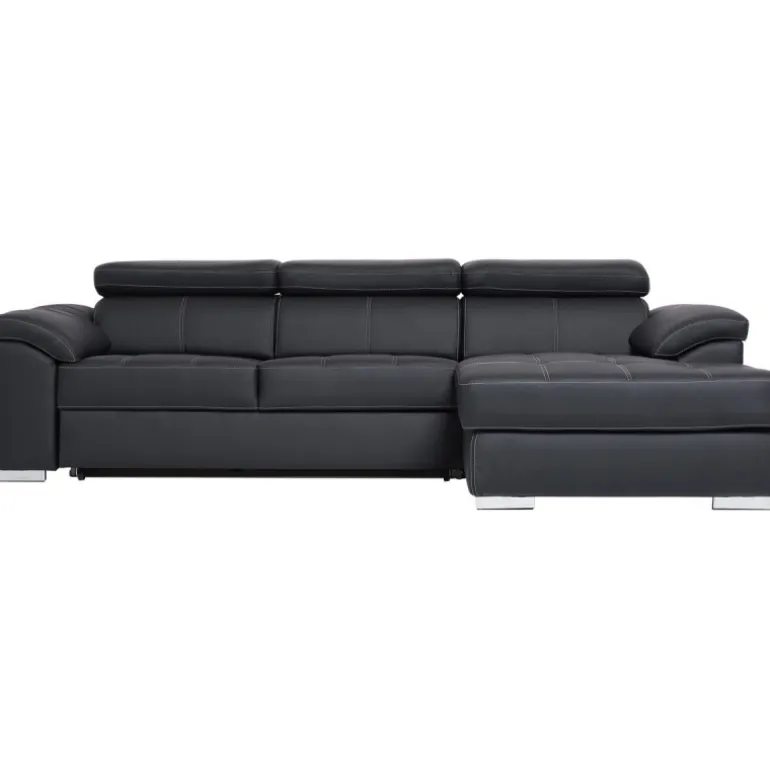 Stitch sovesofa med højrevendt chaiselong og nakkestøtter med vippefunktion. Sofaen kan slåes ud og omdannes til en bekvemmelig soveplads for 2 personer. Stitch sofaen er smart designet med hvide kontrastsyninger, nakkestøtter med vippefunktion, bløde behagelige armlæn og betrukket med sort vedligeholdelsesvenligt imiteret læder.