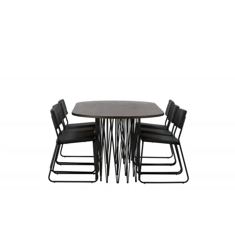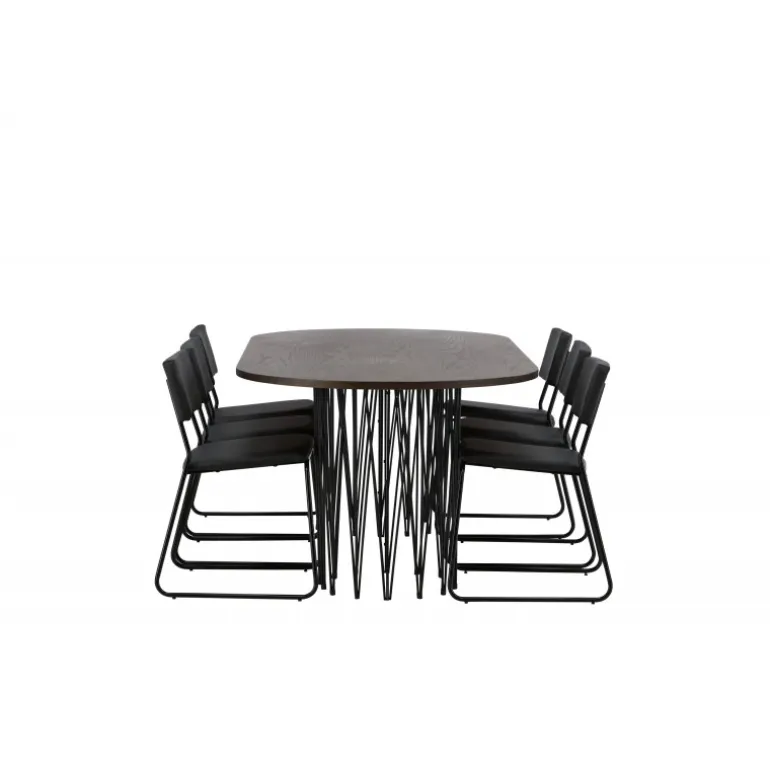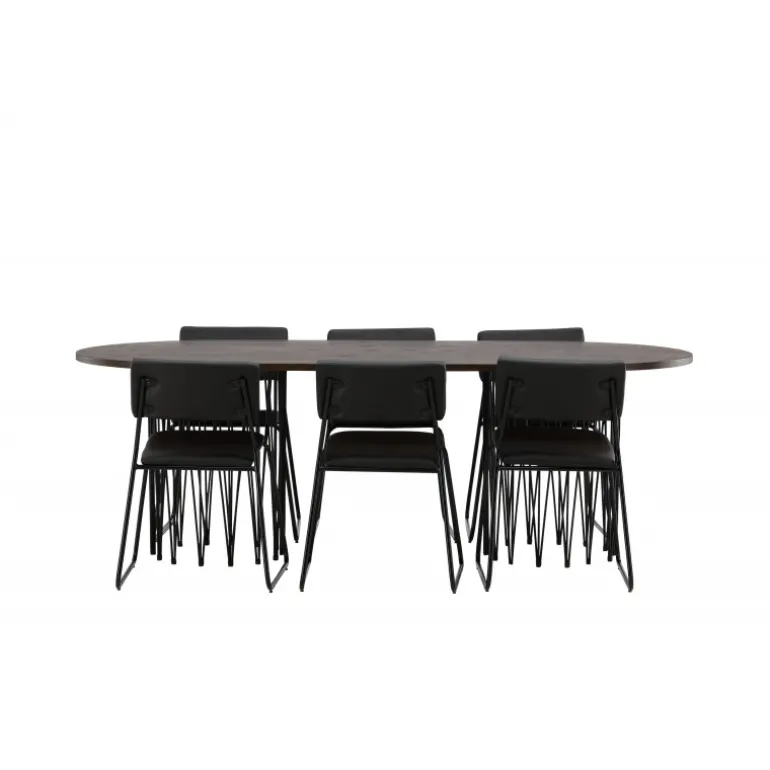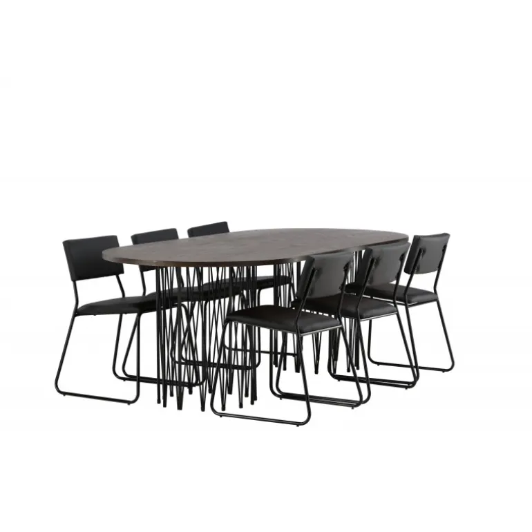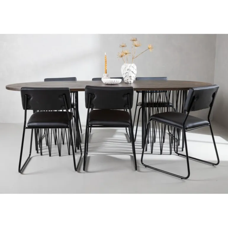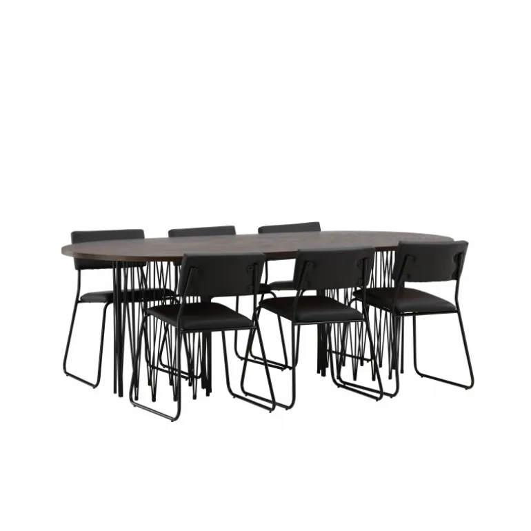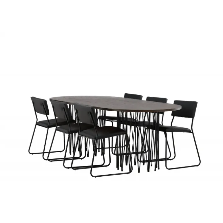 Et ovalt spisebord er perfekt, hvis du ønsker at skabe en social og indbydende atmosfære i dit hjem! Stone spisebord imponerer med sit modebevidste design. Det tilhører Furniture Fashion-kollektionen og har en smuk brun bordplade i MDF med finer og to dekorative cylinderformede rammer i sort metal. Her sammen med vores minimalistiske spisebordsstole fra Kenth-serien. Stolen har et minimalistisk, moderne design, der skaber en luftig følelse i rummet. Ryg og sæde er i sort polyurethanlæder og polyester, og de smalle ben er i jern. Sid komfortabelt og nyd et familievenligt Spisebordssæt!