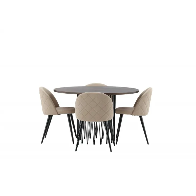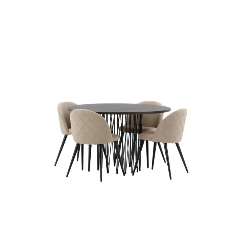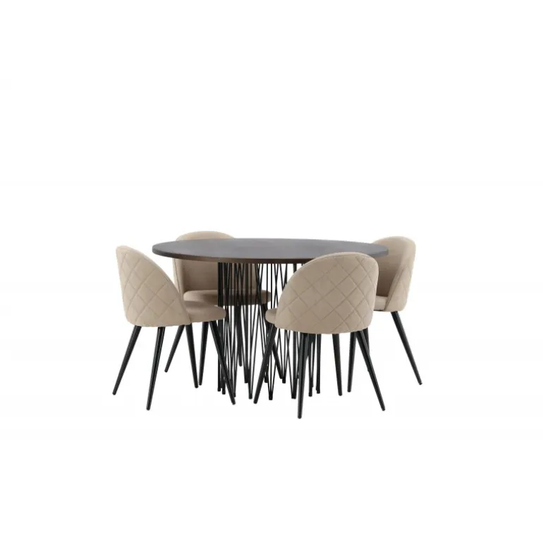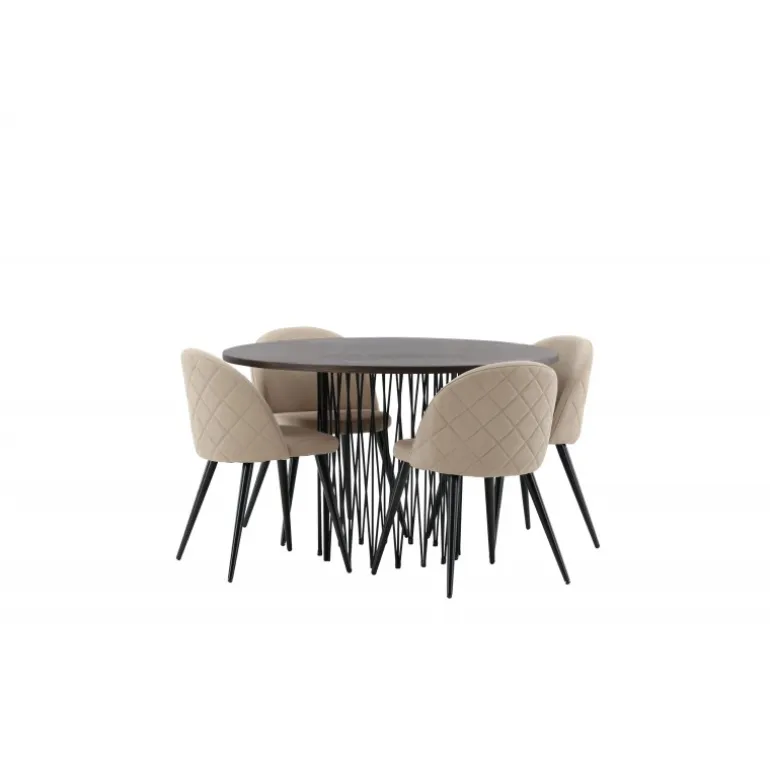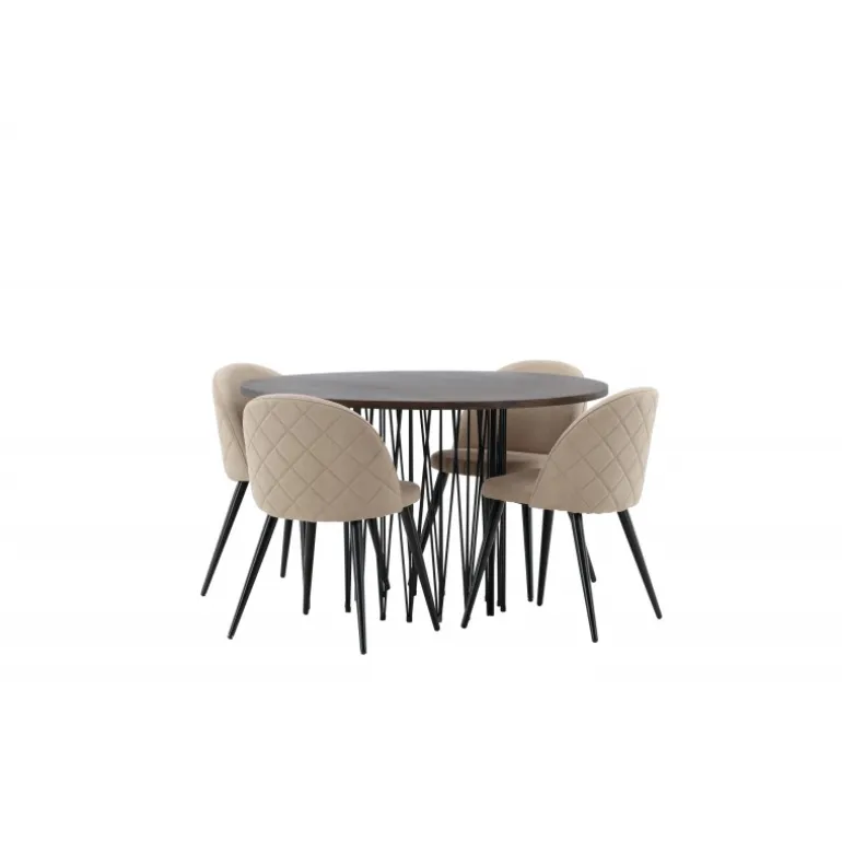 Undgå at kompromittere mellem stil og komfort! Vores runde spisebord, Stone, har et fantastisk, skandinavisk design, der passer til enhver sammenkomst. Bordet har en smuk brun MDF-bordplade med finer og en dekorativ cylinderformet ramme i sort metal. Her sammen med vores populære spisebordsstole fra Velvet Stitches-serien i en elegant beige farve. Denne spisebordsstol har et fuldt polstret design med en let rundet ryg og sæde i blødt polyesterstof og ben i sort pulverlakeret metal. Skab et charmerende midtpunkt, hvor familien kan samles!