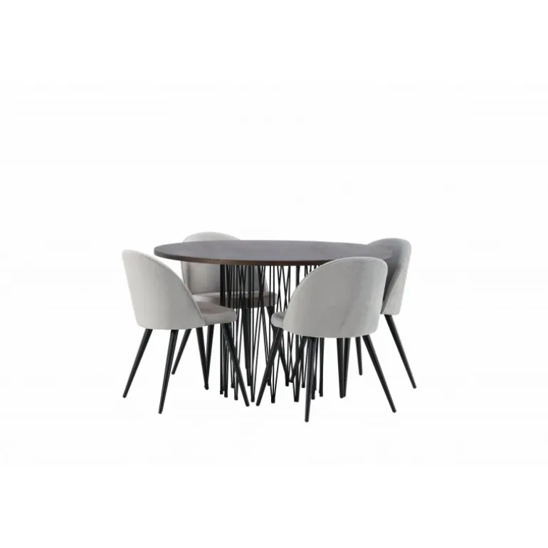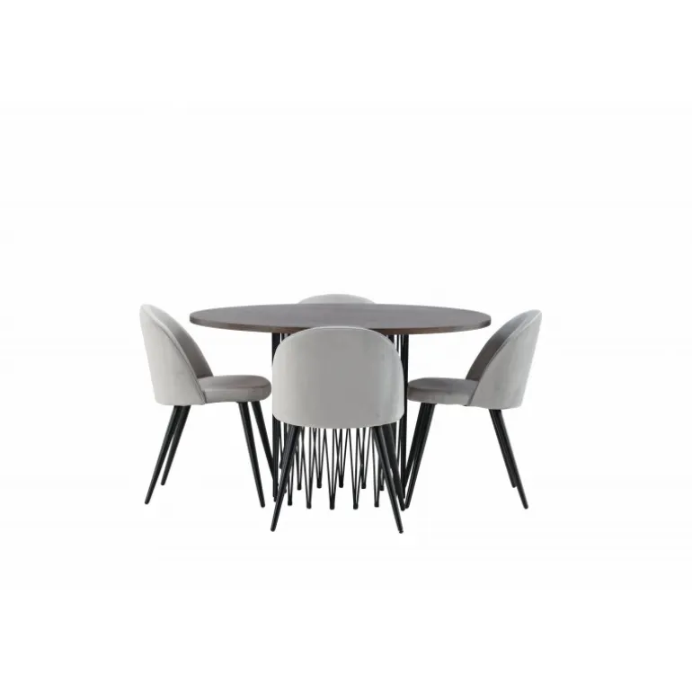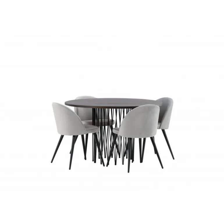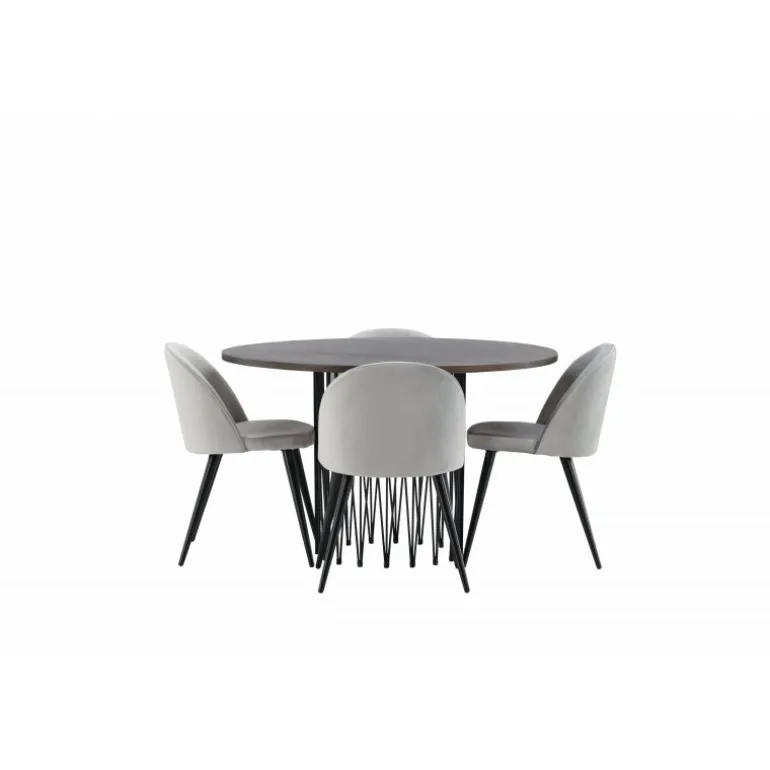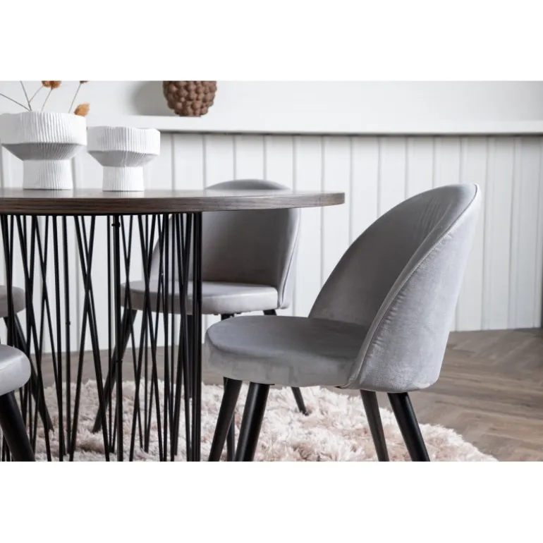 Undgå at gå på kompromis mellem stil og komfort! Vores runde spisebord Stone har et fantastisk, skandinavisk design, der udstråler charme. Bordet har en smuk, brun bordplade i MDF med finer og en dekorativ cylinderformet ramme i sort metal. Her sammen med vores populære spisebordsstole fra Velvet-serien i en behagelig grå farve. Denne spisebordsstol har et fuldt polstret design med en let rundet ryg og sæde i blødt velourstof og ben i sort pulverlakeret metal. Skab et charmerende midtpunkt for familien at samles omkring!