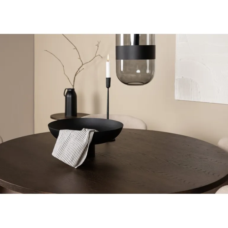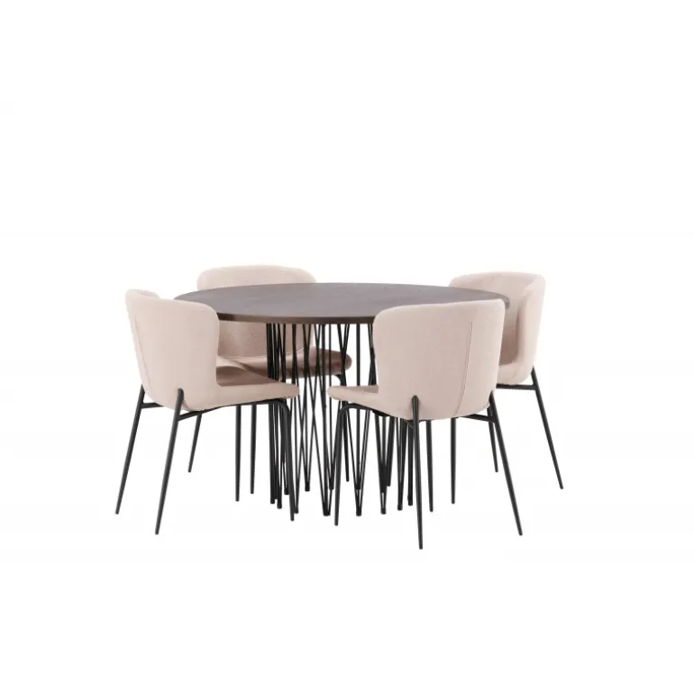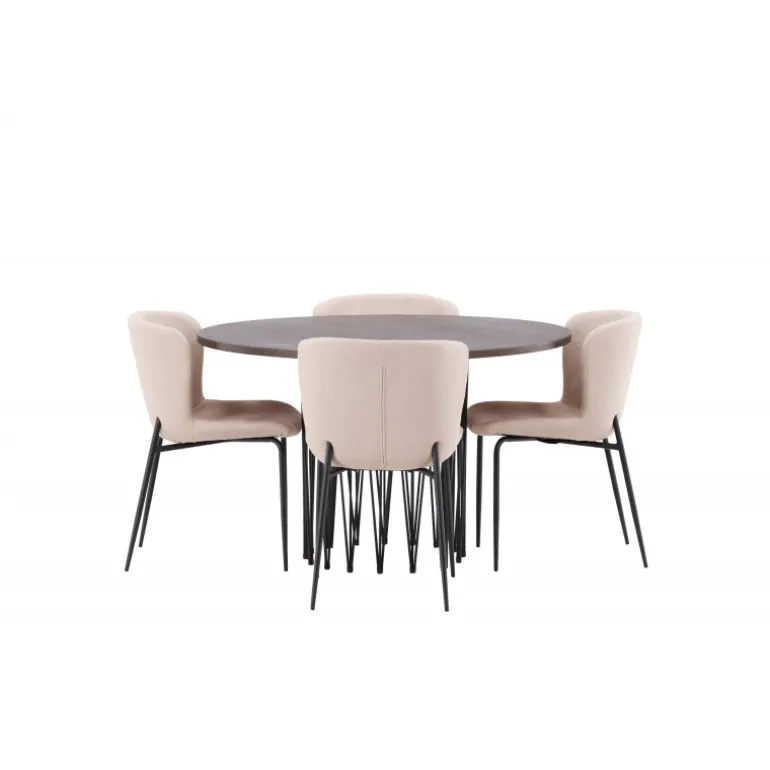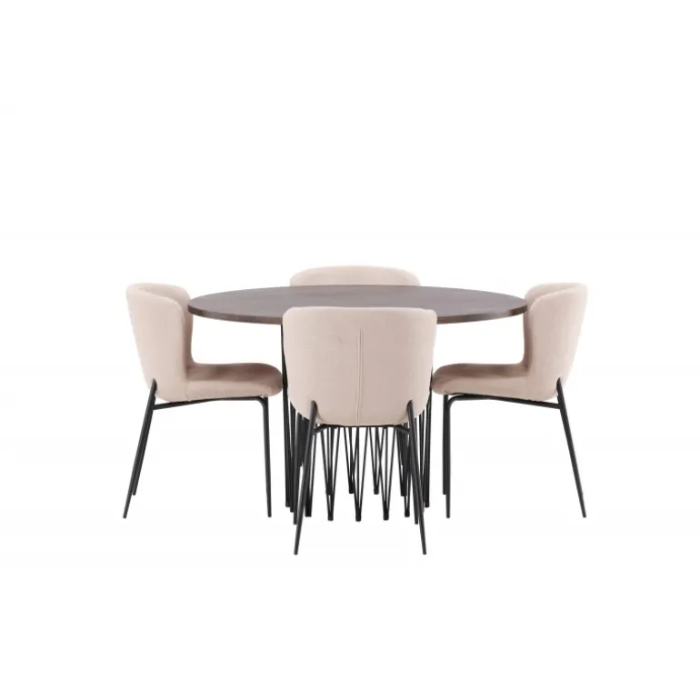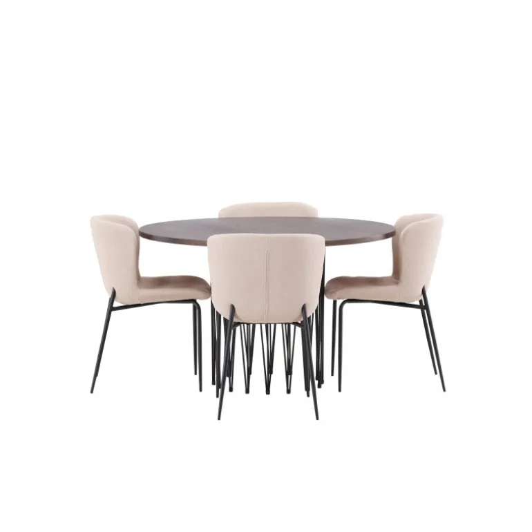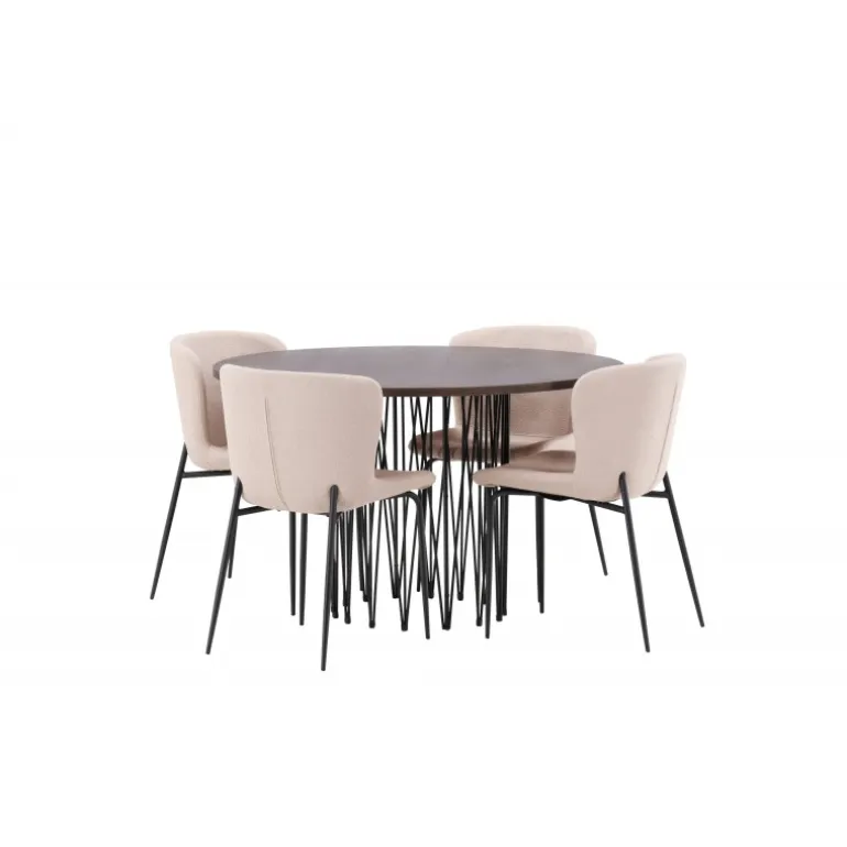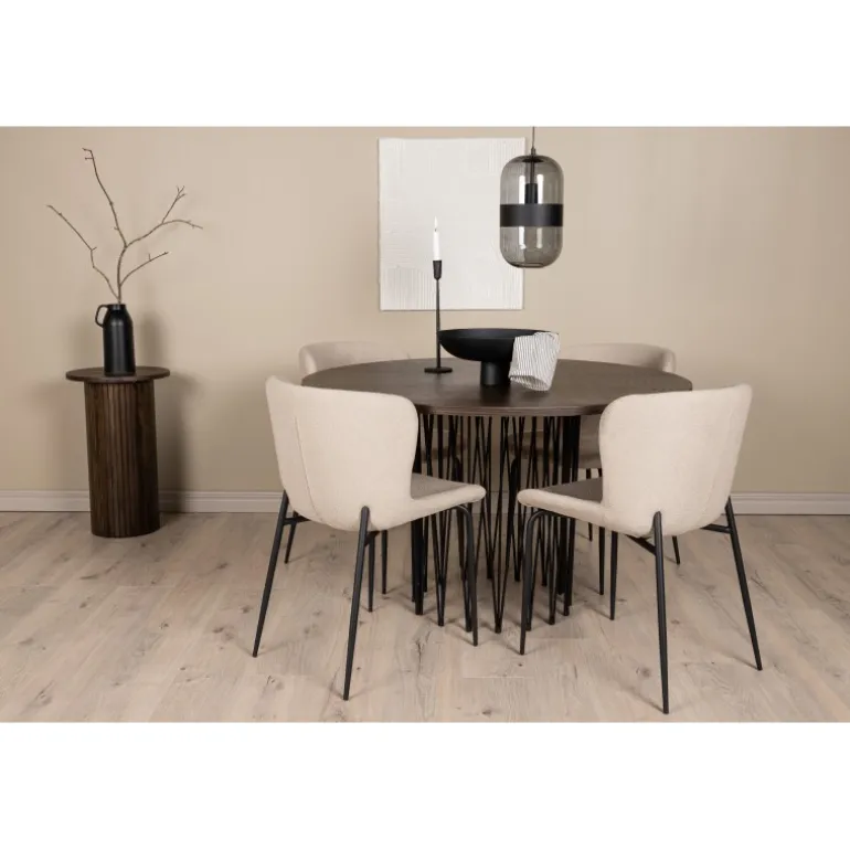Dette Spisebordssæt udstråler bekvemmelighed, moderne design og klassiske former! Vores runde spisebord Stone har et fantastisk, skandinavisk design, der passer til enhver anledning. Bordet har en smuk, brun bordplade i MDF med finér og en dekorativ cylinderformet ramme i sort metal. Perfekt kombineret med vores komfortable spisestole fra Modesto-serien. Stolen er fuldt polstret i beige bouclé-stof med stilfulde, minimalistiske ben i sort metal. Den let afrundede ryg og polstrede sædehynde giver ekstra komfort og forlænger de hyggelige måltider omkring spisebordet. Det skal føles godt at sætte sig ned til en dejlig middag!