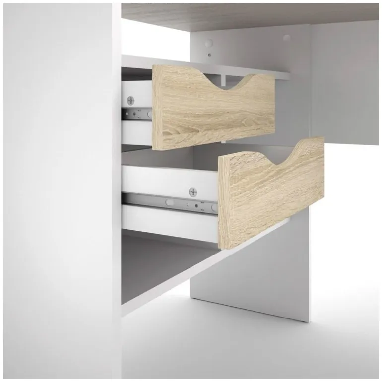 Surrey skrivebord i hvid & eg struktur. Lækkert hjørne skrivebord med små rum & 2 små skuffer.