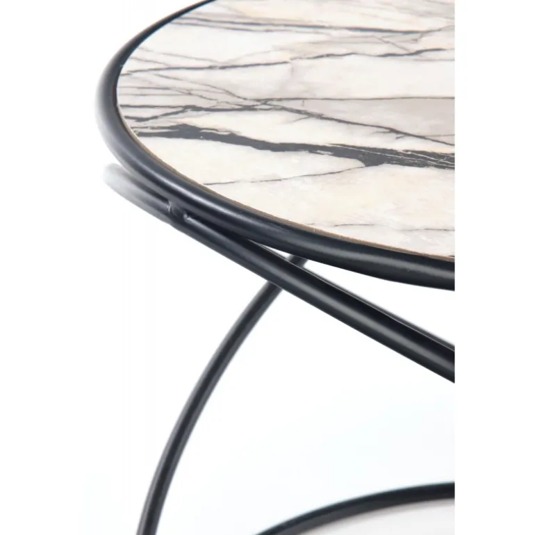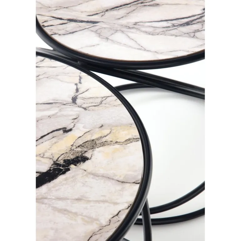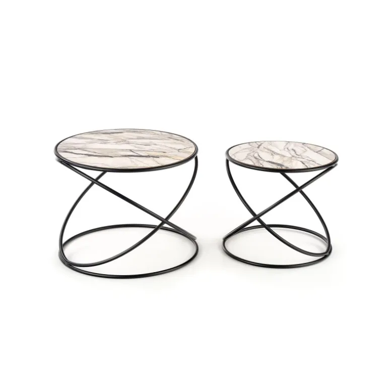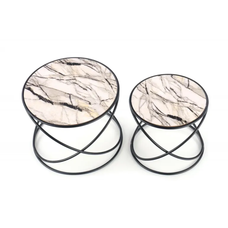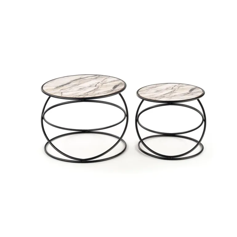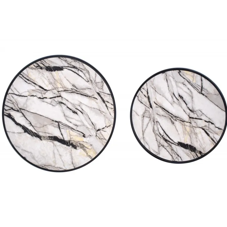 Oplev elegance og funktionalitet med SUSANNA, et sæt af to stilfulde sofaborde i hvid marmor og Sort. Disse borde er designet til at tilføje et moderne touch til din stue. Med dimensionerne fi 40/35 cm og fi 50/39 cm passer de perfekt til både små og store rum. De er fremstillet af lamineret MDF og pulverlakeret stål, hvilket sikrer holdbarhed og en flot finish. Dette sæt vil ikke kun være en praktisk tilføjelse, men også en samtalestarter i dit hjem.