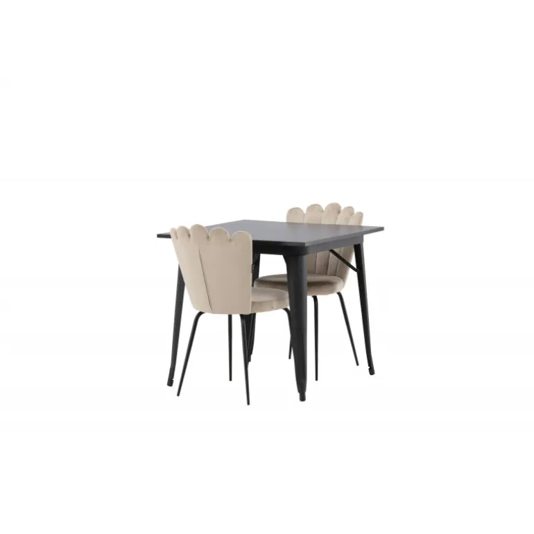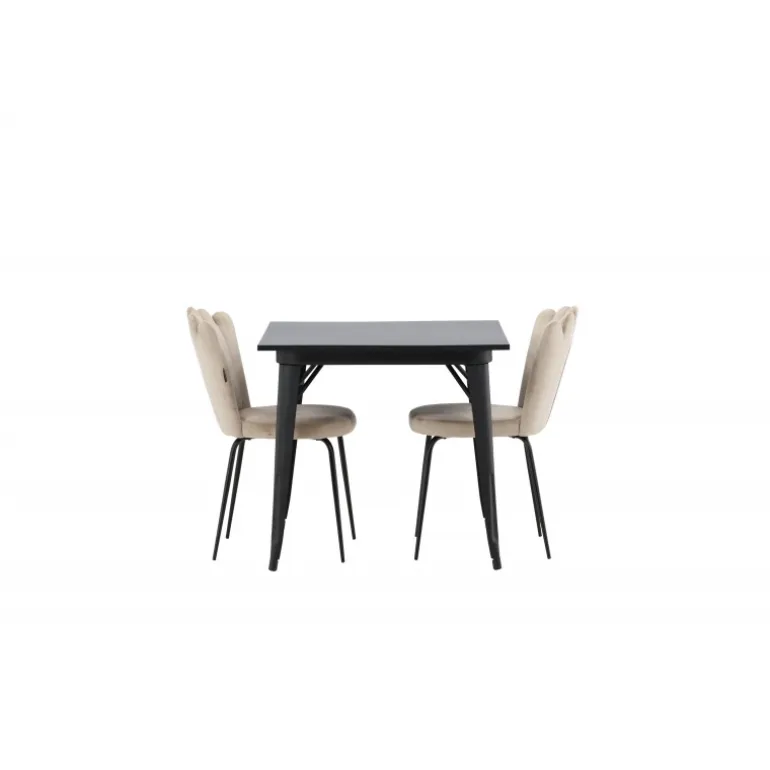 En elegant og luksuriøs Spisebordssæt! Dette spisebord fra Tempe-serien har et klassisk og tidløst design i sort. Bordpladen er lavet af sort MDF, og bordbenene er i sort metal. Kombineret med to komfortable spisebordsstole fra Limhamn-serien, som har et moderne design med en dekorativ, muslingeformet ryg og en rund sæde i beige velourstof. Stolens ben er i sort pulverlakeret metal. Sid komfortabelt og storslået!