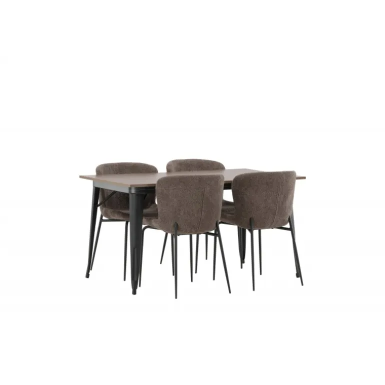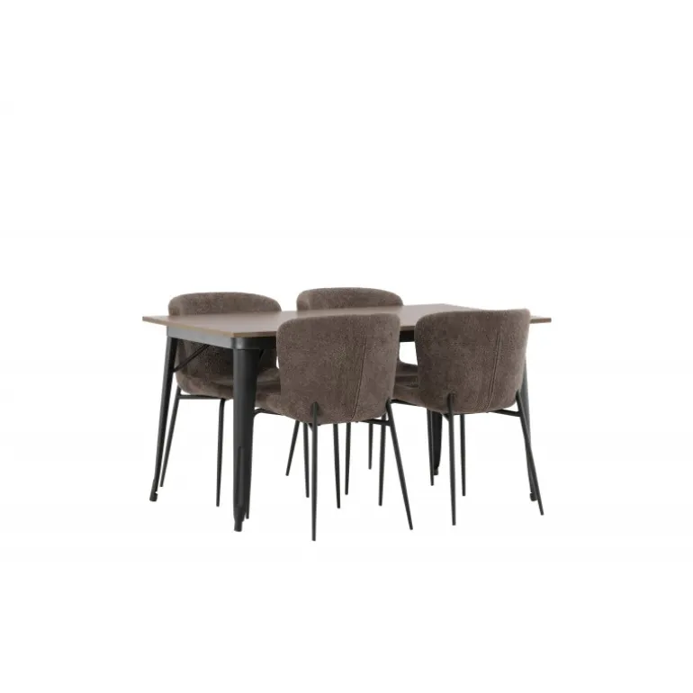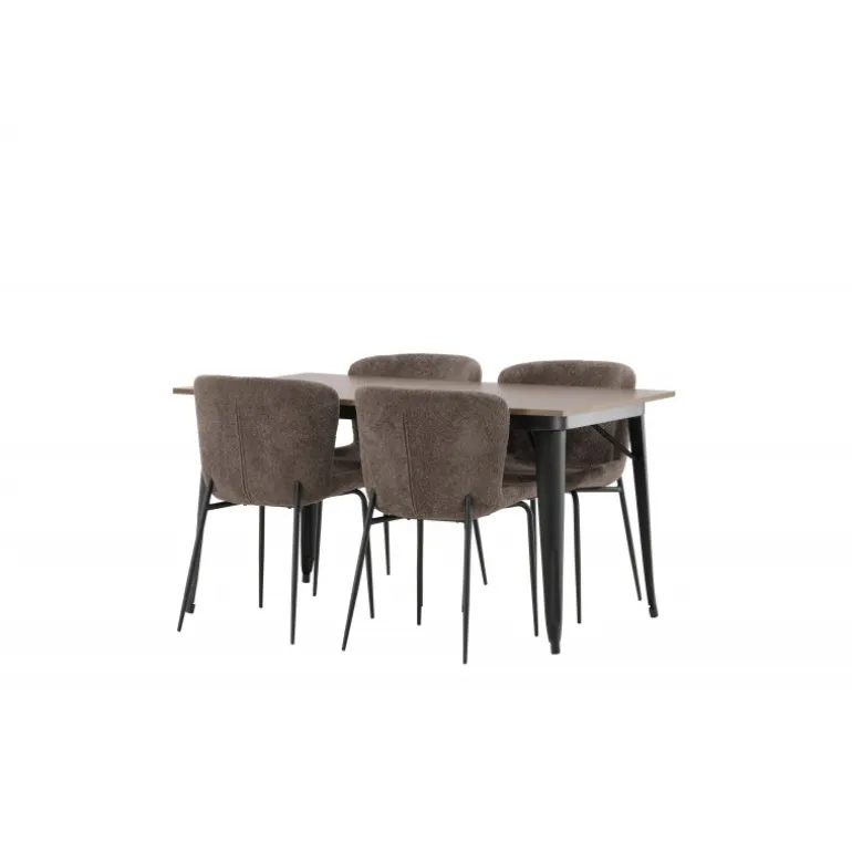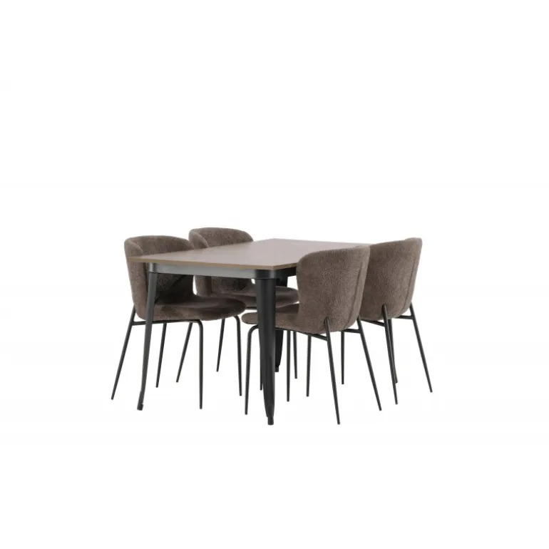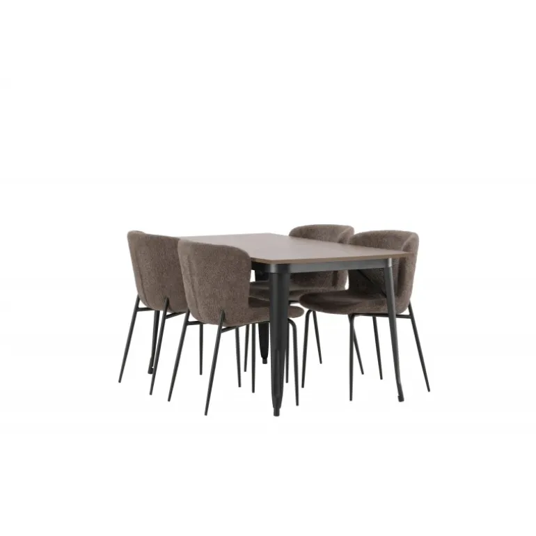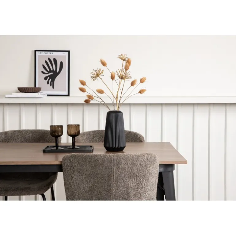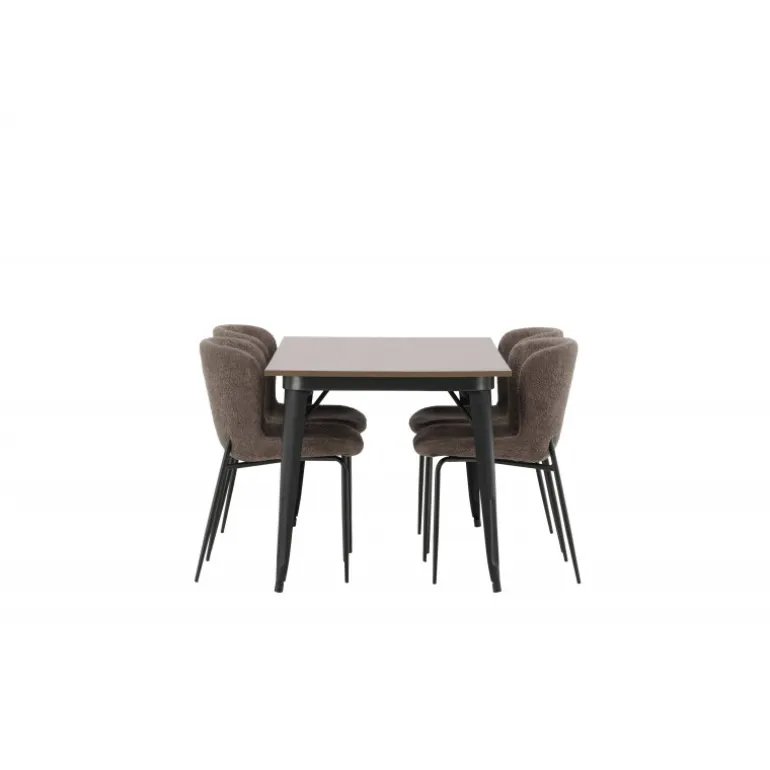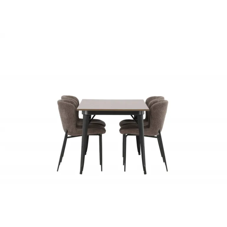 Stilfuldt, moderne og holdbart – et Spisebordssæt, der står tidens prøve! Spisebordet fra Tempe-serien tilhører Venture Home-kollektionen og har et iøjnefaldende, skandinavisk design. Lavet med en kvadratisk bordplade i sort MDF og ben i sort metal. Her i perfekt kombination med vores komfortable spisebordsstole fra Modesto-serien. Stolen er fuldt polstret i beige bouclé-stof med stilfulde smalle ben i sort metal. Den let afrundede ryg og polstrede sædepude giver ekstra komfort og forlænger hyggelige måltider omkring spisebordet. Det skal føles godt at sætte sig ned til et dejligt måltid!