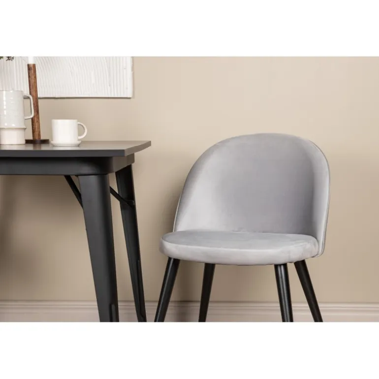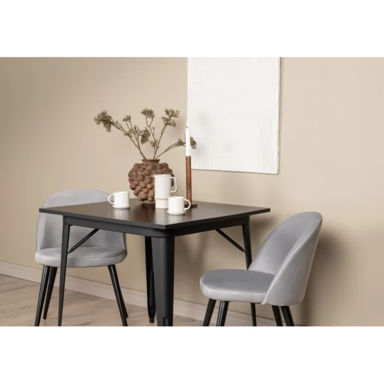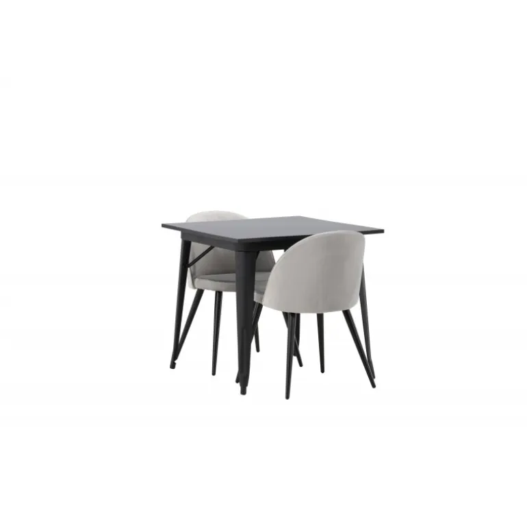Oplev charmen ved dette Spisebordssæt til to, perfekt til det lille køkken! Spisebordet fra Tempe-serien har et klassisk, firkantet design og en tidløs sort farve. Bordpladen er lavet af sort MDF, mens benene er i sort metal. Kombineret med to spisebordsstole fra Velvet-serien i en behagelig grå farve, tilbyder dette sæt både komfort og stil. Stolene er fuldt polstrede med en let afrundet ryg og sæde i blødt velourstof og ben i sort pulverlakeret metal. Sid komfortabelt og stilfuldt!