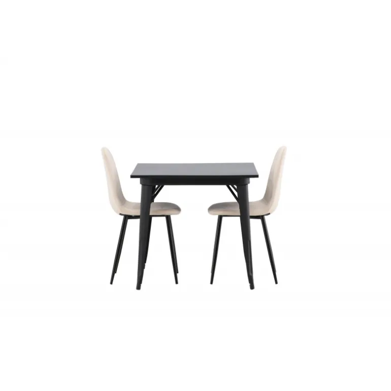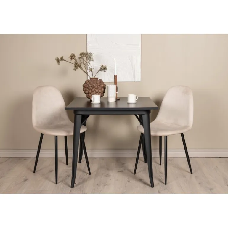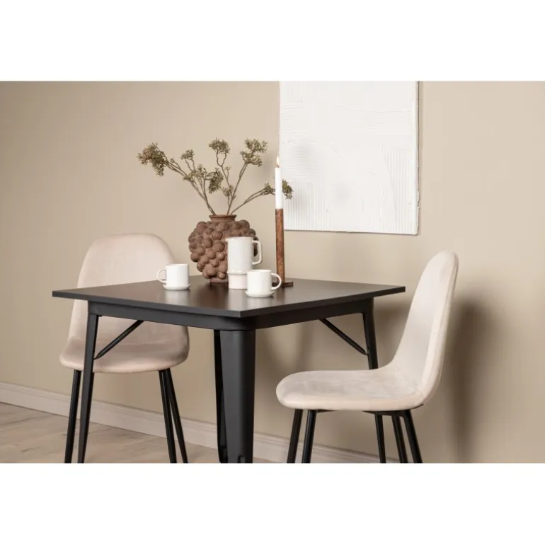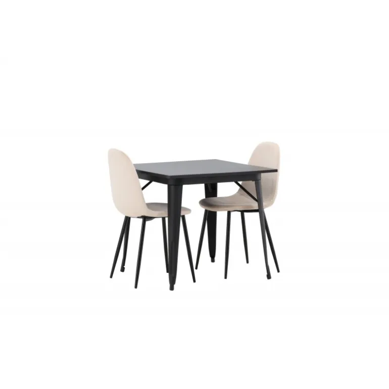 Et charmerende Spisebordssæt til to – perfekt til det lille køkken! Dette spisebord fra Tempe-serien har et klassisk, firkantet design og en tidløs sort farve. Bordpladen er i sort MDF, og bordbenene er i sort metal. Her i en smagfuld kombination med to spiseborde fra Polar-serien i en champagnefarvet nuance. Stolene har et fuldt polstret design med en rund ryg og sæde i beige velourstof med blød polstring og ben i sort pulverlakeret metal. Undgå at gå på kompromis mellem komfort og design!