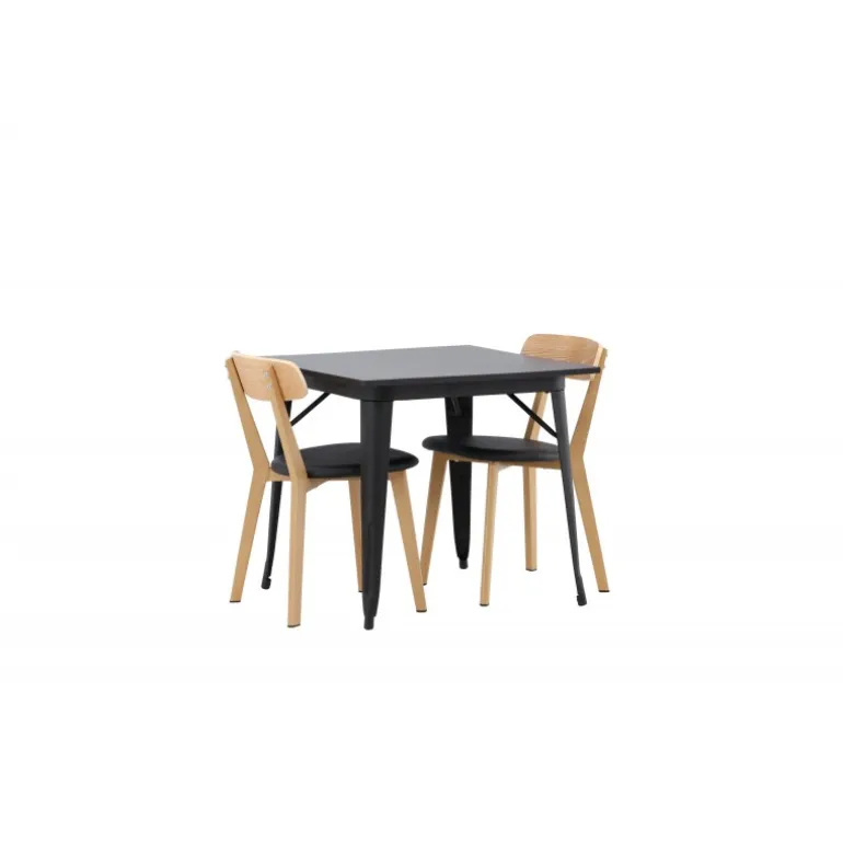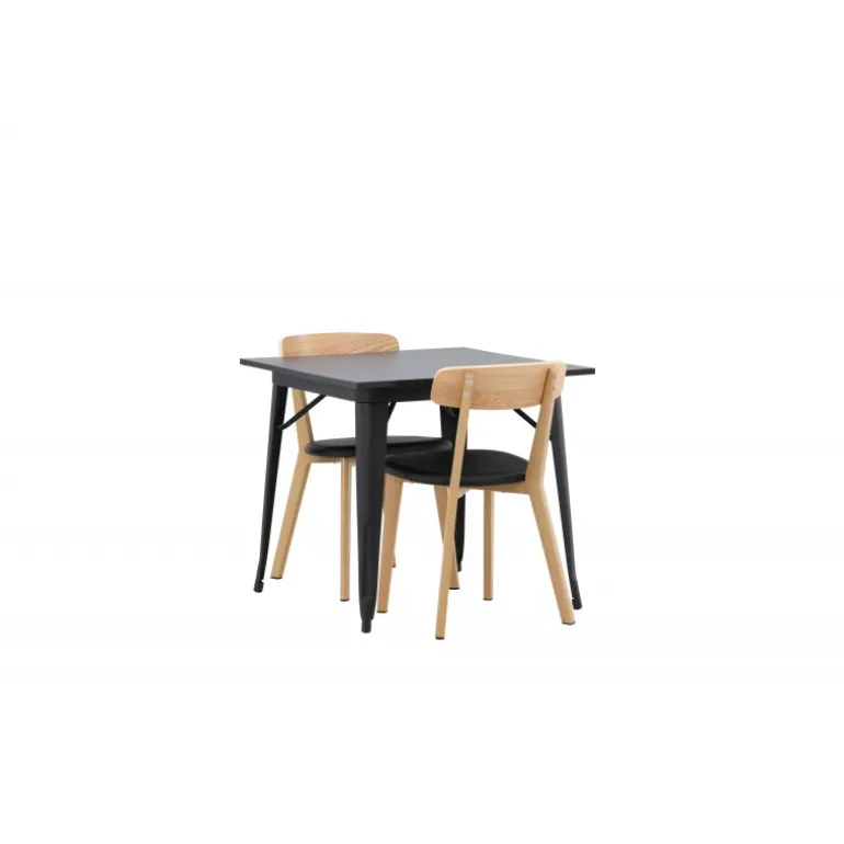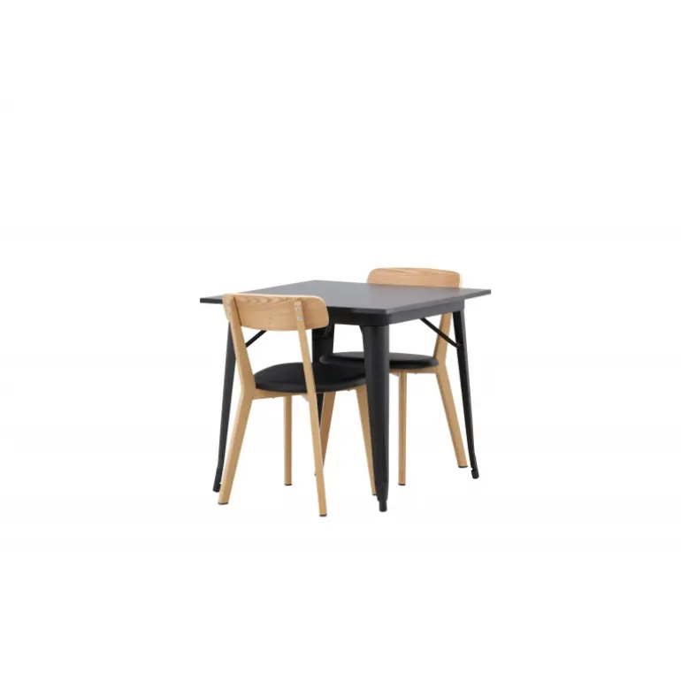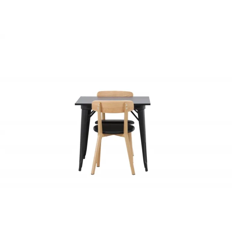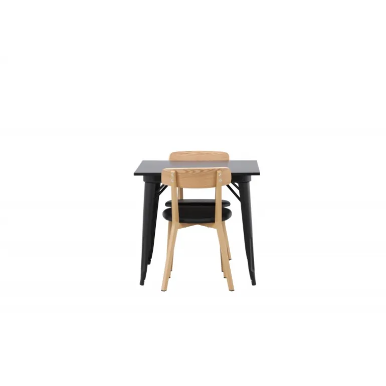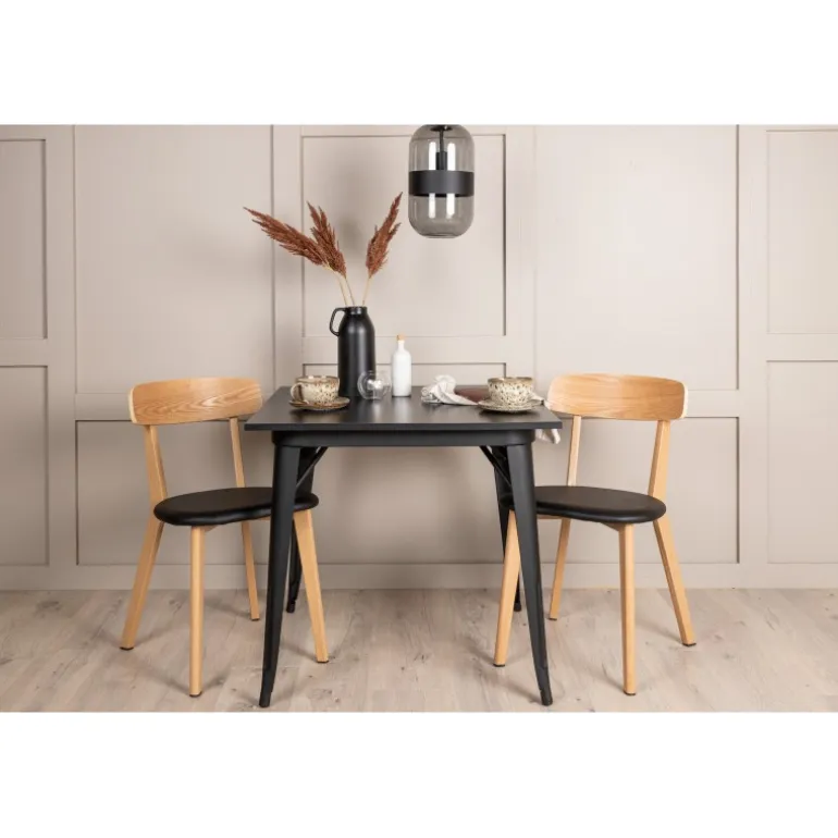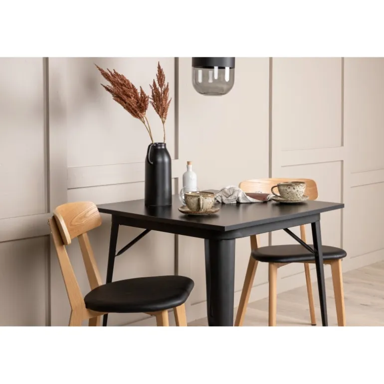 Indret dit hjem smart og stilfuldt! Dette spisebord fra Tempe-serien har et klassisk, firkantet design og en tidløs sort farve. Bordpladen er i sort MDF og bordbenene i sort metal. Her i perfekt kombination med vores smagfulde spisestole fra Sanjos-serien. Stolen tilhører Venture Home-kollektionen og har et dejligt design i farverne sort og naturtræ. Det bløde sæde er skum polstret for ekstra komfort og har et lækkert PU-læder i sort. Ryggen og benene er lavet af lyst træ og giver indtryk af et klassisk design. Sid komfortabelt!