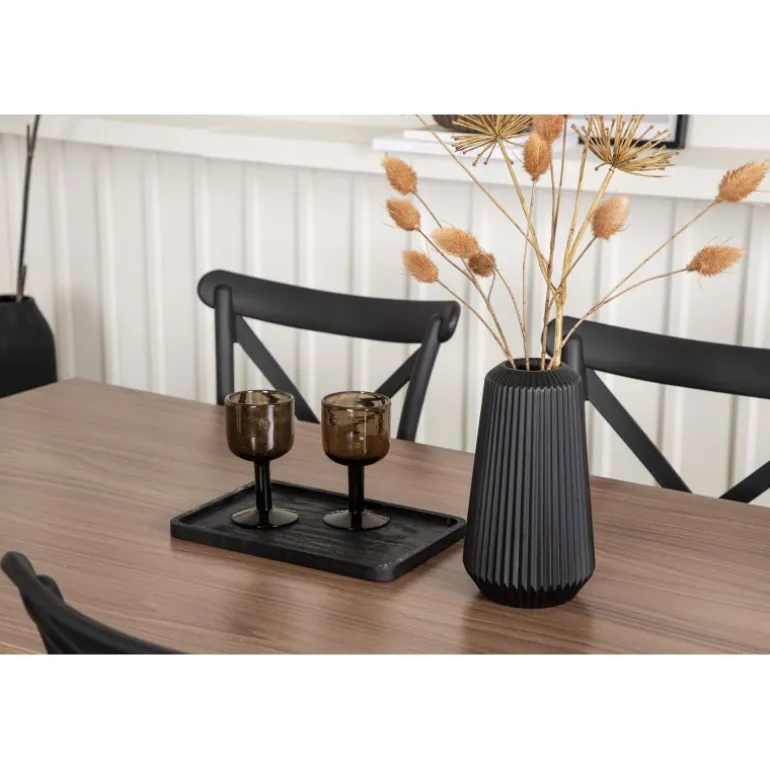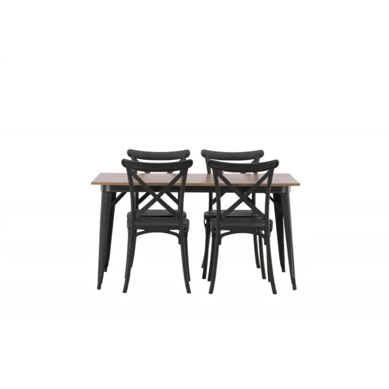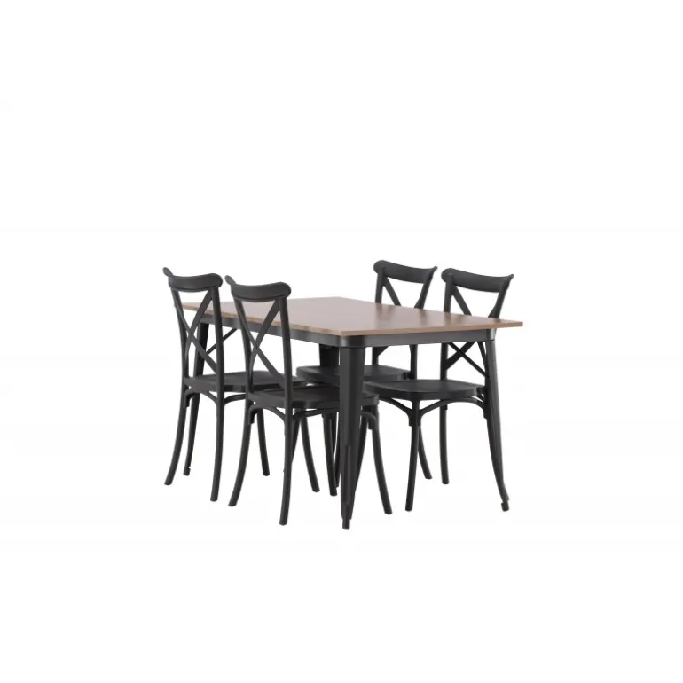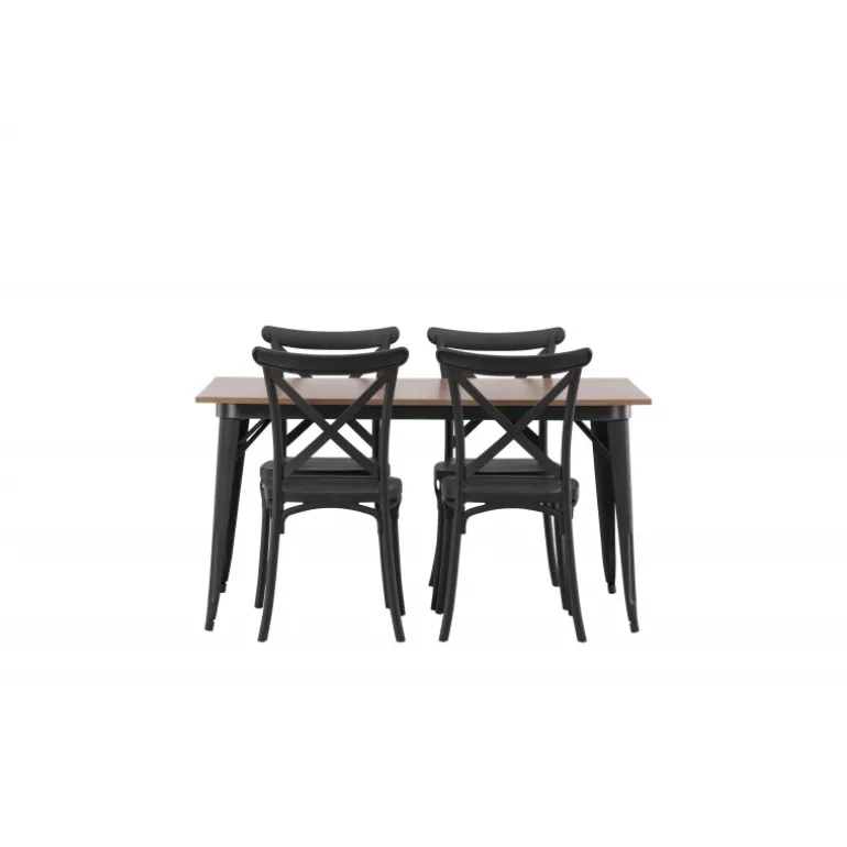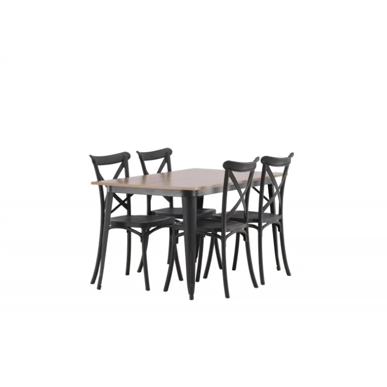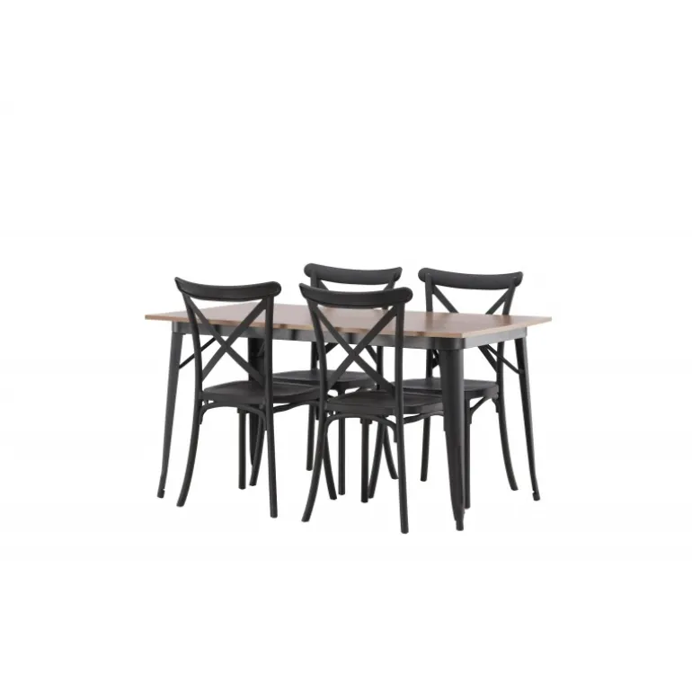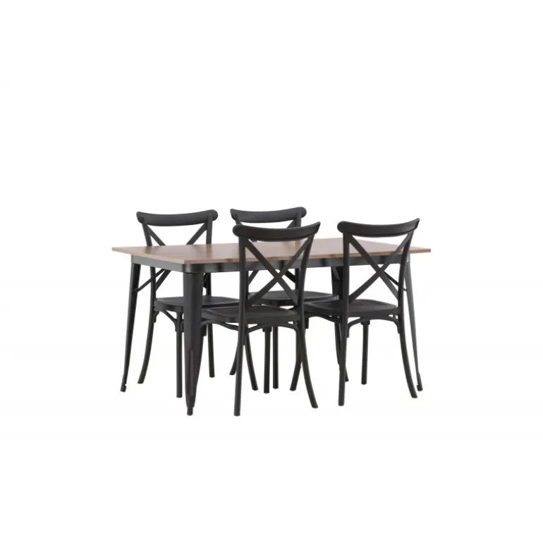 En Spisebordssæt, der kombinerer klassisk design og moderne former! Spisebordet fra Tempe-serien tilhører Venture Home kollektionen og har et iøjnefaldende, skandinavisk design. Lavet med en firkantet bordplade i sort MDF og bordben i sort metal. Sammen med spisebordsstole fra Crosett-serien. Stolene har et nostalgisk design med krydset ryg og lige linjer, konsekvent lavet af sort plastik. Her får du en stilfuld Spisebordssæt til at indrette dit hjem med!