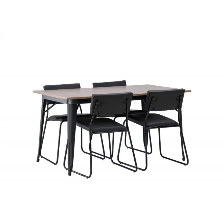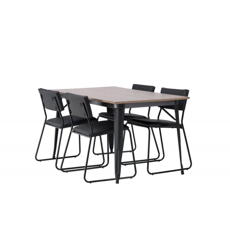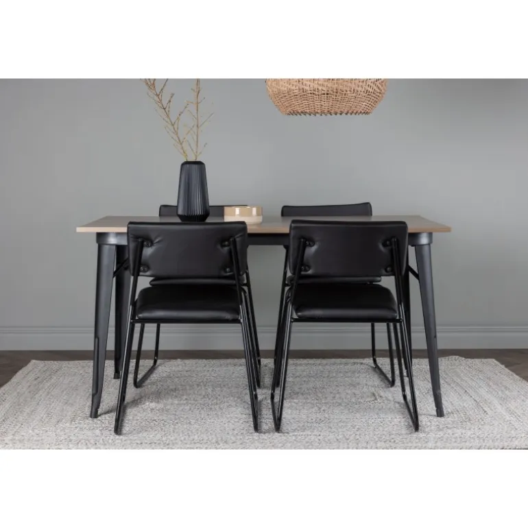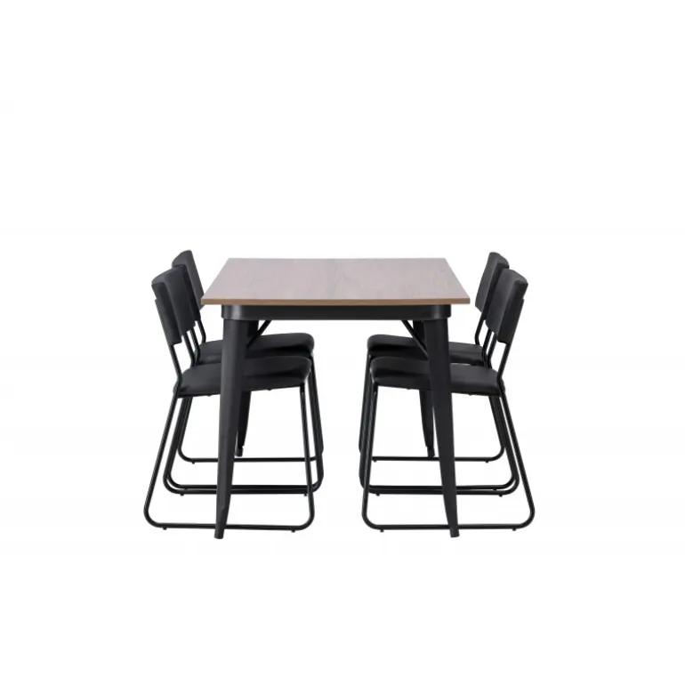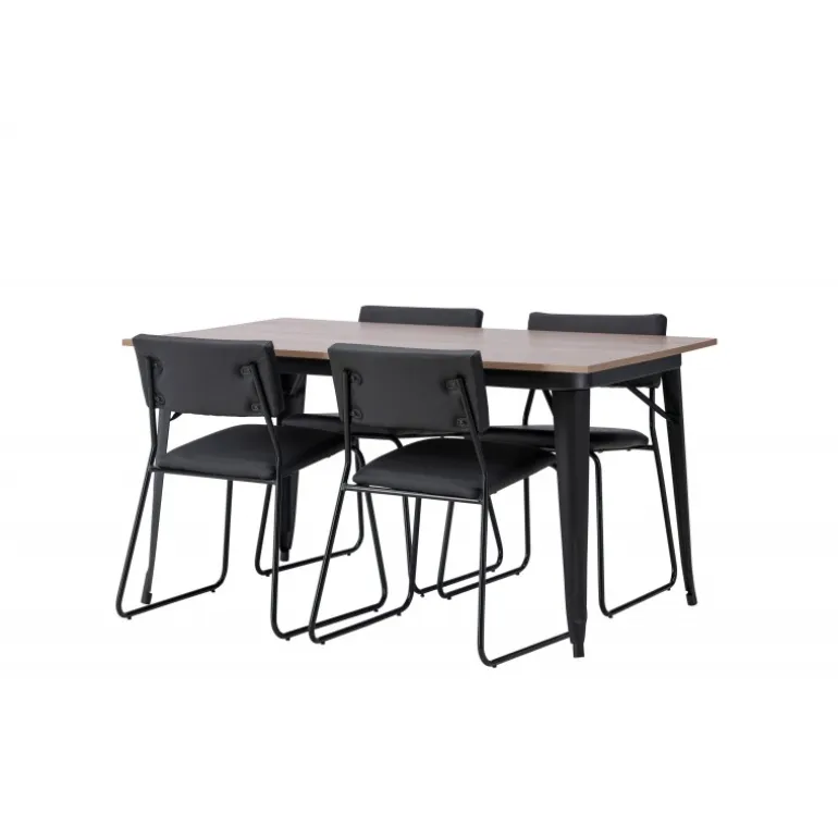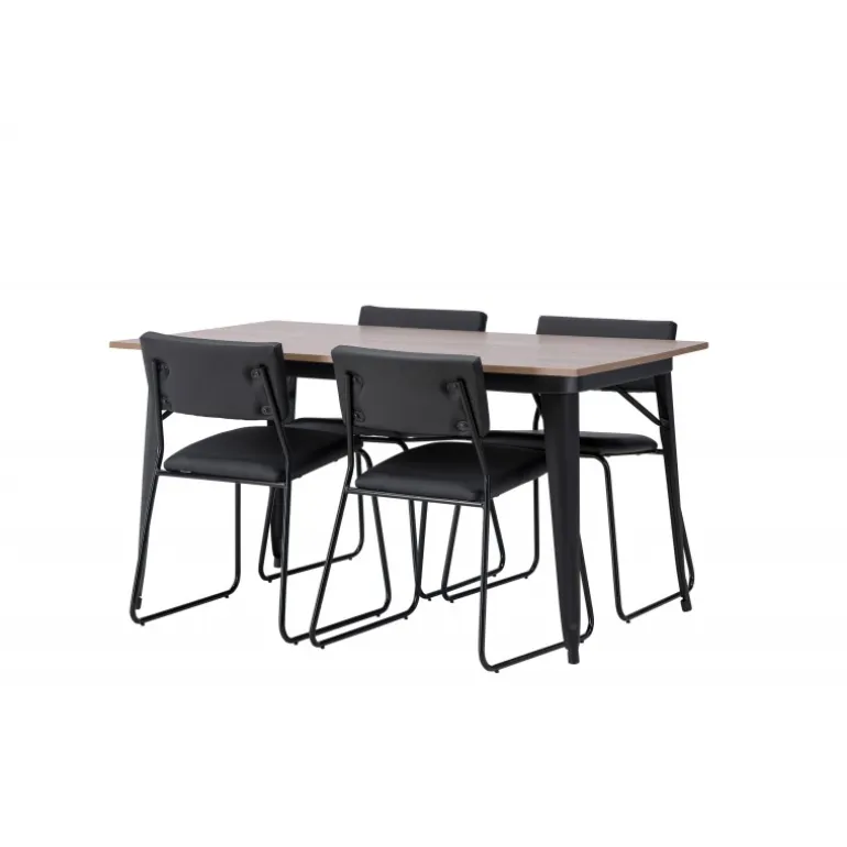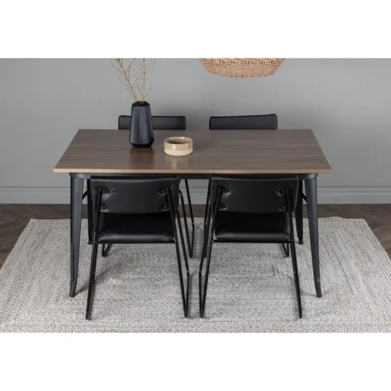 En charmerende kombination af minimalistiske former og skandinavisk design! Spisebordet fra Tempe-serien har et stilfuldt, skandinavisk design. Lavet med en kvadratisk bordplade i valnød-farvet MDF og bordben i sort metal. Her sammen med vores sorte spisebordsstole fra Kenth-serien. Det minimalistiske, moderne design skaber en luftig følelse. Stolen har ryg og sæde i sort polyurethanlæder og polyester samt dekorative smalle ben i jern. Inviter dine kære til mange sociale stunder fremover! Bordmål: 140×80 cm.