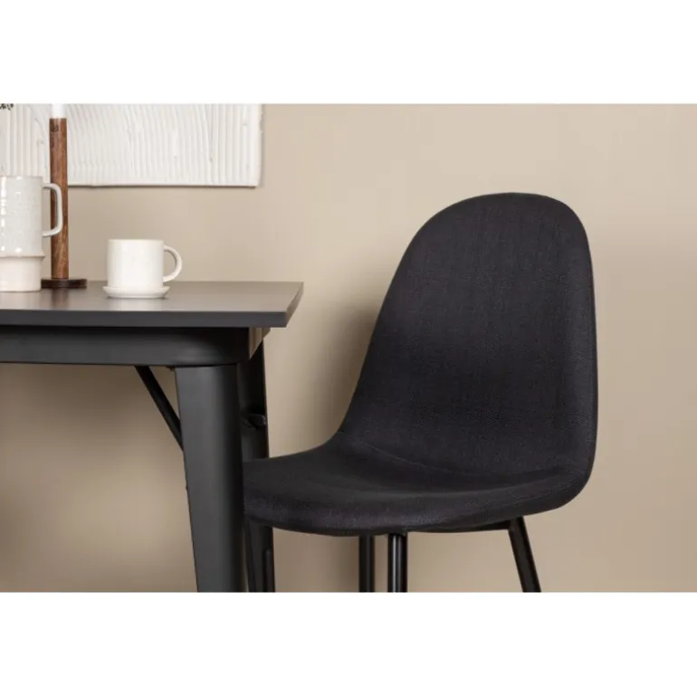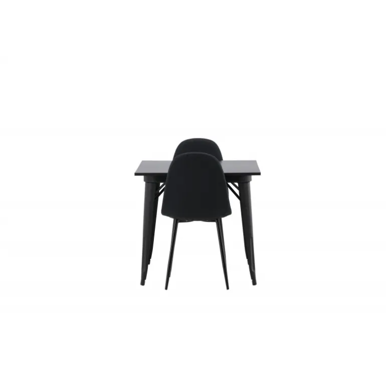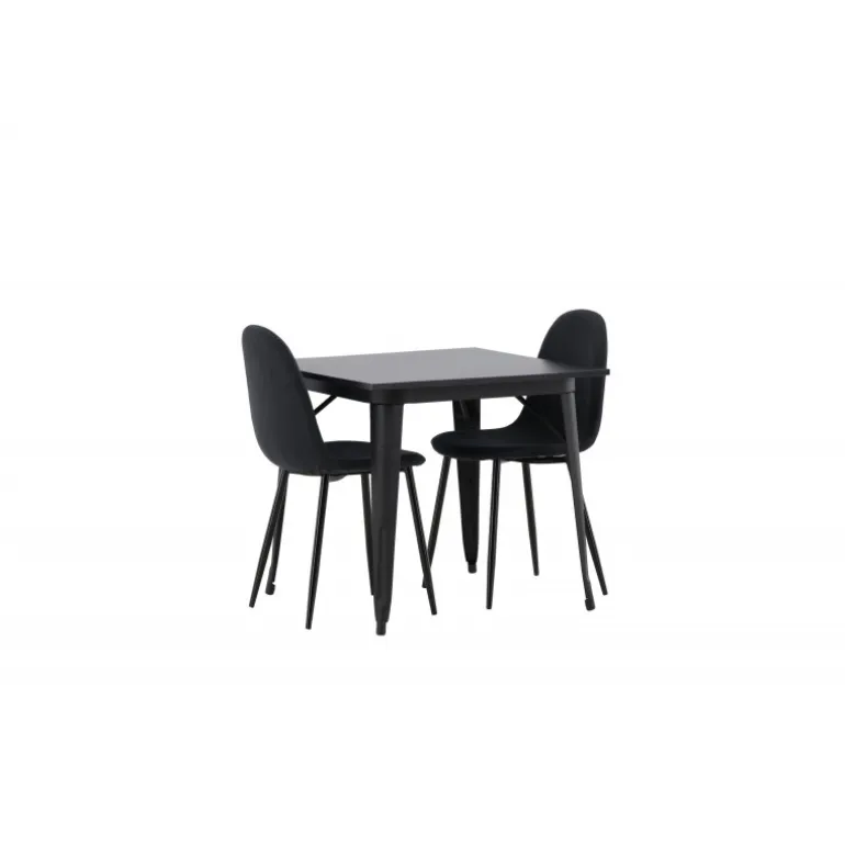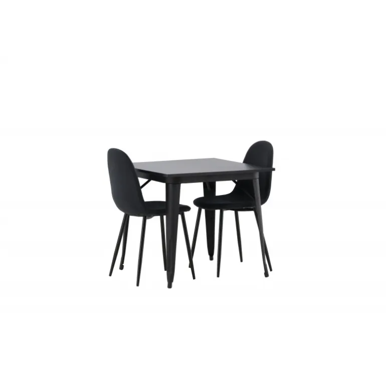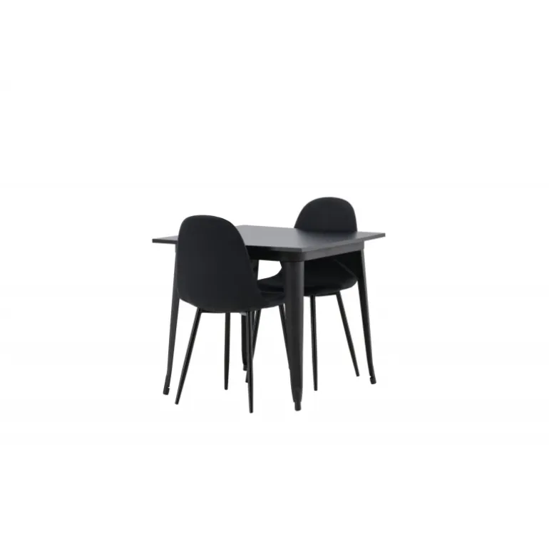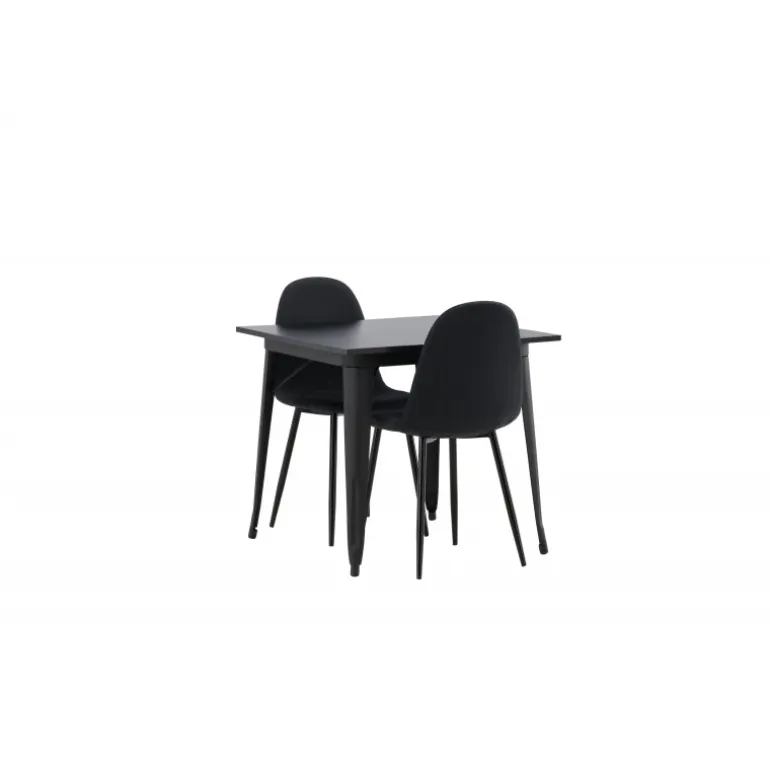 Et charmerende Spisebordssæt til to – perfekt til det lille køkken! Dette spisebord fra Tempe-serien har et klassisk, firkantet design og en tidløs sort farve. Bordpladen er i sort MDF og bordbenene i sort metal. Her i en smagfuld kombination med to spisebordsstole fra Polar-serien i en sodet, sort nuance. Stolen har et fuldt polstret design med en afrundet ryg og sæde i sort polyesterstof med blød polstring og ben i sort pulverlakeret metal. Undgå kompromiser mellem komfort og design!