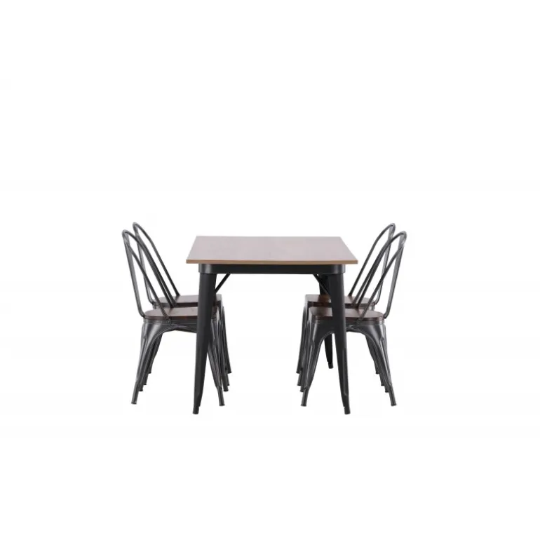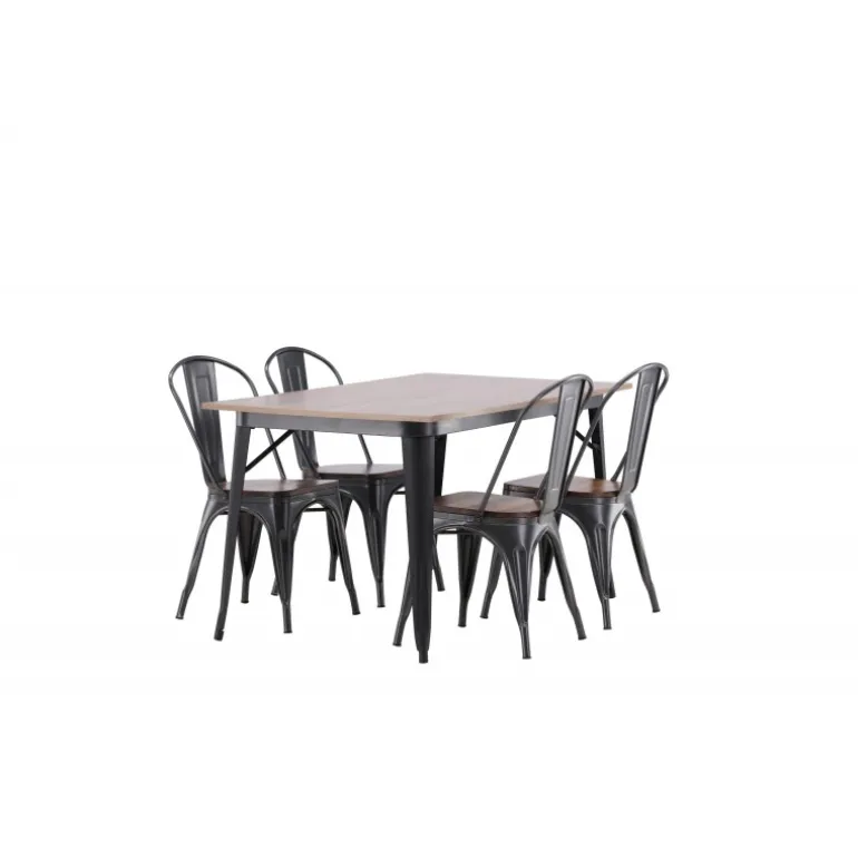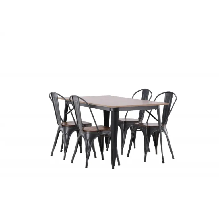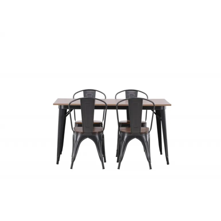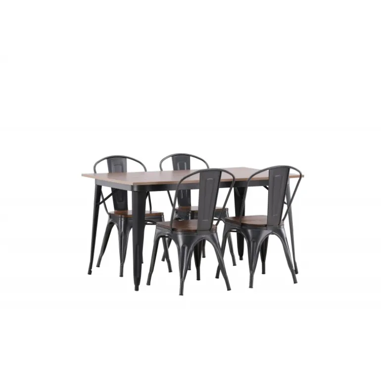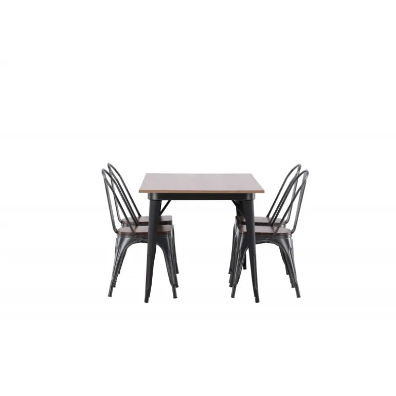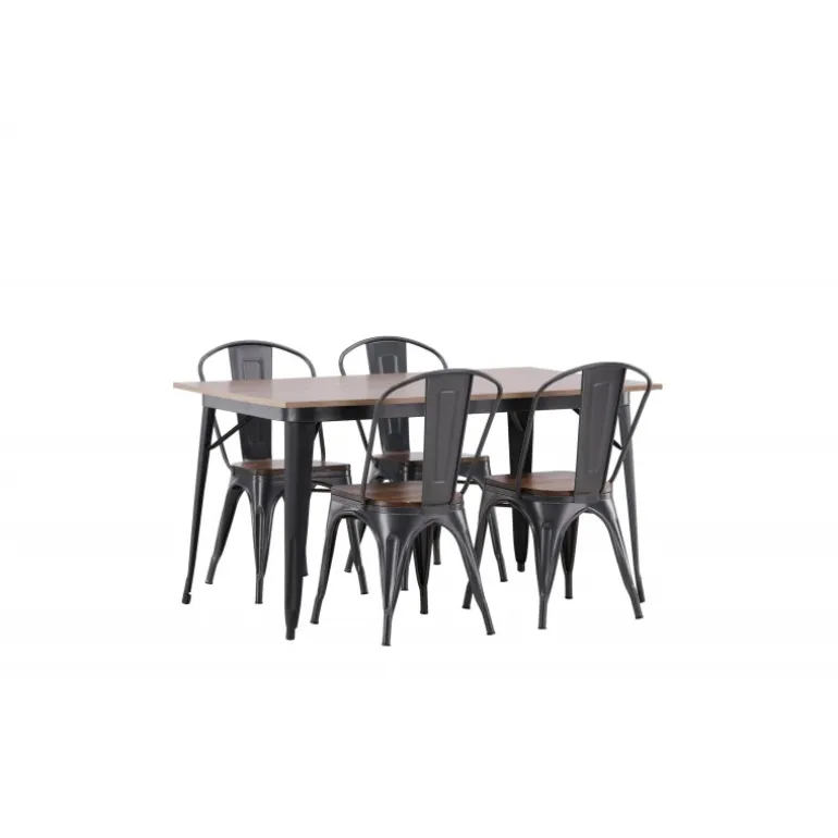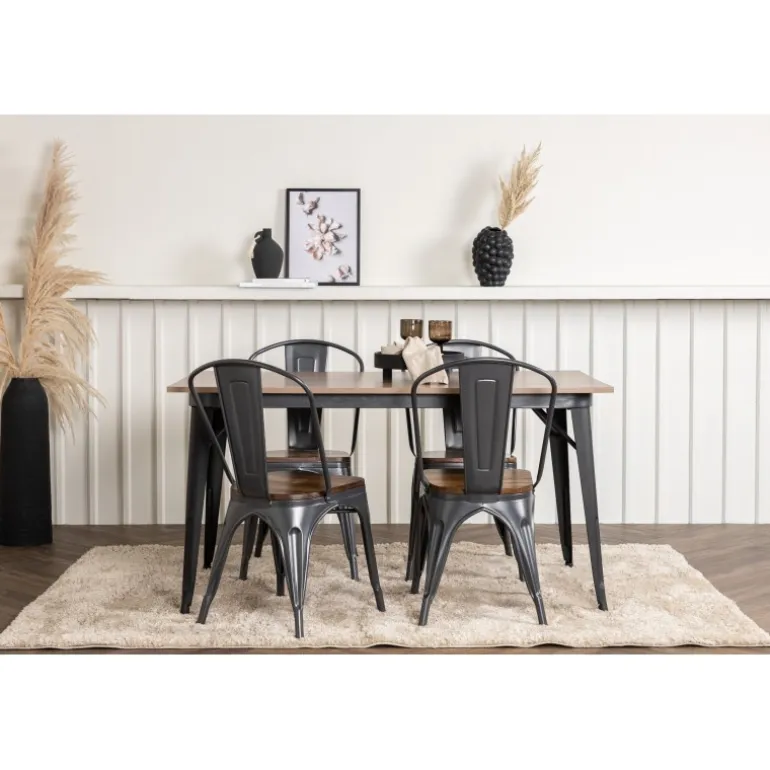 Skab et matchende blikfang i det moderne køkken med et Spisebordssæt fra Tempe-serien! Spisebordet fra Tempe-serien tilhører Venture Home-kollektionen og har et iøjnefaldende, skandinavisk design. Lavet med en kvadratisk bordplade i sort MDF og bordben i sort metal. Her sammen med spiseborde fra samme serie. Stolen tilhører Venture Home-kollektionen og har et klassisk design af en rustik stol med let udadrettede ben i mørkegråt stål og et sæde i mørkt træ. Indret smart og stilfuldt!