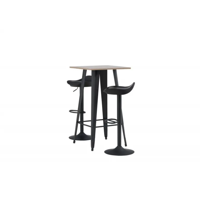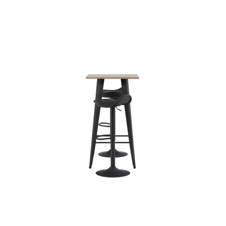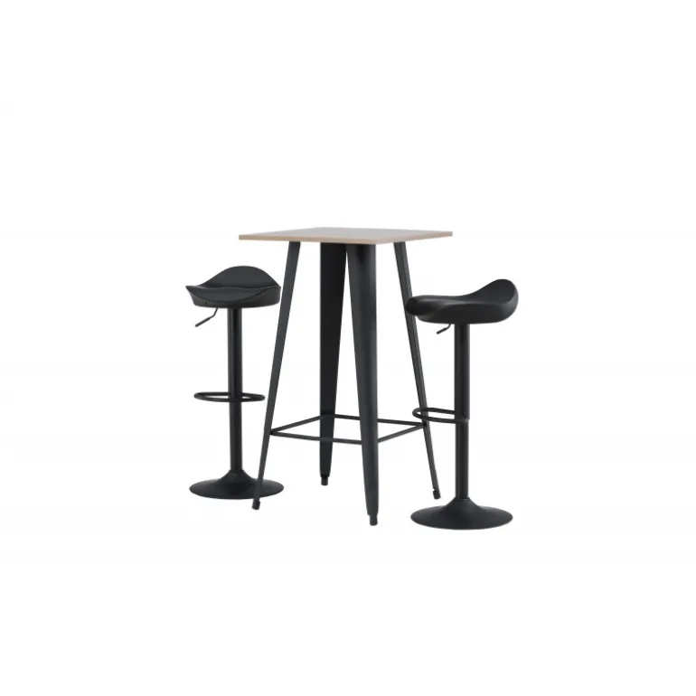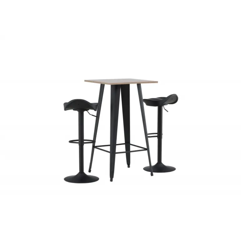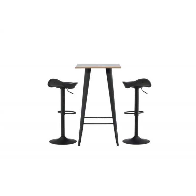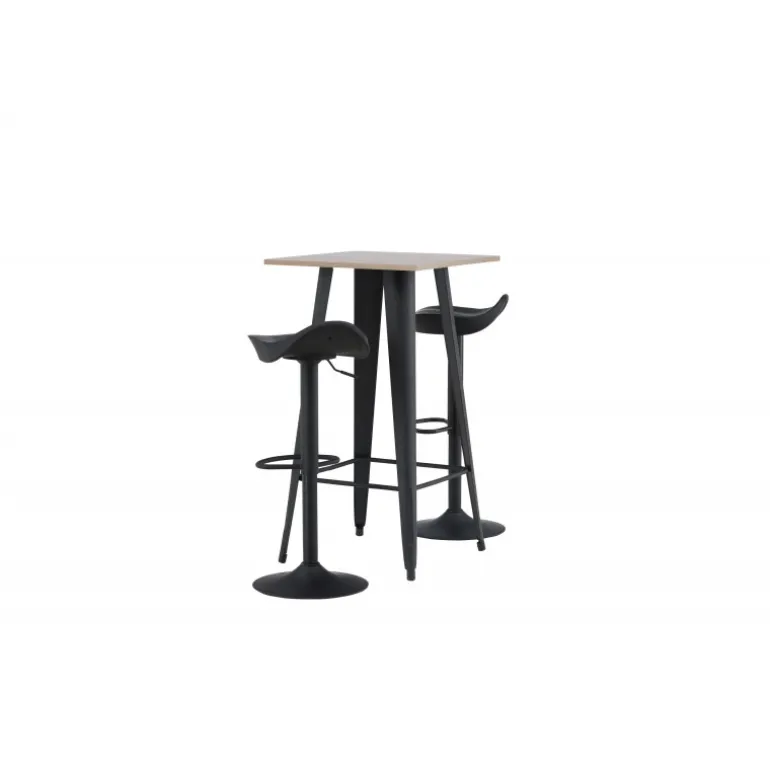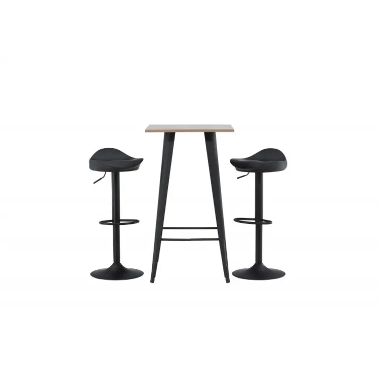 Et moderne spisestue sæt bestående af 2 barstole fra Adesto-serien og et dejligt barbord fra Tempe-serien. Dette barsæt passer perfekt i den mindre køkken. Adesto barstolene har et stilfuldt design, der aldrig går af mode, med en trompetfod i sort stål og en enkel sæde i sort plastik. Her er stolen kombineret med Tempe barbord i minimalistisk størrelse med kvadratisk bordplade i valnøddefarvet MDF og let skrånende bordben i sort metal. Dette barsæt er både nyttigt og praktisk og forlænger de fælles øjeblikke i hjemmets hjerte!