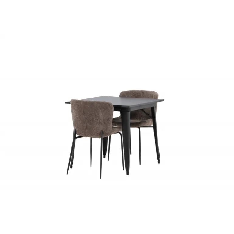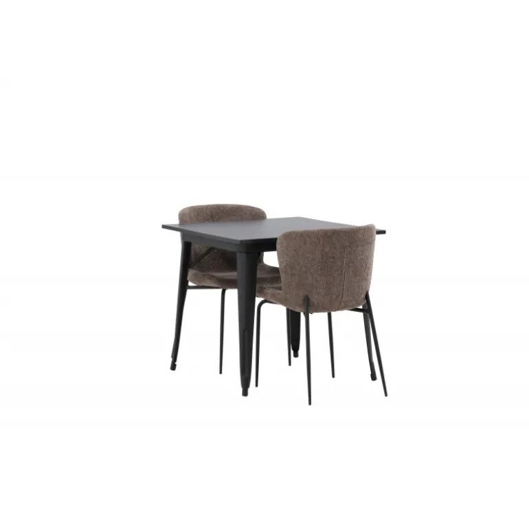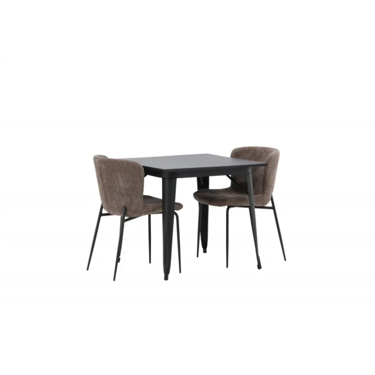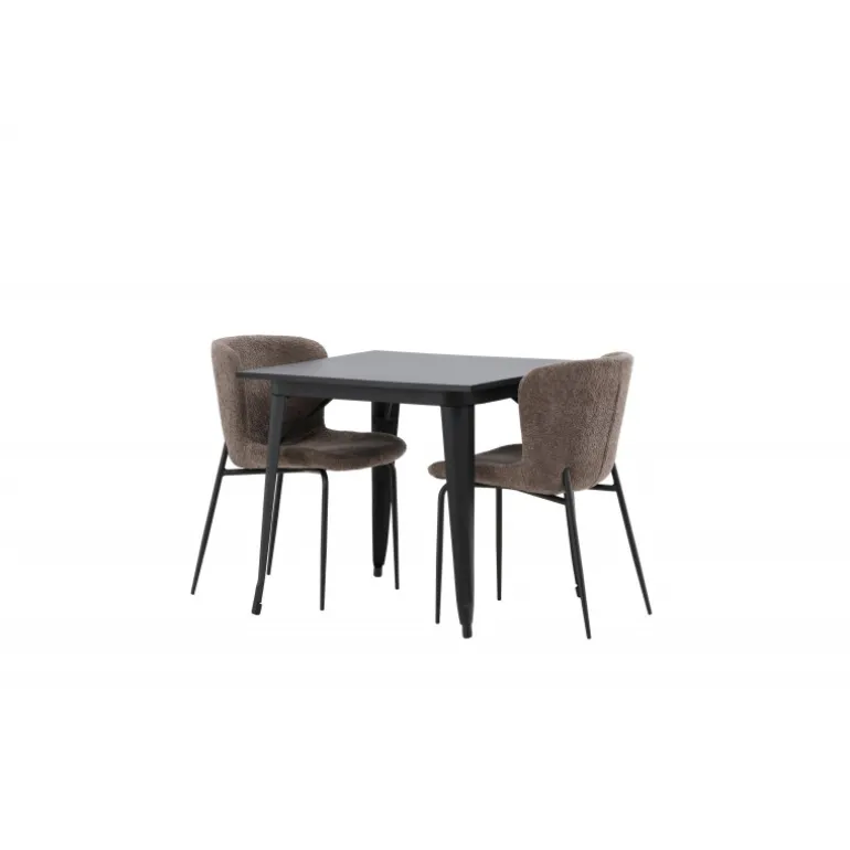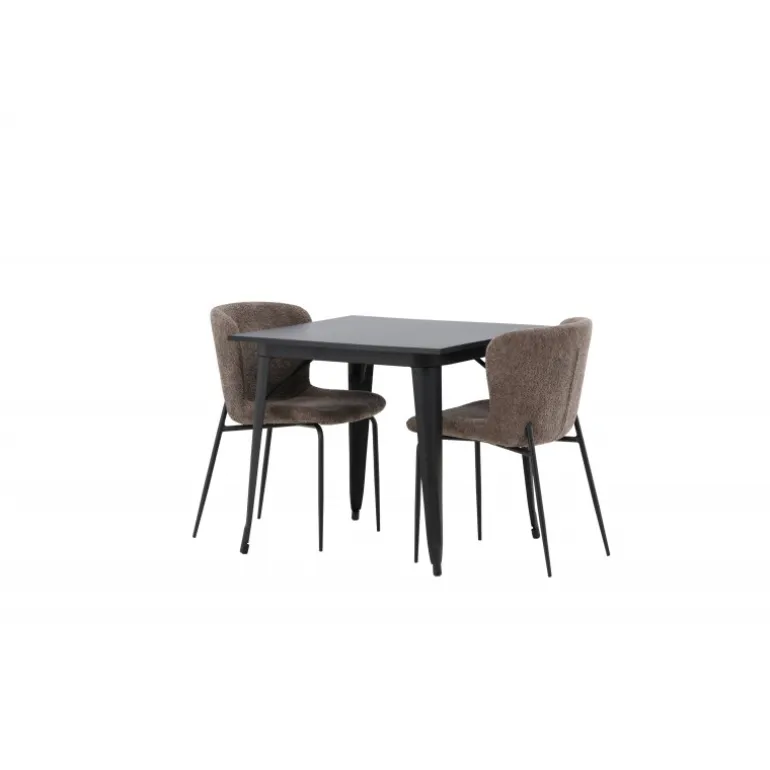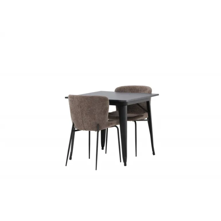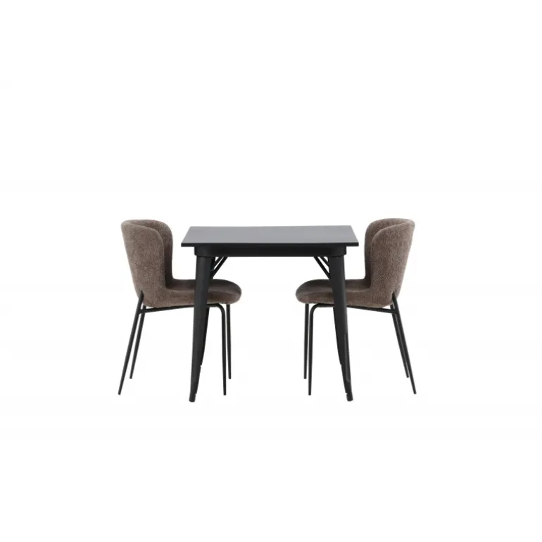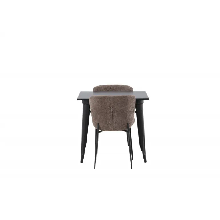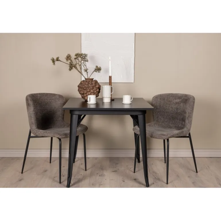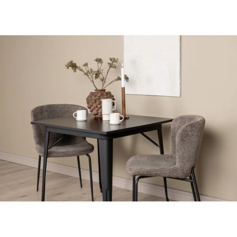 Et moderne og charmerende spisestuesæt – indret dit hjem smart og stilfuldt! Dette spisebord fra Tempe-serien har et klassisk, kvadratisk design og en tidløs sort farve. Bordpladen er i sort MDF og benene i sort metal. Her i perfekt kombination med vores komfortable spisebordsstole fra Modesto-serien i skandinavisk design. Stolen er fuldt polstret i gråt bouclé stof med stilfulde, smalle ben i sort metal. Den let afrundede ryg og polstrede sædehynde giver ekstra komfort og gør måltiderne omkring spisebordet endnu mere behagelige. Det skal føles godt at sidde ned til et dejligt måltid!