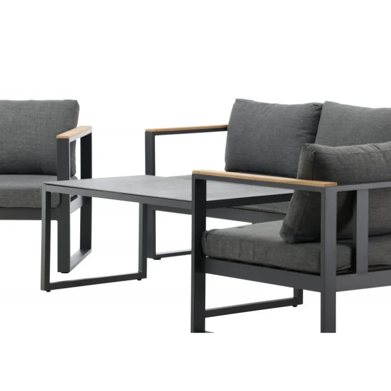 Modern stilfuldt sofasæt, der passer perfekt på din terrasse. Sofasættet består af en tre-personers sofa, inklusive mordpuder, samt et lavt sofabord med en sprayfarvet glasplade. Køb matchende lænestole i samme serie. Lavet af sort pulverlakeret metal med stilfulde detaljer i teak.