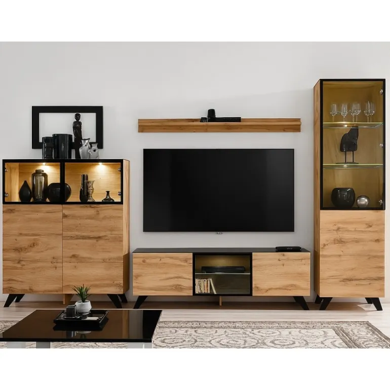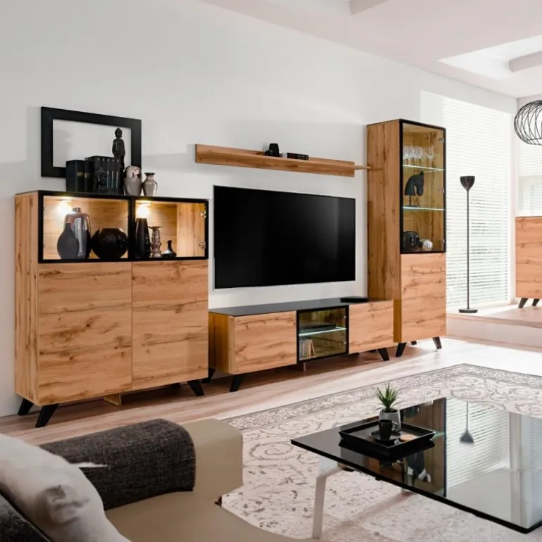 Den komplette løsning består af høj vitrine, lav vitrine, TV-bord og væghylde – alt sammen i et stilrent og harmonisk design. Alle låger åbnes nemt med push-click system, og vitrinernes glashylder fremhæves af integreret LED-belysning, som skaber en varm og hyggelig atmosfære i stuen.