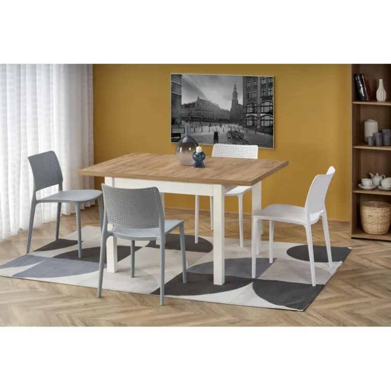 Oplev elegance og funktionalitet med TIAGO SQUARE Spisebord med udtræk i craft eg og hvid. Dette alsidige bord er perfekt til både små og store rum, takket være dets justerbare længde fra 90 cm til 125 cm. Fremstillet af holdbart lamineret spånplade og lamineret MDF, er dette bord både robust og stilfuldt. Den smukke craft eg bordplade kombineret med de hvide ben giver et moderne og tidløst udseende, der passer ind i enhver indretning.