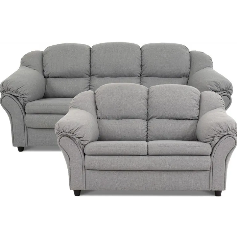 Tønder 3+2 personers sofasæt med god plads til hygge og komfort, betrukket med kraftigt strukturvævet lysegråt tekstil. Tønder er en serie af klassiske sofaer med velpolstrede puder, særligt udformet for optimal støtte og komfort. Sofaerne er bygget i moduler som gør det muligt at udbygge eller mindske sofaen med hjørnedele, chaiselongdele, armlæn og 2 eller 3 pers. sædedele.