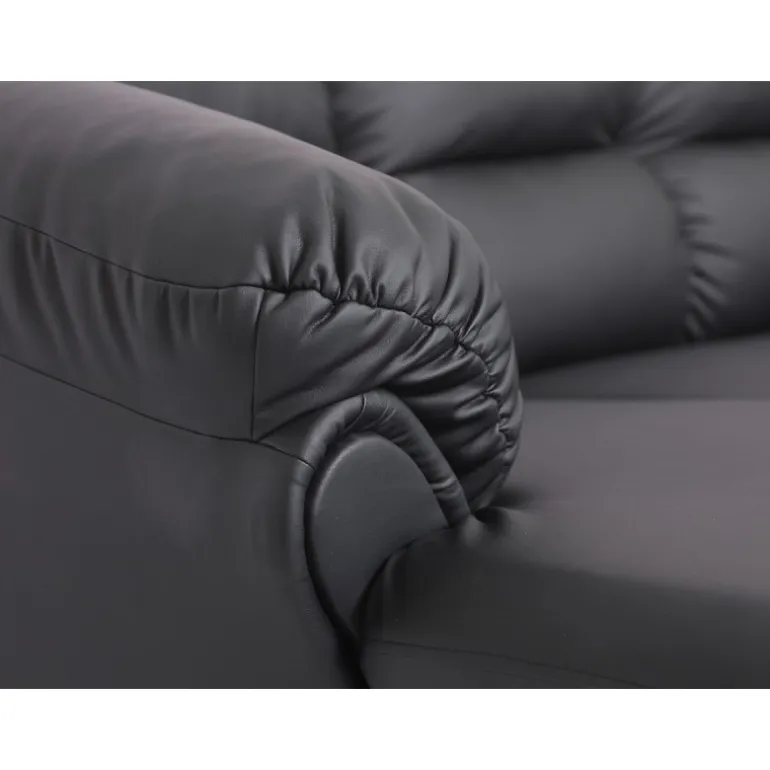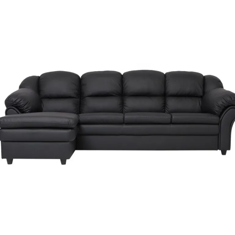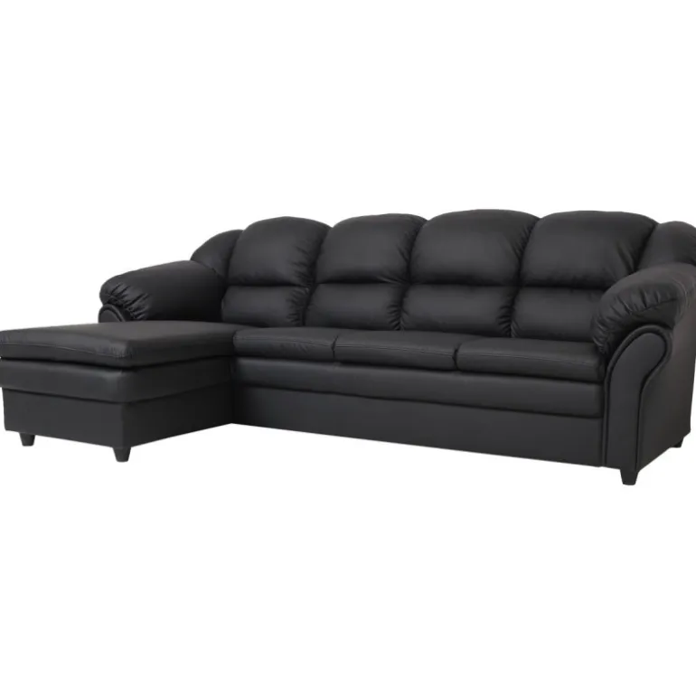 Tønder 4 personers venstrevendt chaiselong sofa med god plads til familien, betrukket med vedligeholdelsesvenligt sort imiteret læder. Tønder er en klassisk serie af sofaer med velpolstrede puder, særligt udformet for optimal støtte og komfort. Sofaerne er bygget i moduler som gør det muligt at udbygge eller mindske sofaen med hjørnedele, chaiselongdele, armlæn og 2 eller 3 pers. sædedele.