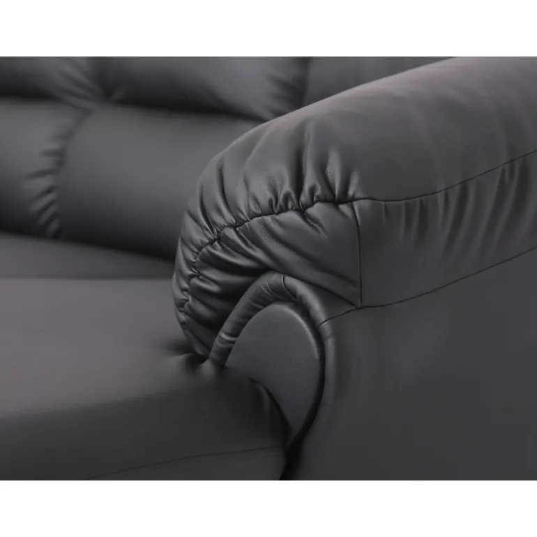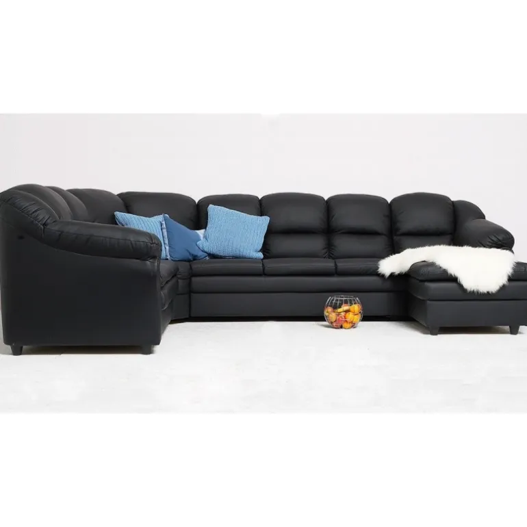 Rummelig hjørnesofa med højrevendt chaiselong og god plads til hele familien, Tønder hjørnesofaen er betrukket med vedligeholdelsesvenligt sort imiteret læder.