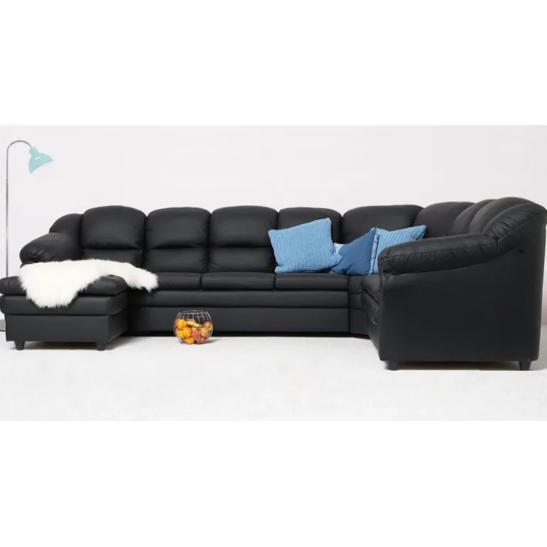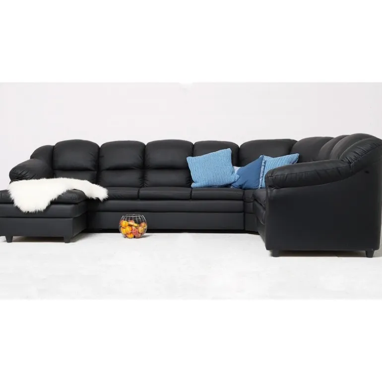 Rummelig hjørnesofa med venstrevendt chaiselong og god plads til hele familien, Tønder hjørnesofaen er betrukket med vedligeholdelsesvenligt sort imiteret læder.