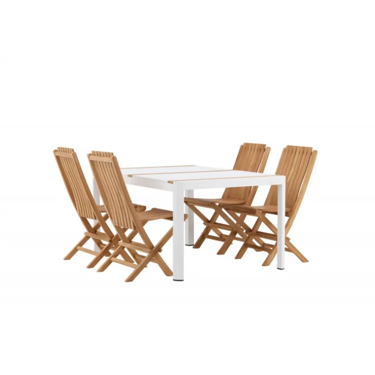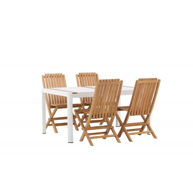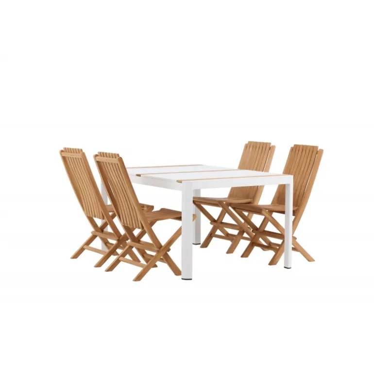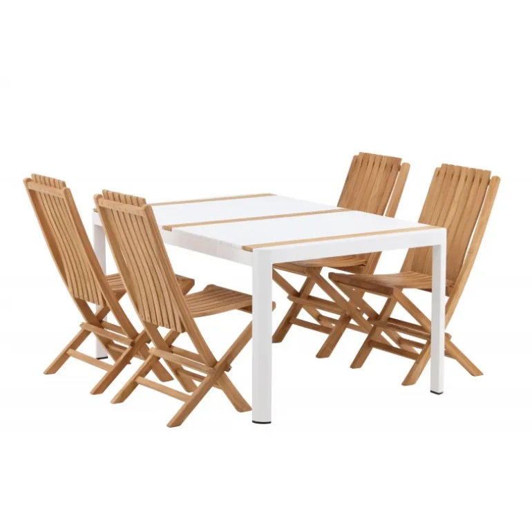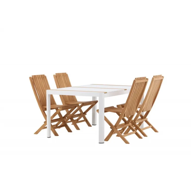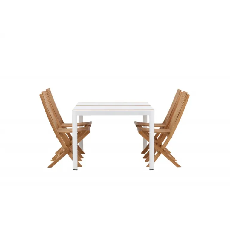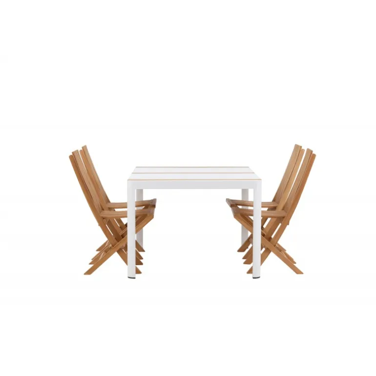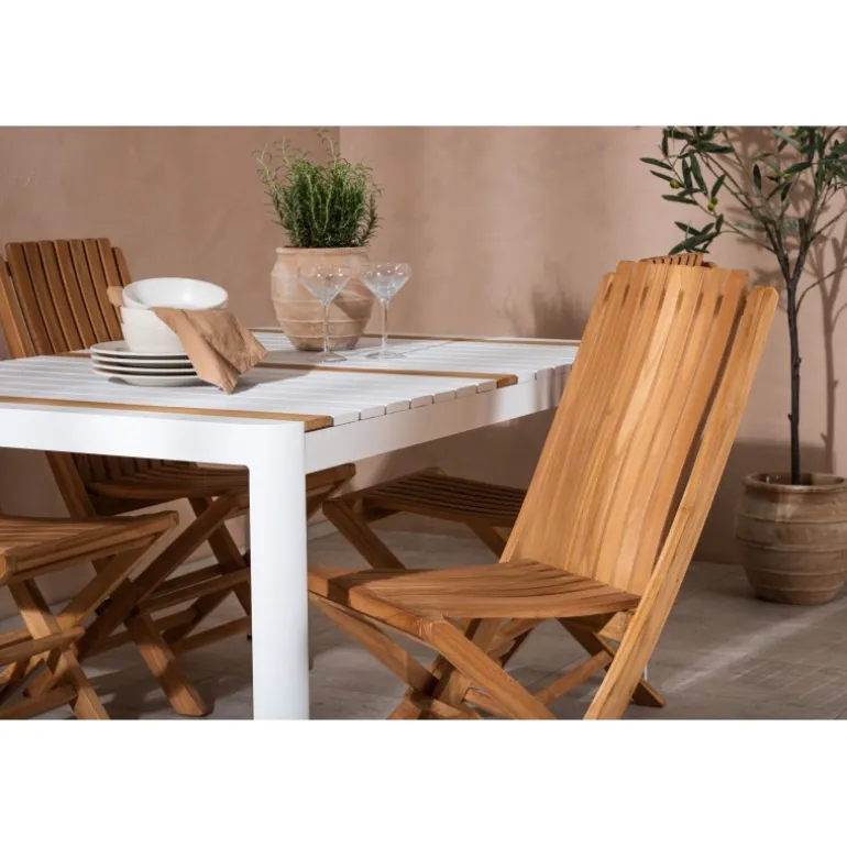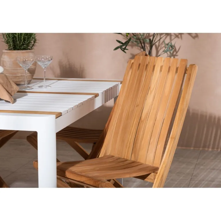 Skab en elegant blikfang, der imponerer – dette Loungesæt – Havemøbelsæt er lige så iøjnefaldende som det er holdbart! Spisebordet Togo har en smagfuld udformning med en rektangulær bordplade i hvid og træfarvet teak og et hvidt aluminiumsstel. De lækre teakdetaljer i bordpladen gør bordet perfekt matchende med spisebænkene fra Ghana-serien. Stolene er sammenklappelige og lavet af smagfuld teak i et ribbet design, der giver et meget moderne indtryk. Lad tiden her være dagens højdepunkt!