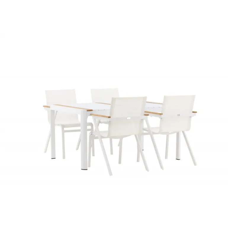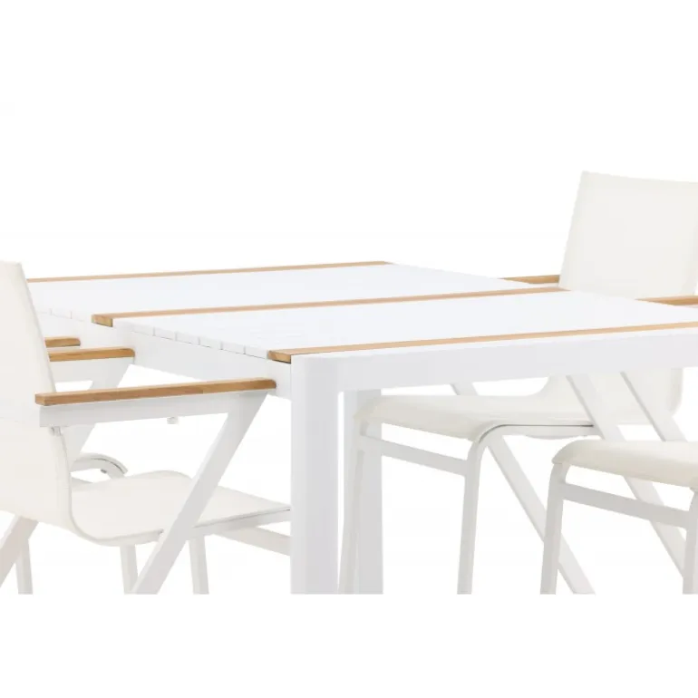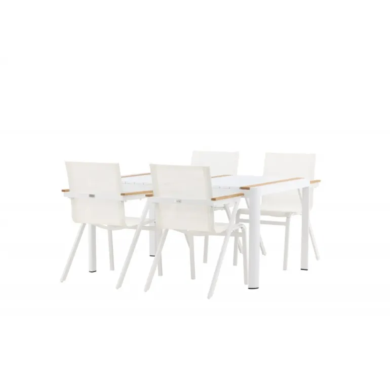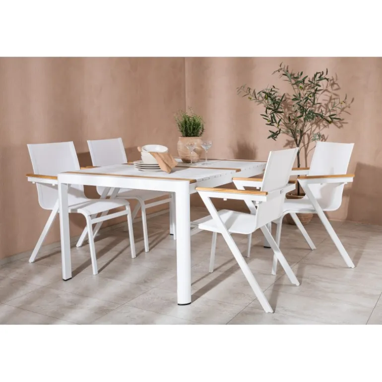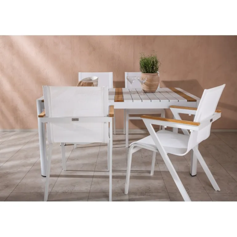 Skab et trendsikkert blikfang, der imponerer – dette Loungesæt – Havemøbelsæt er lige så iøjnefaldende som holdbart! Spisebordet Togo har en smagfuld udformning med en rektangulær bordplade i hvid og træfarvet teak og et hvidt aluminiumstel. Dimensioner: 150x100cm. Her i en smart kombination med spisebordsstolene fra serien Mexico i skandinavisk design. Fremstillet af hvidt aluminium med sæde i tekstil og armlæn i dekorativ teak, som vil være en flot, matchende detalje. Stolen er stabelbar for nem opbevaring. Her kan du sidde længe og nyde sommeraftenerne!
