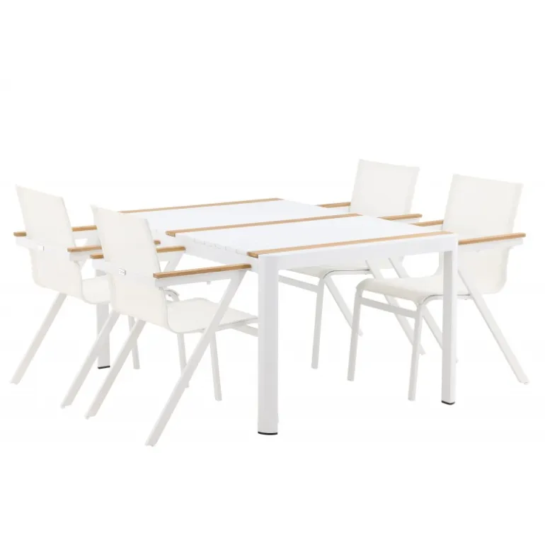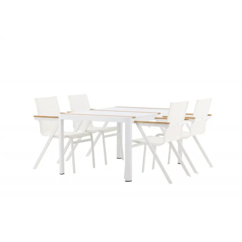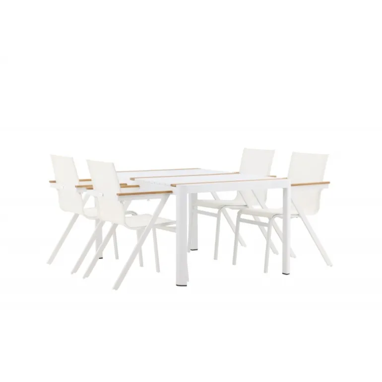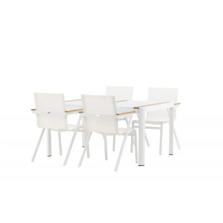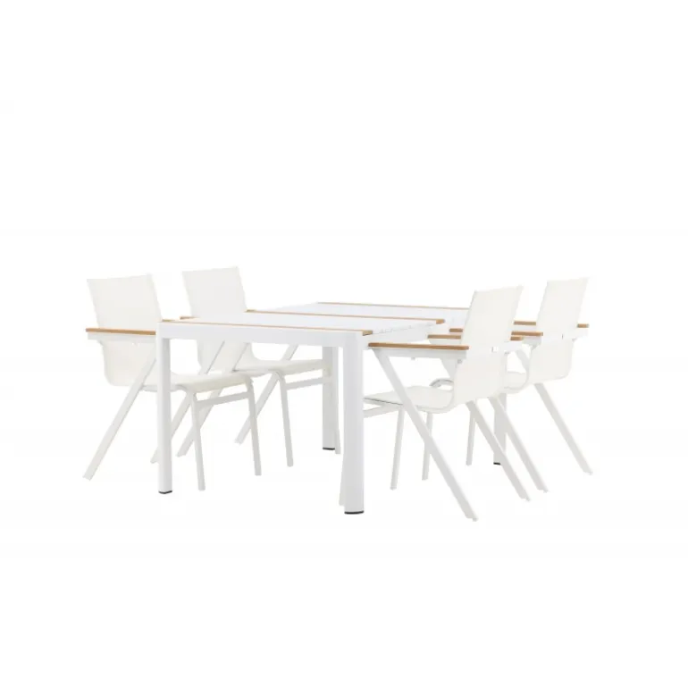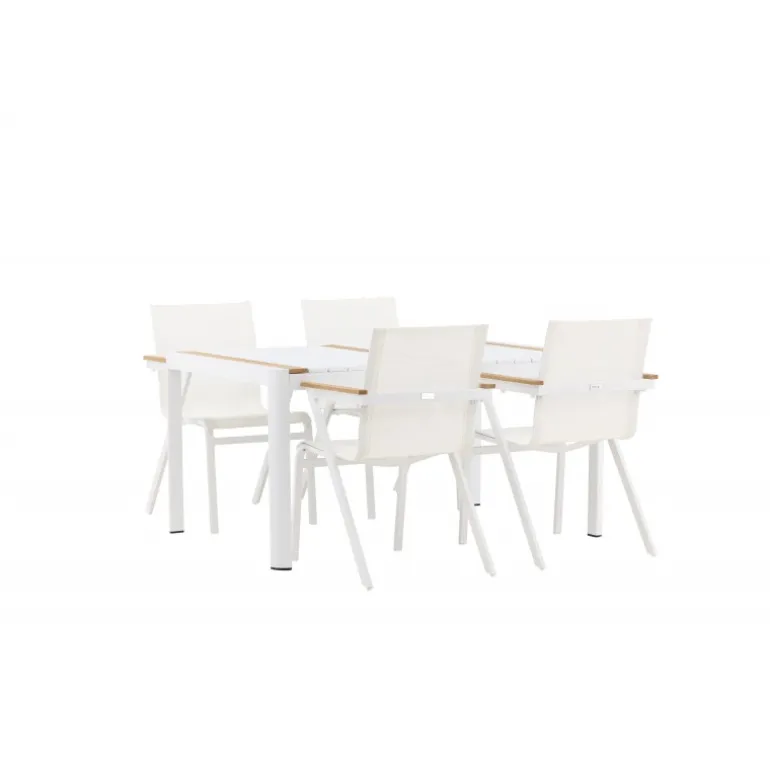 Skab et trendsikkert blikfang, der imponerer – dette Loungesæt – Havemøbelsæt er lige så iøjnefaldende som holdbart! Spisebordet Togo har en smagfuld udformning med en rektangulær bordplade i hvid og træfarvet teak og et hvidt aluminiumstel. Dimensioner: 150x100cm. Her i en smart kombination med spisebordsstolene fra serien Mexico i skandinavisk design. Fremstillet af hvidt aluminium med sæde i tekstil og armlæn i dekorativ teak, som vil være en flot, matchende detalje. Stolen er stabelbar for nem opbevaring. Her kan du sidde længe og nyde sommeraftenerne!