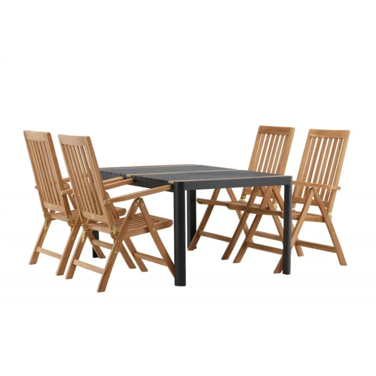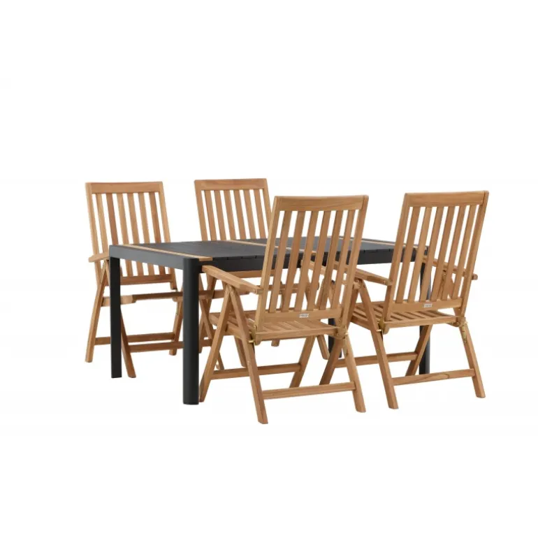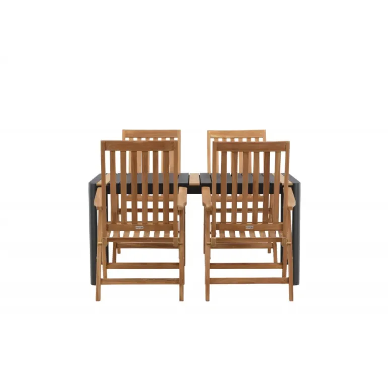 Skab en blikfang, der imponerer – dette Loungesæt – Havemøbelsæt er lige så iøjnefaldende som det er holdbart! Togo spisebord har en elegant udformning med en rektangulær bordplade i sort og teakfarvet træ og et understel i sort aluminium. De lækre teakelementer i bordpladen gør, at bordet passer perfekt sammen med spisestolene fra Kenya-serien. Stolene er foldbare og har armlæn for ekstra komfort. Lavet af smagfuld teak i et ribbet design, der giver et meget moderne indtryk. Lad tiden her være dagens højdepunkt!