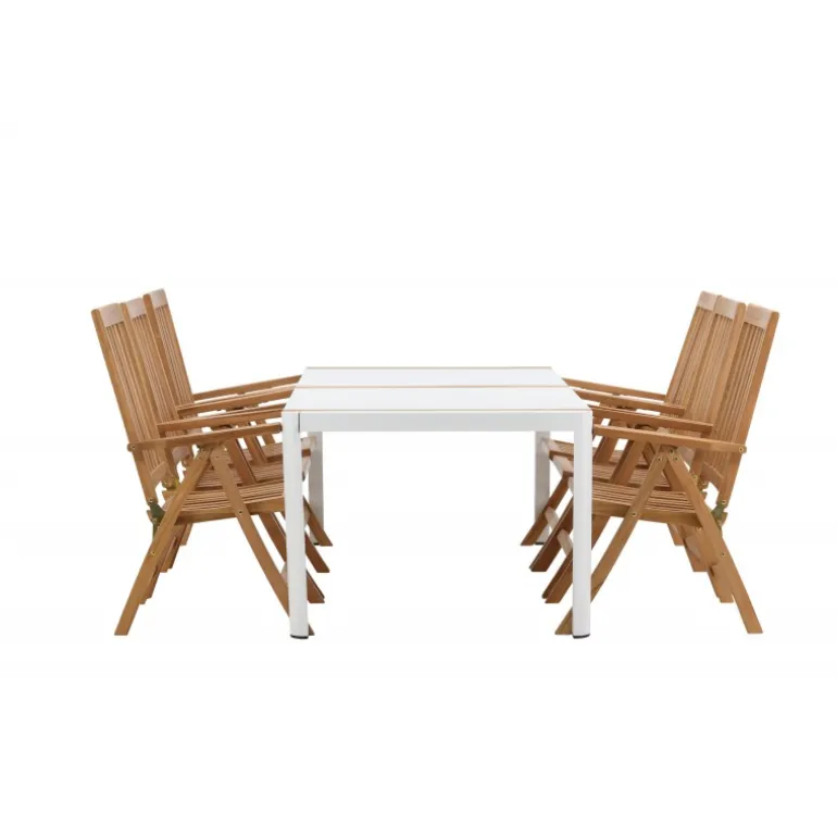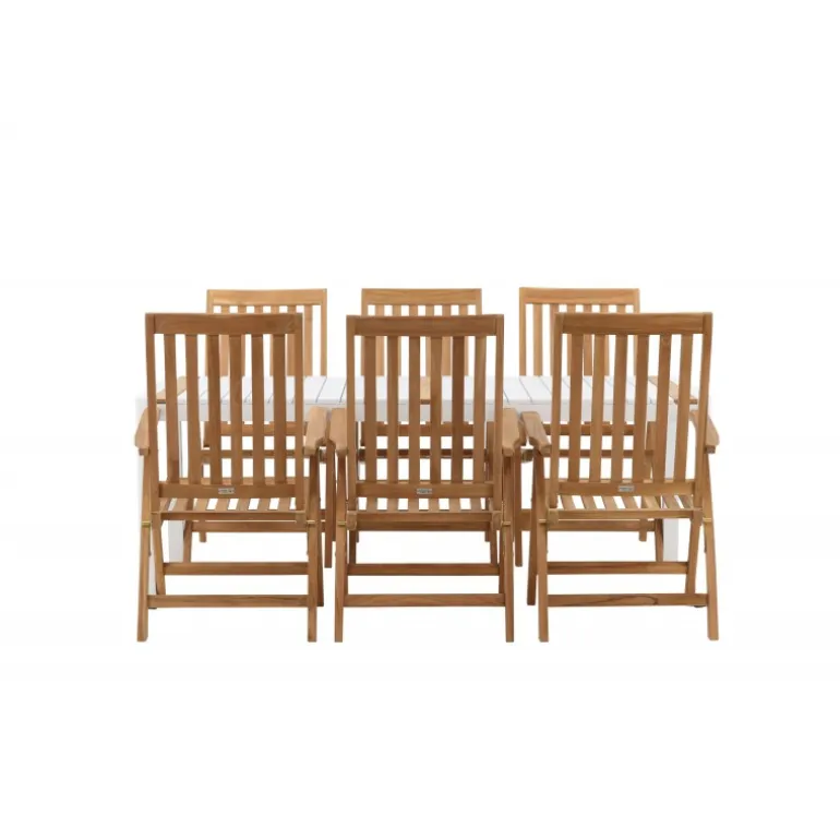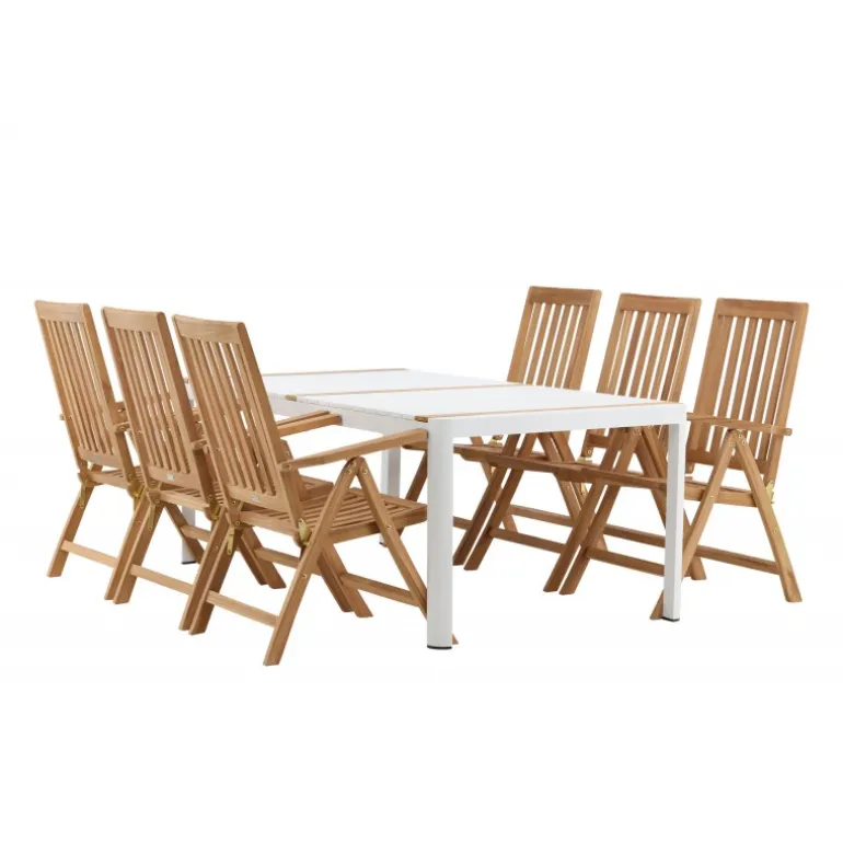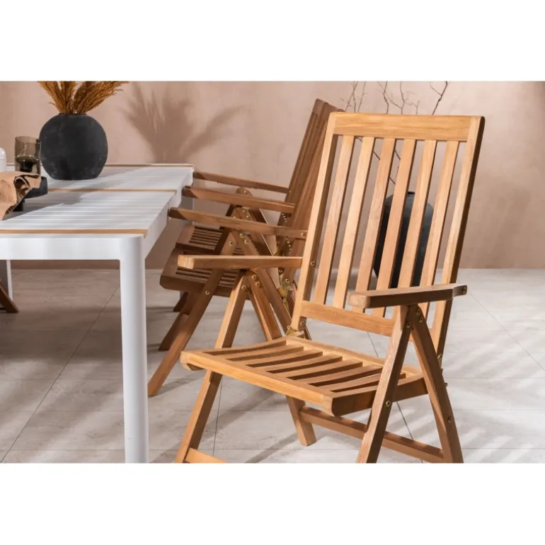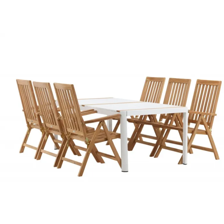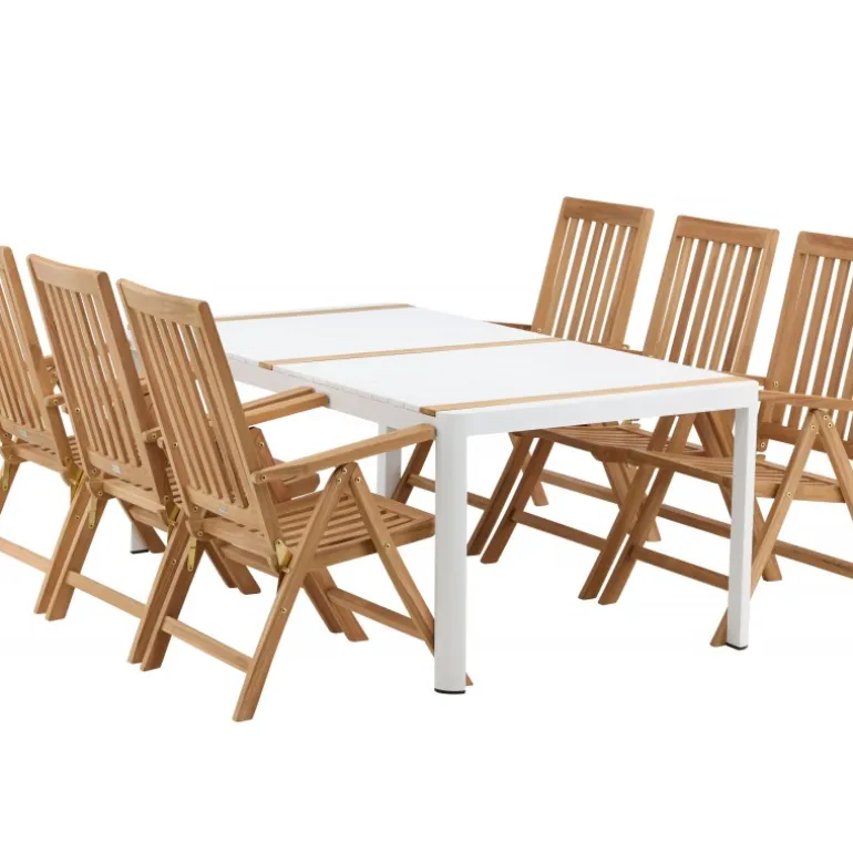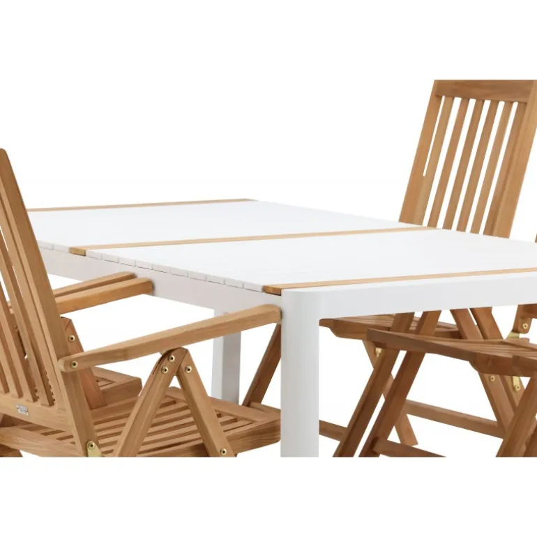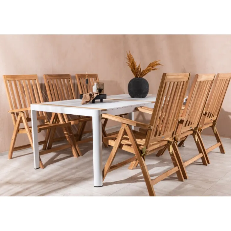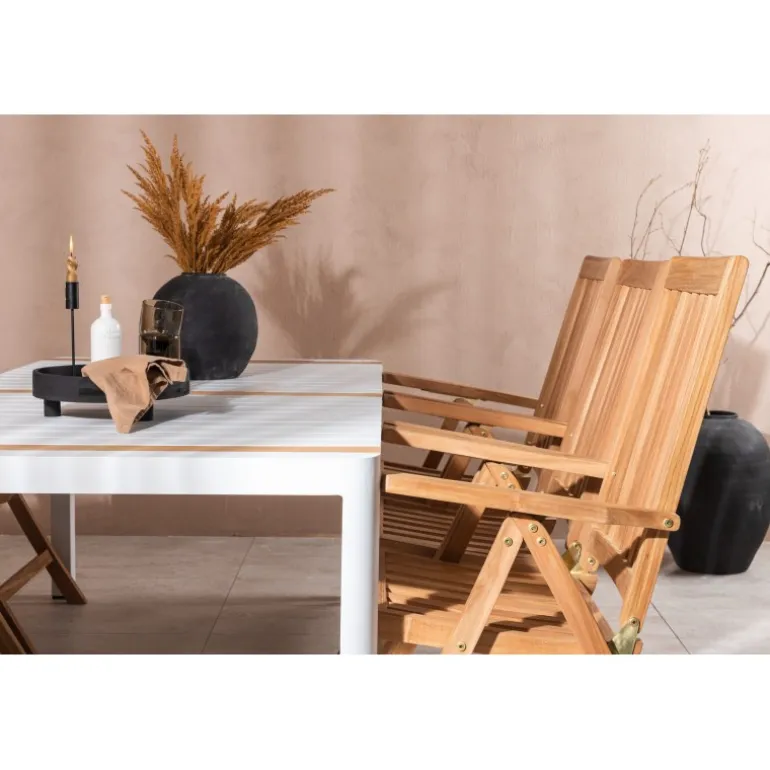 Skab et blikfang, der imponerer – denne Loungesæt – Havemøbelsæt er lige så iøjnefaldende som den er holdbar! Spisebordet Togo har et smagfuldt design med en rektangulær bordplade i hvid og træfarvet teak samt et hvidt aluminiumsstel. Mål: 200×100 cm. De lækre teak-detaljer i bordpladen gør, at bordet matcher perfekt med spisebordsstolene fra Kenya-serien. Stolene er både foldbare og sammenklappelige og har armlæn for ekstra komfort. Fremstillet af smagfuld teak i et ribbet design, der giver et meget moderne indtryk. Lad tiden her blive dagens højdepunkt!