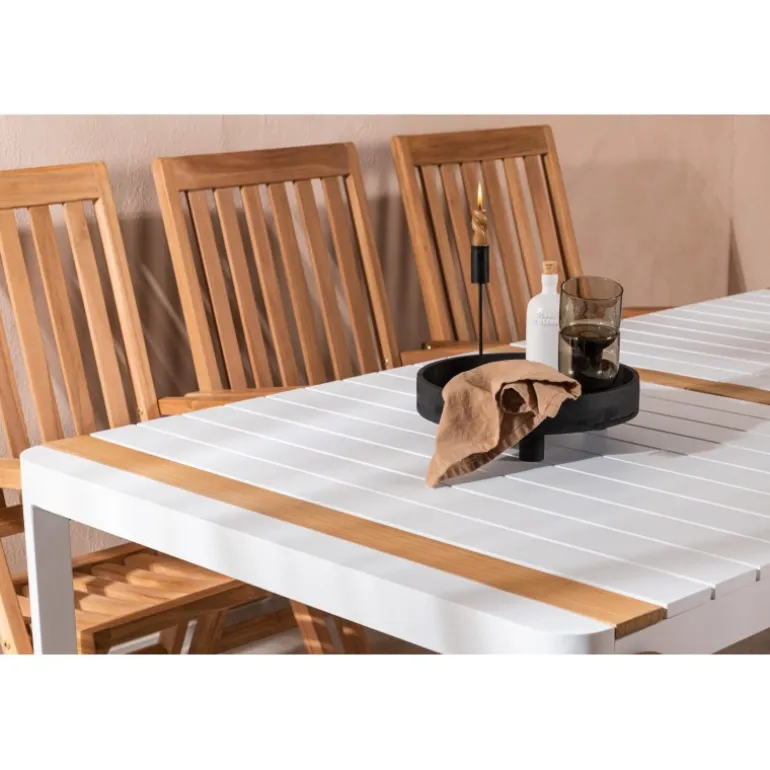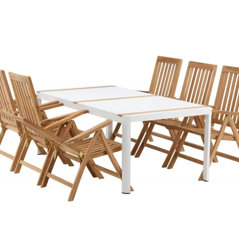 - Rektangulært bordplade: Hvid og træfarvet teak med hvidt aluminiumsstel.
