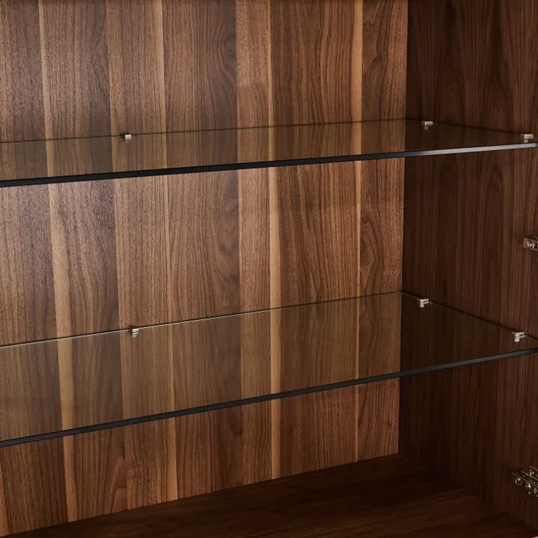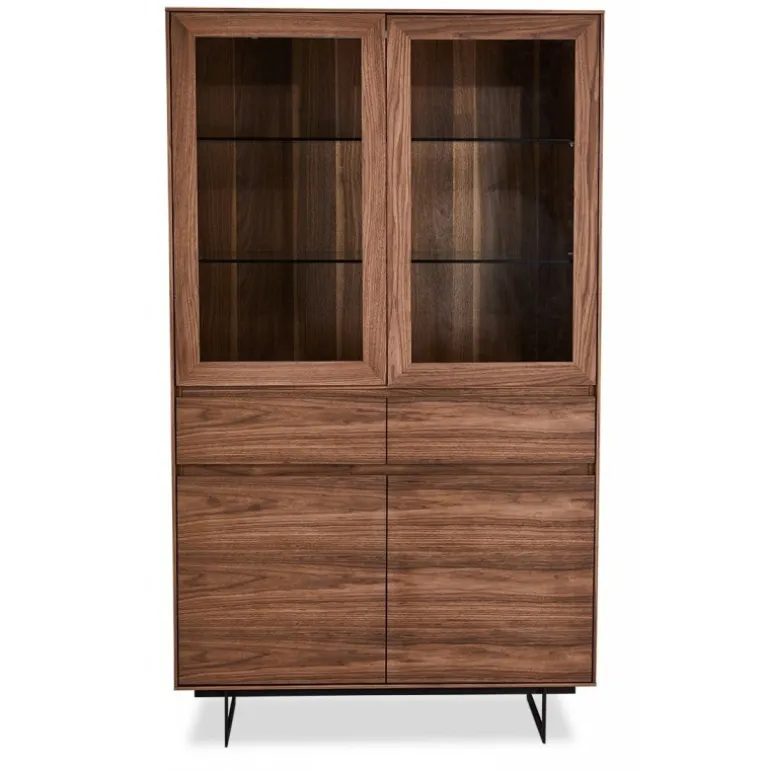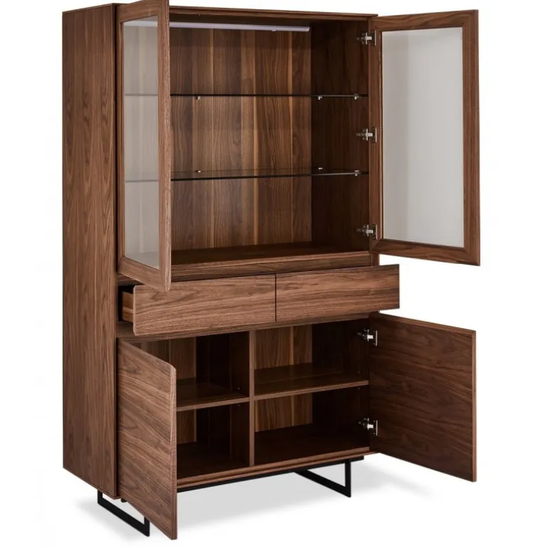 Elegant og funktionelt vitrineskab med korpus i MDF beklædt med amerikansk valnødfiner og sort metalstel. Skabet er udstyret med 2 låger, 2 skuffer samt 3 justerbare hylder (18 mm tykke). Alle låger og skuffer har soft-close system, og det integrerede LED-lys fremhæver indholdet på en smuk og stemningsfuld måde. En moderne og tidløs løsning til stuen eller spisestuen.