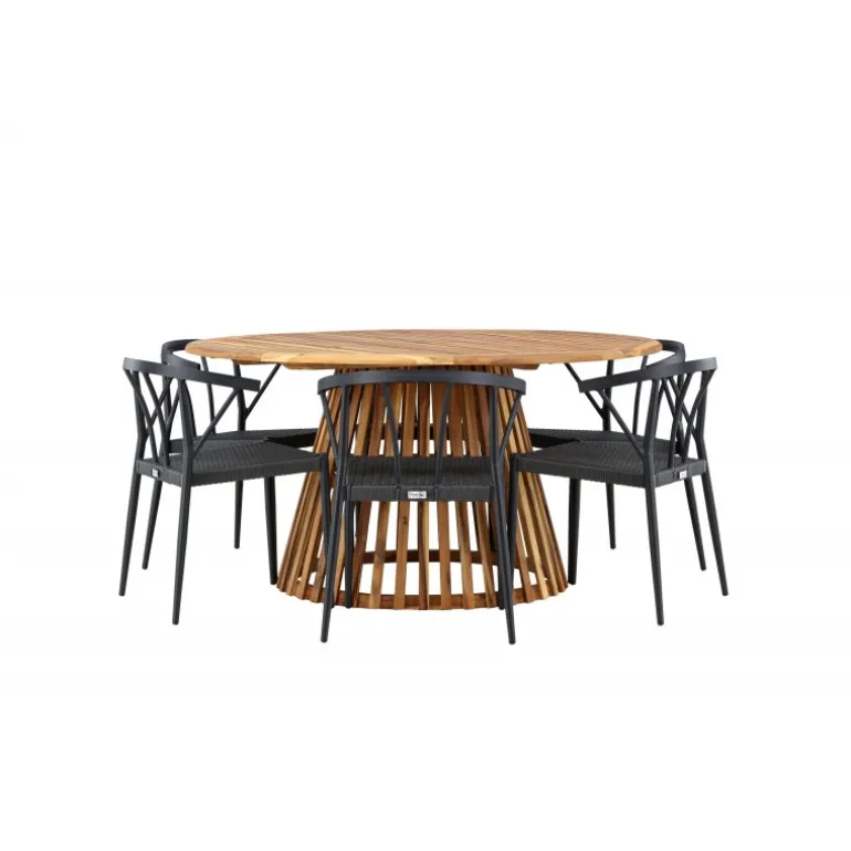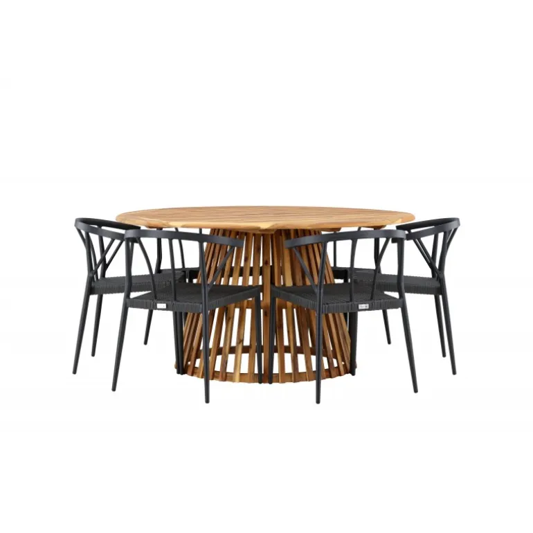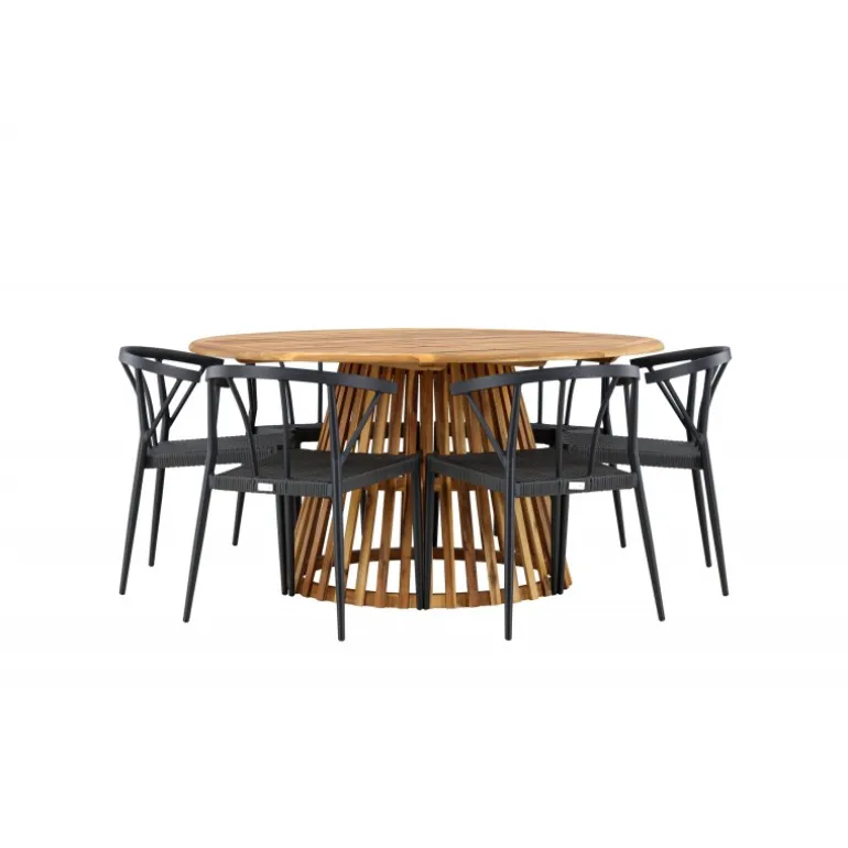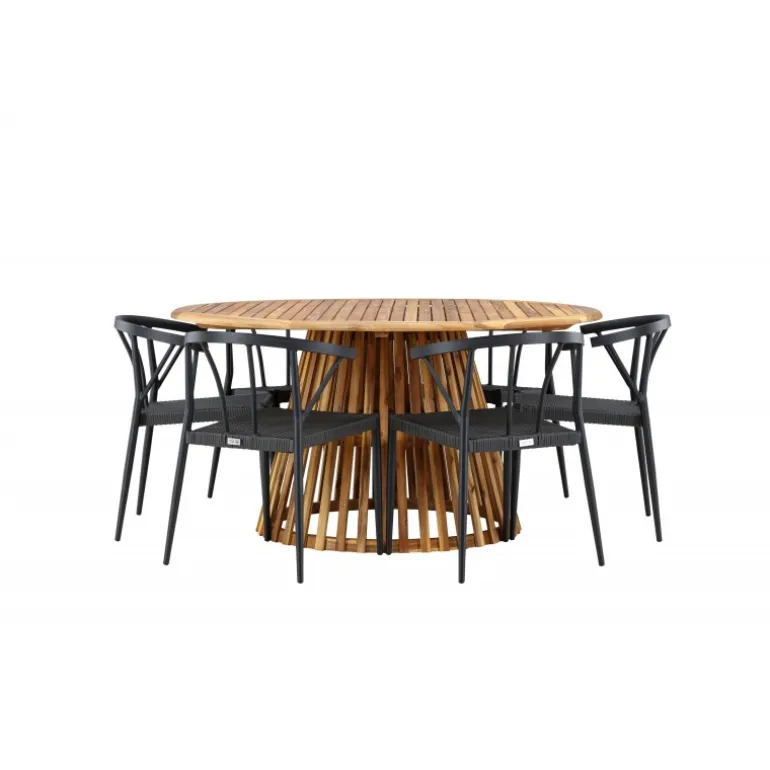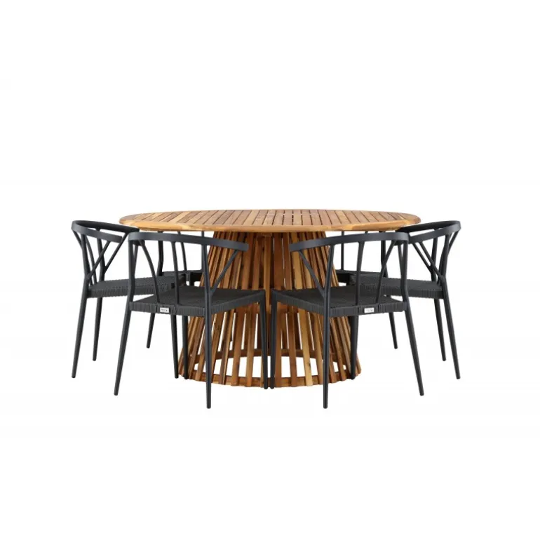 Opdag det perfekte Loungesæt – Havemøbelsæt til din udendørs omgivelser med vores elegante Tucuman bord og de stilfulde Stina stole. Med en imponerende diameter på 150 cm tilbyder Tucuman bordet masser af plads til familiemiddage og hyggelige sammenkomster i det fri. Fremstillet af akacietræ, tilføjer Tucuman bordet en naturlig og indbydende atmosfære til dit udendørsområde med sin harmoniske naturfarve. Dets design integreres sømløst i omgivelserne og skaber en fredelig atmosfære, hvor du og dine gæster kan slappe af og nyde lækre måltider. Stina stolene er lavet af fletmateriale, hvilket giver dem en robust konstruktion til udendørs brug. Den elegante sorte farve på stolene tilføjer et sofistikeret touch til din udendørs spisestue og komplimenterer bordets naturlige træfarve på en stilfuld måde. Dette Loungesæt – Havemøbelsæt leveres komplet med seks komfortable stole, perfekt til afslappede måltider og sociale sammenkomster udendørs. Med Tucuman og Stina Loungesæt – Havemøbelsættet kan du skabe et indbydende og stilfuldt udendørsmiljø, hvor din familie og gæster kan nyde fuldt ud.