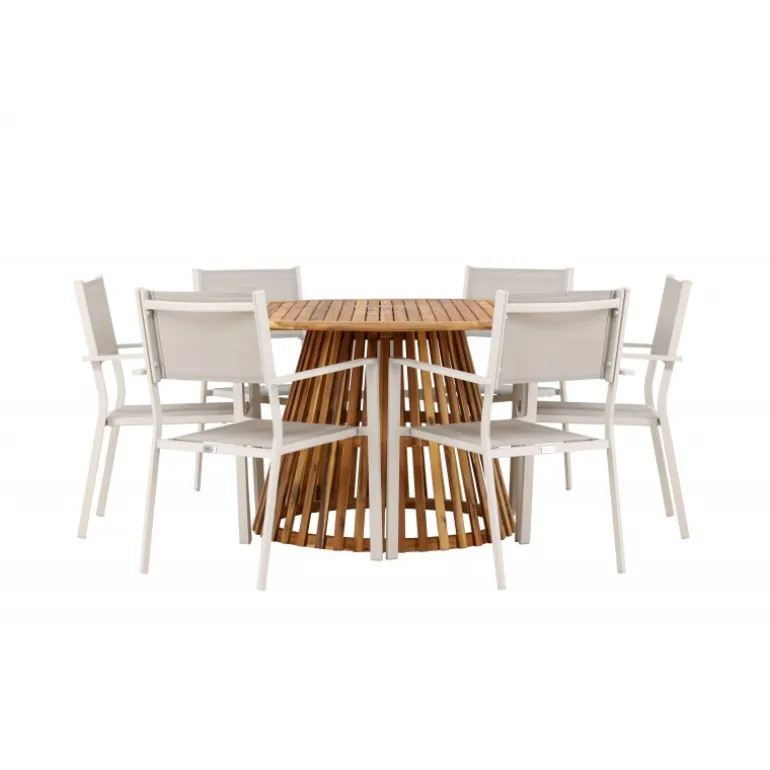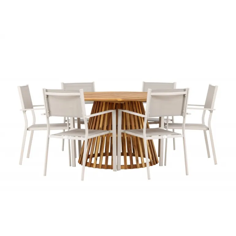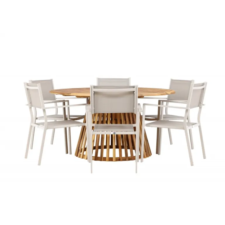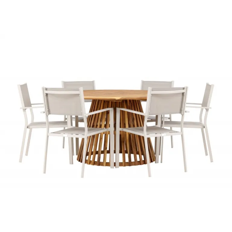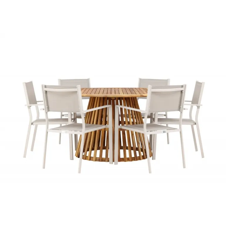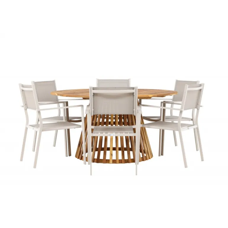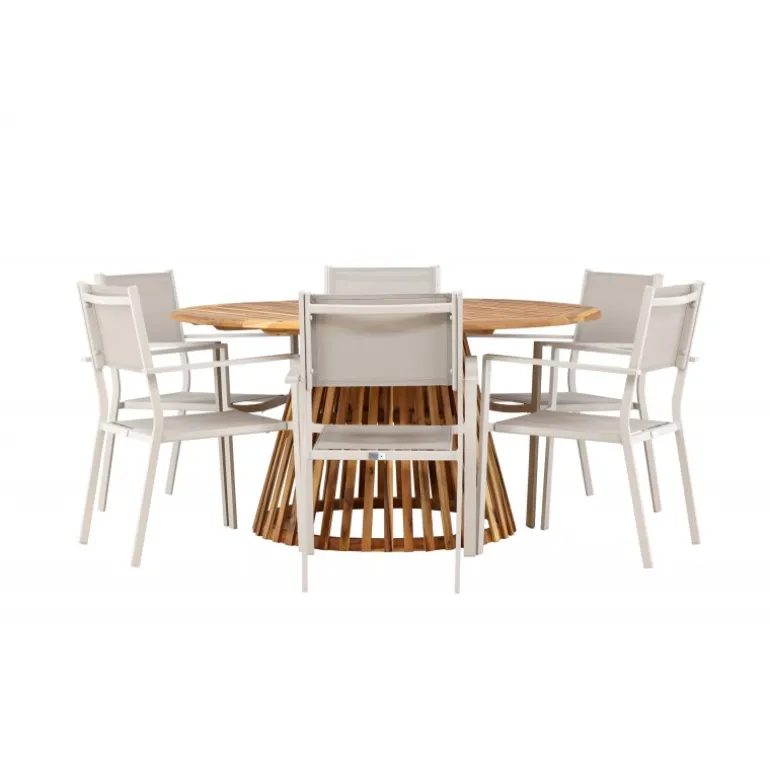 - Moderne design: Copacabana-stolene er lavet af aluminium og har en blød beige farve, der komplementerer bordets naturlige tone.