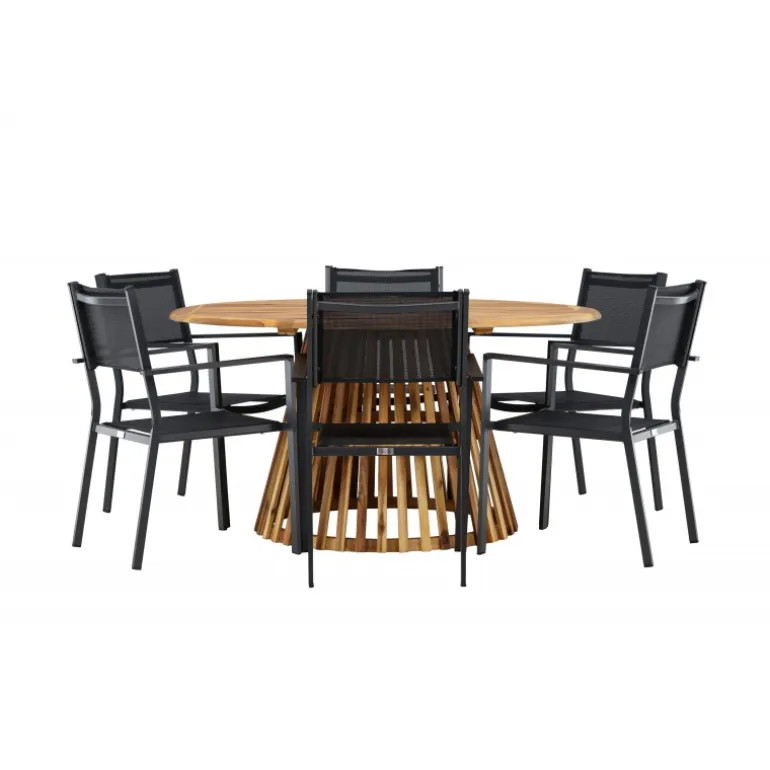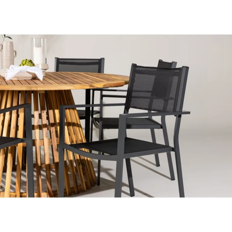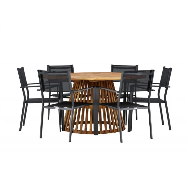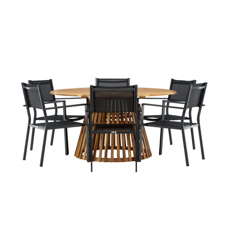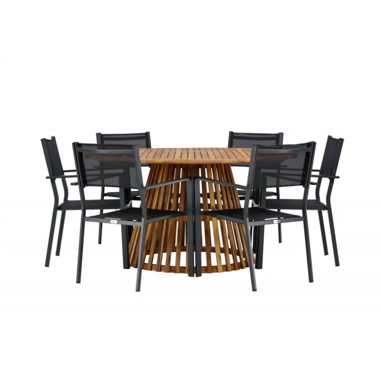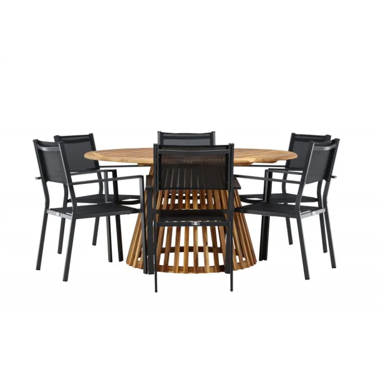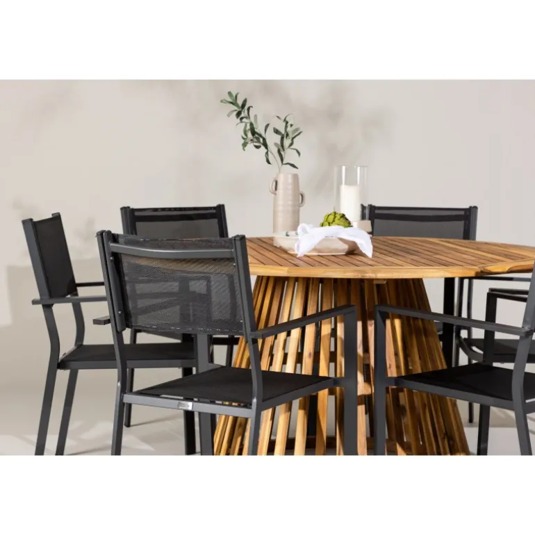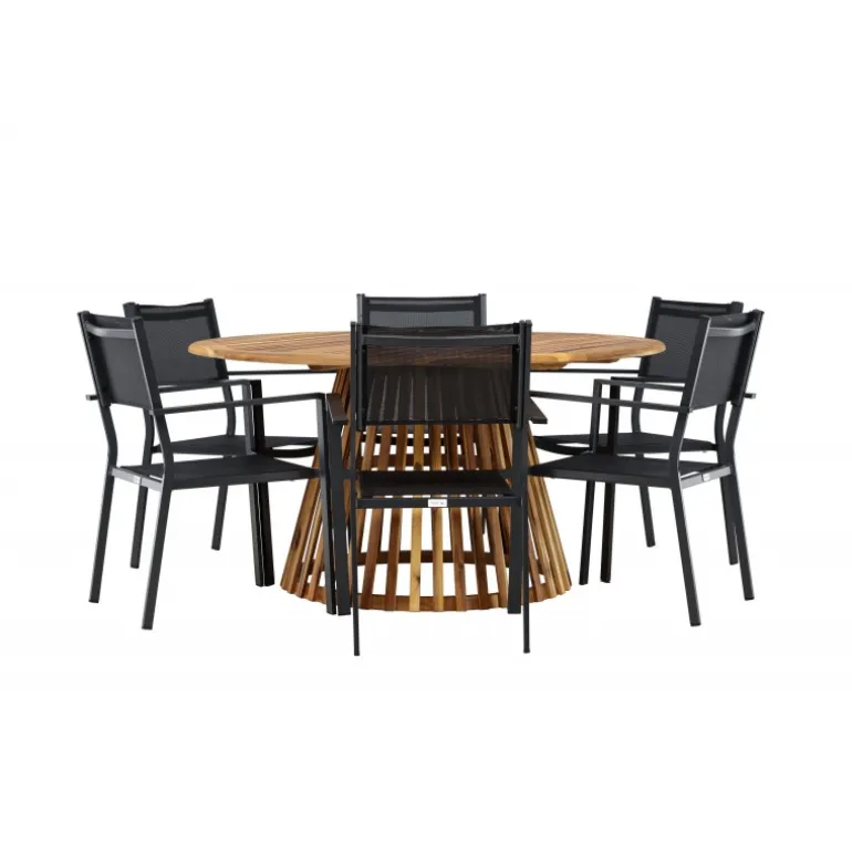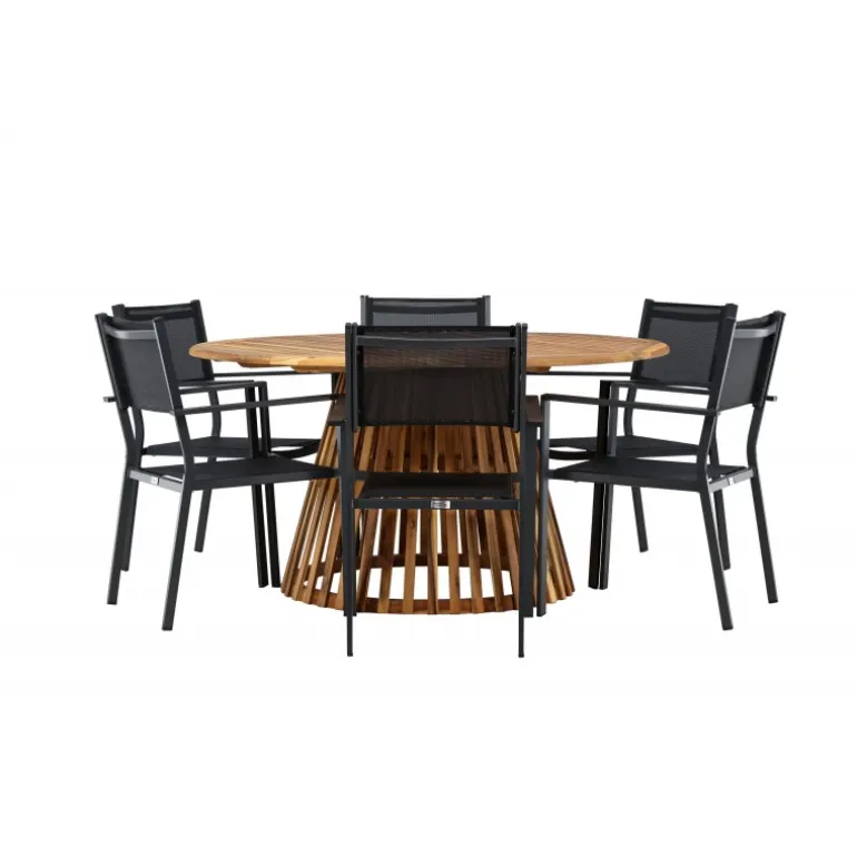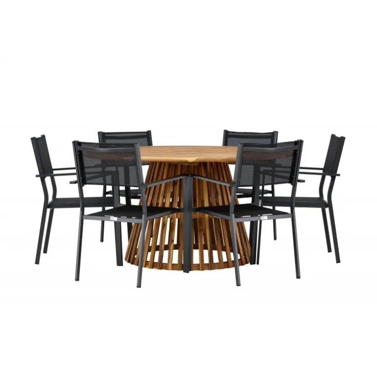 - Plads til alle: Bordet har en diameter på 120 cm og leveres med seks stole, hvilket gør det ideelt til familiemiddage og sociale sammenkomster.