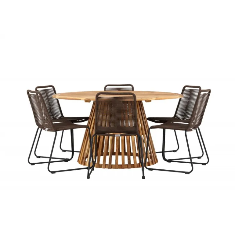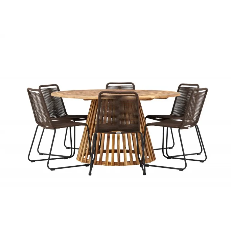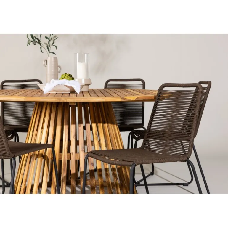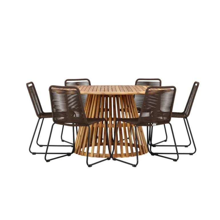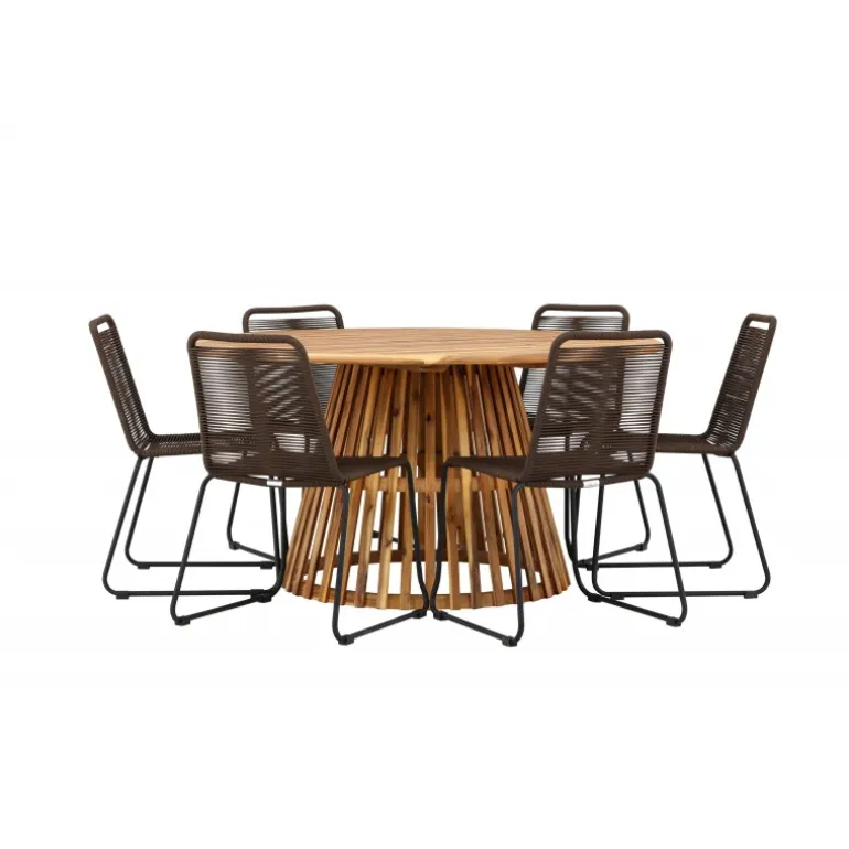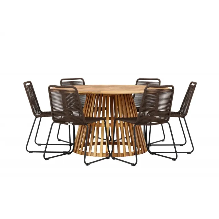 Opdag det perfekte Loungesæt – Havemøbelsæt til dit udendørsområde med vores elegante Tucuman bord og stilfulde Lindos stole. Med en imponerende diameter på 120 cm tilbyder Tucuman bordet masser af plads til familiemiddage og hyggelige sammenkomster under åben himmel. Fremstillet af akacietræ, giver Tucuman bordet en naturlig og indbydende følelse til dit udendørsmiljø. Dets naturlige farve blender problemfrit ind i omgivelserne og skaber en fredelig atmosfære, hvor du og dine gæster kan slappe af og nyde lækre måltider. Lindos stolene er lavet af aluminium, hvilket giver dem en robust konstruktion, der er egnet til udendørs brug. De elegante sorte stole tilføjer et sofistikeret touch til dit udendørs spiseområde og komplementerer bordets naturlige træfarve på en stilfuld måde. Dette Loungesæt – Havemøbelsæt kommer komplet med seks komfortable stole, perfekt til afslappede måltider og udendørs socialisering. Med Tucuman og Lindos Loungesæt – Havemøbelsættet kan du skabe et indbydende og stilfuldt udendørs miljø, hvor din familie og dine gæster kan nyde sig fuldt ud.