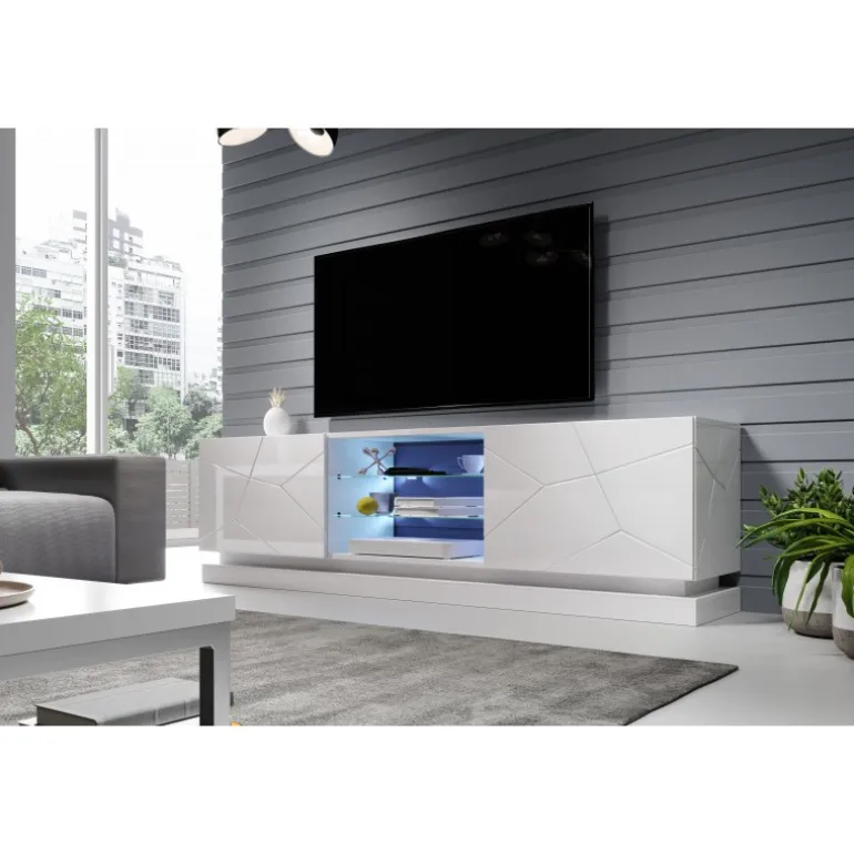 TV bordet QIU 200 i hvid er den perfekte løsning til din stue. Med dimensionerne Højde: 57 cm, Bredde: 200 cm, Dybde: 40 cm tilbyder dette elegante møbel rigelig plads til din underholdningsenhed og mere. Korpus og fronter er fremstillet af højglans foileret MDF, hvilket giver et moderne og stilrent look. Hængslerne er udstyret med stille lukning, der sikrer en lydløs og glat åbning og lukning af skabslågerne. Derudover kan du vælge at tilføje LED-belysning, der skaber en hyggelig atmosfære i rummet.