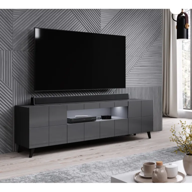 TV bordet REJA i grafisk glans er en elegant og funktionel tilføjelse til dit hjem. Med dimensioner på 57,5 cm i højde, 184 cm i bredde og 45 cm i dybde (uden ben 52,5 cm i højde), passer dette TV bord perfekt til moderne indretninger. Sider og top er lavet af glansmilled MDF spånplader, og frontene er også i glansmilled MDF spånplader, hvilket giver et stilfuldt og sofistikeret udseende. Resten af elementerne er lavet af lamineret spånplader. TV bordet har ingen håndtag, da frontene strækker sig over toppen for et rent og minimalistisk look. De Sorte plastikben og LED-belysningen (tilgængelige i hvid og Blå) tilføjer ekstra flair til dit mediecenter.