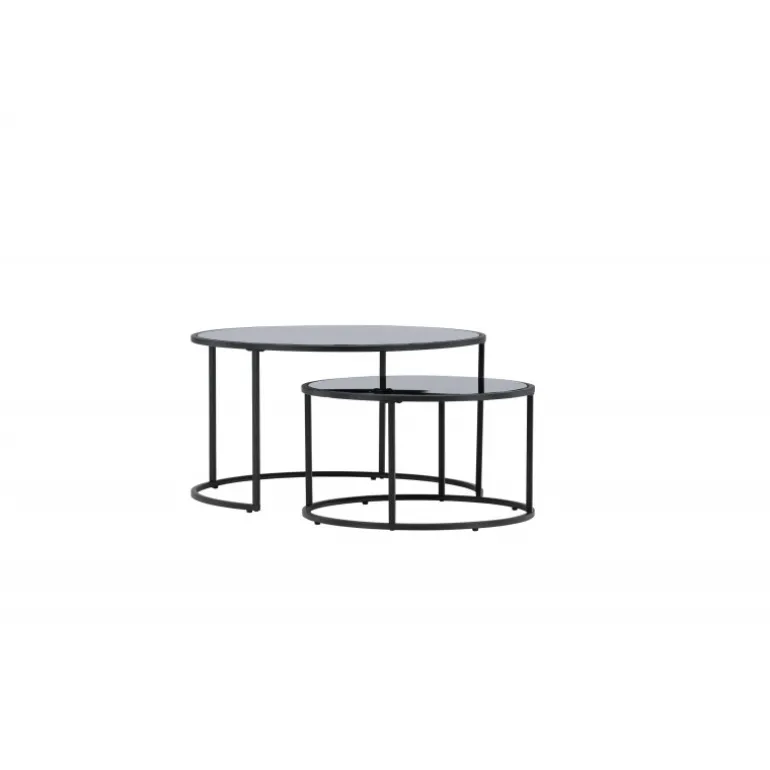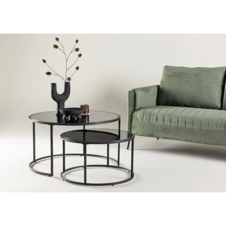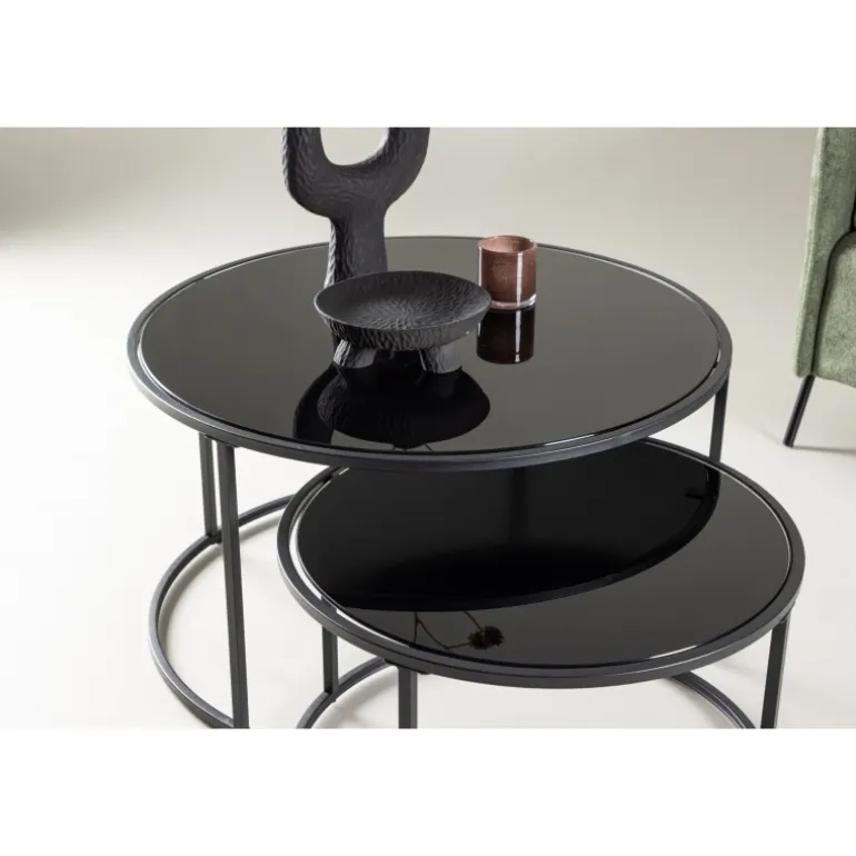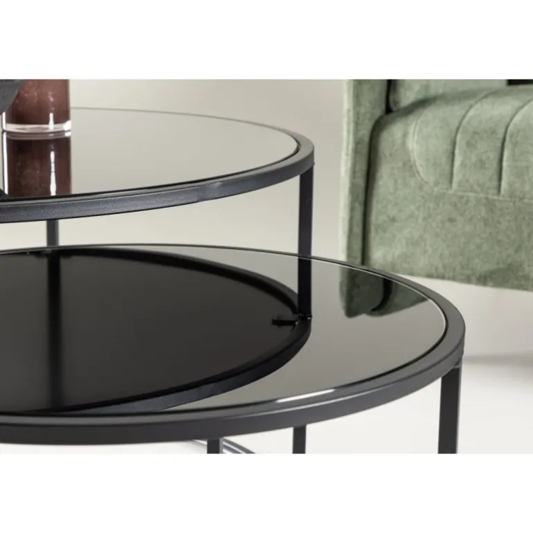 Twin sofabordet er et elegant og gennemtænkt møbel, der tilføjer et sofistikeret touch til din stue. Twin kommer med to matchende sofaborde i forskellige størrelser, hvilket giver en fleksibel og praktisk løsning til din indretning. Det mindre sofabord kan glat glide under det større, når det ikke er i brug, hvilket sparer plads og giver et stilfuldt look. Bordpladerne i sort glas og benene i stål skaber en moderne og elegant æstetik. Med en diameter på 79 cm for det store bord og 59,5 cm for det lille, og højder på henholdsvis 44 cm og 34 cm, tilbyder Twin et balanceret og harmonisk design. Twin sofabordene indbyder til afslappede øjeblikke og hyggelige samtaler i din stue. Det slanke design og den gennemtænkte konstruktion gør Twin til en elegant interiørdetalje, der skaber en indbydende atmosfære i dit hjem.