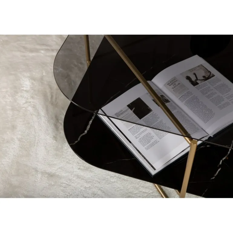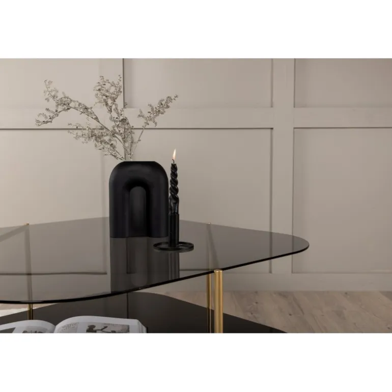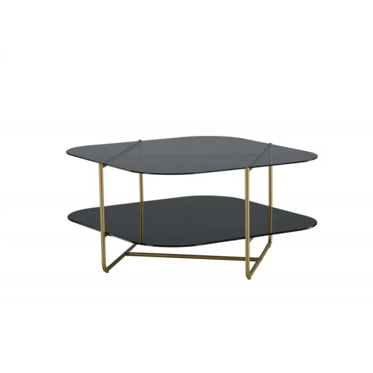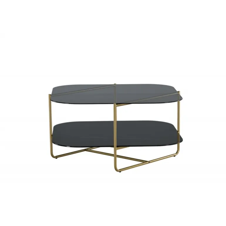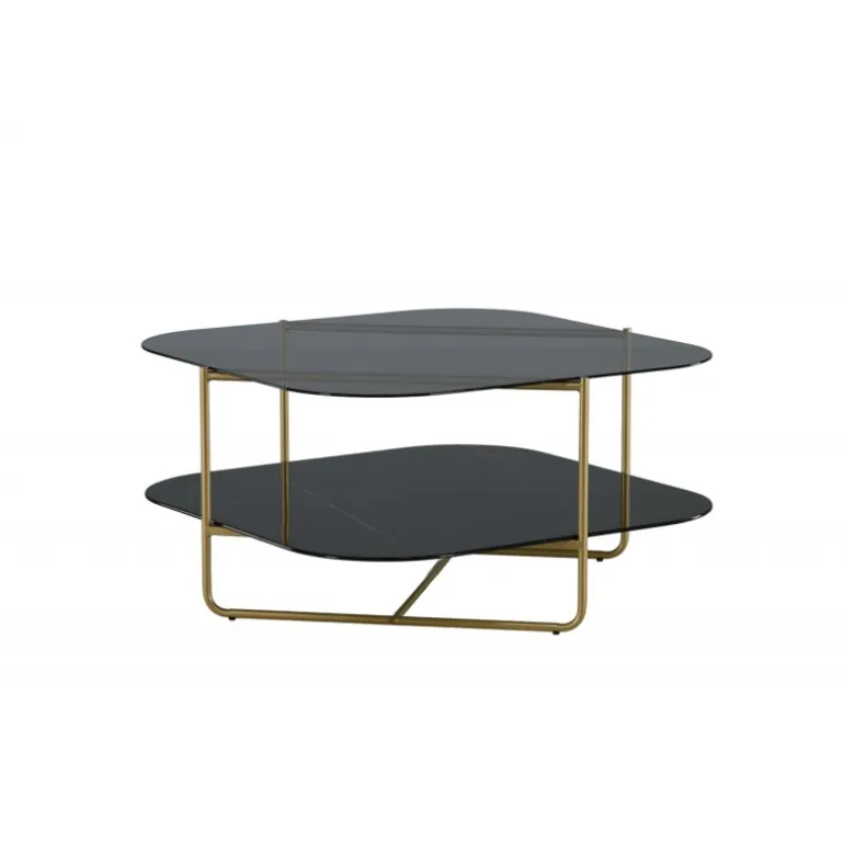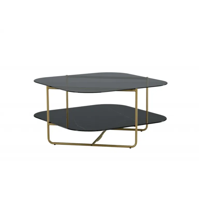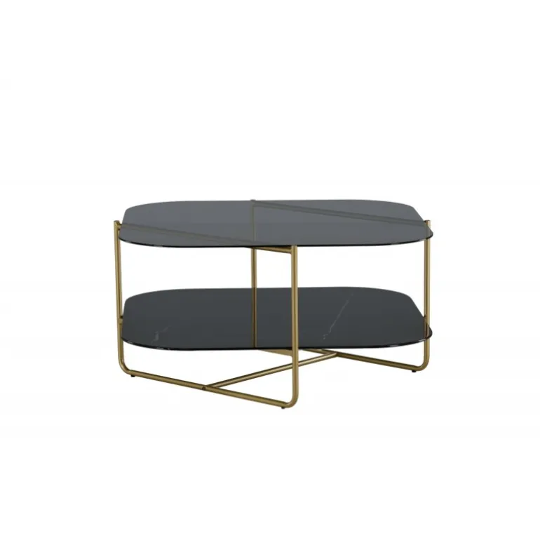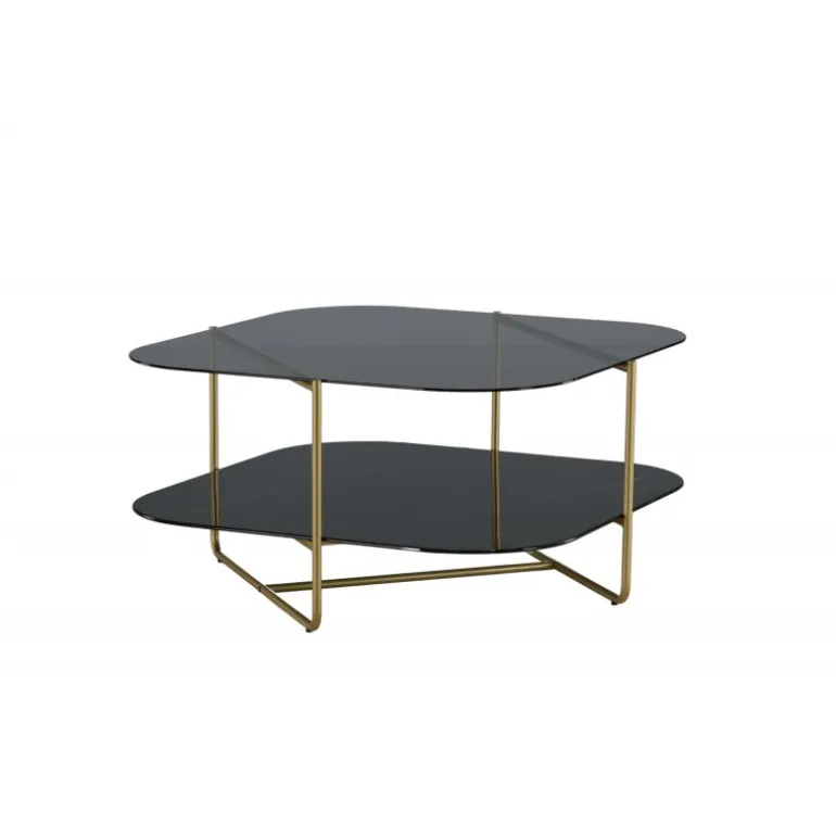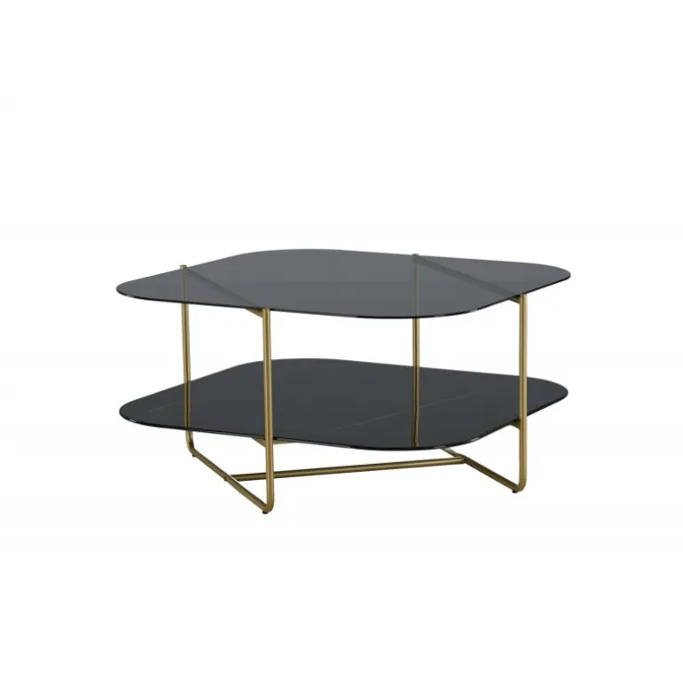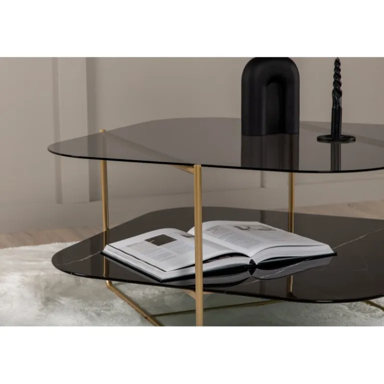 Skab en stilbevidst atmosfære i stuen med dette iøjnefaldende sofabord fra UN-Line serien! Bordets design udstråler modernitet med sin slanke form og smalle ramme i messingfarvet metal, som bidrager til et luftigt og luksuriøst look. Toppladen er i røgfarvet sort glas, og de synlige hylder er lavet af smuk sort marmorglas – lige så elegant som praktisk. UN-Line bliver en stilfuld ikon foran sofaen og vil garanteret hæve indretningsniveauet i dit hjem. Bordmål: 85x85x45 cm.