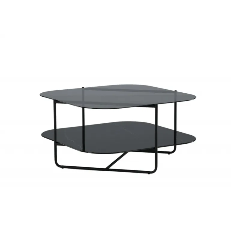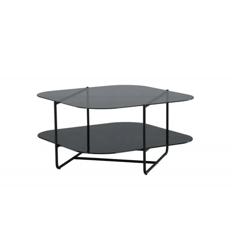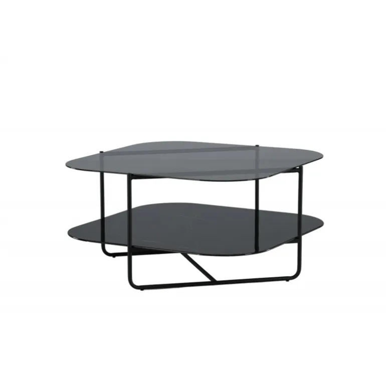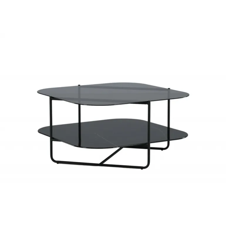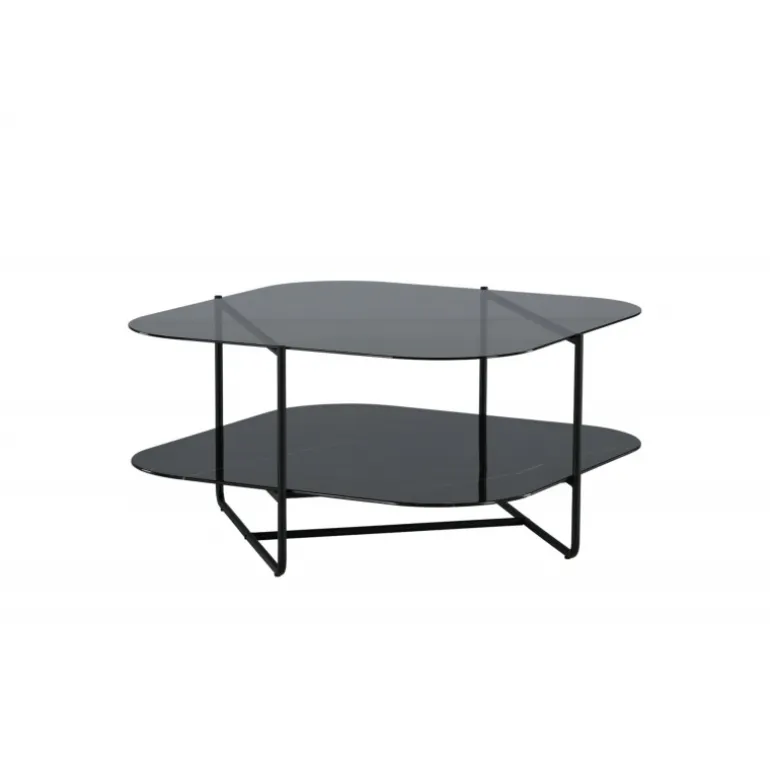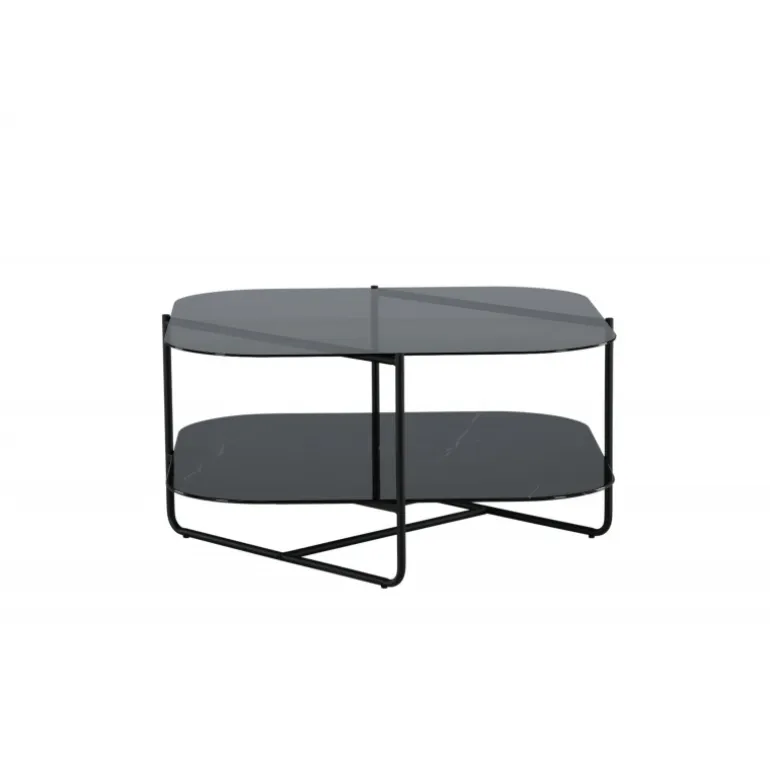 Skab en stilbevidst atmosfære i stuen med dette iøjnefaldende sofabord fra UN-Line serien! Bordets design ånder af modernitet med sin slanke konstruktion og smalle ramme i sort metal, som bidrager til et luftigt og minimalistisk udseende. Toppladen er i røgfarvet sort glas, og de synlige hylder er lavet af smuk sort marmorglas – både elegant og praktisk. UN-Line bliver en stilfuld ikon foran sofaen og vil garanteret hæve indretningsniveauet i dit hjem. Bordets dimensioner: 85x85x45 cm.