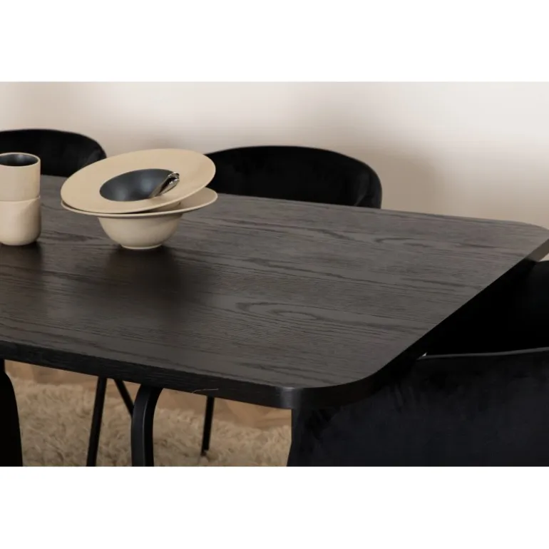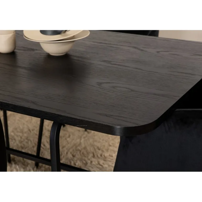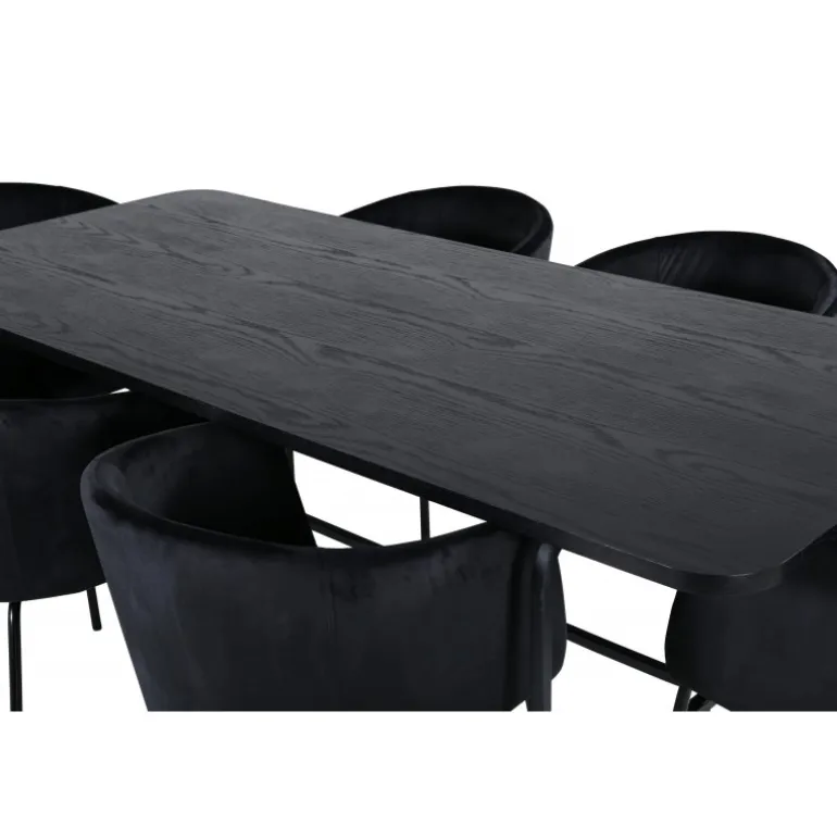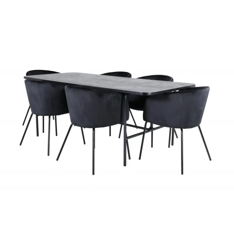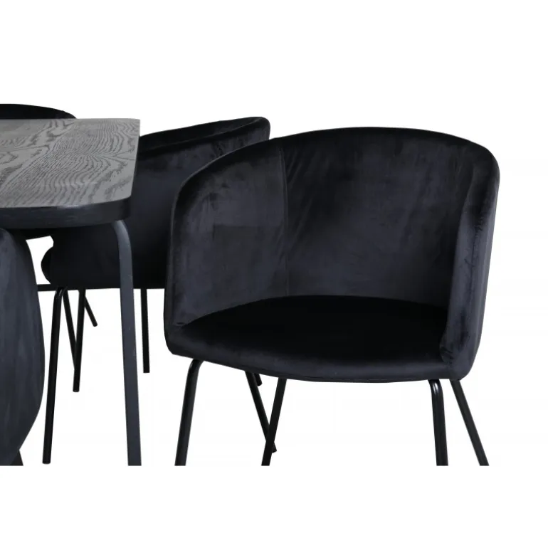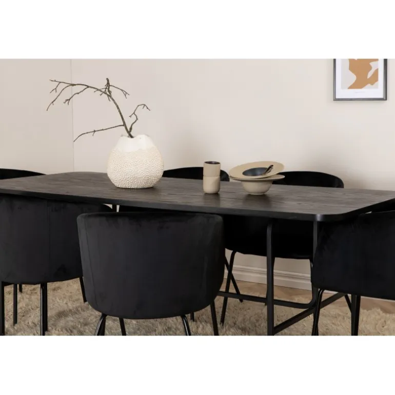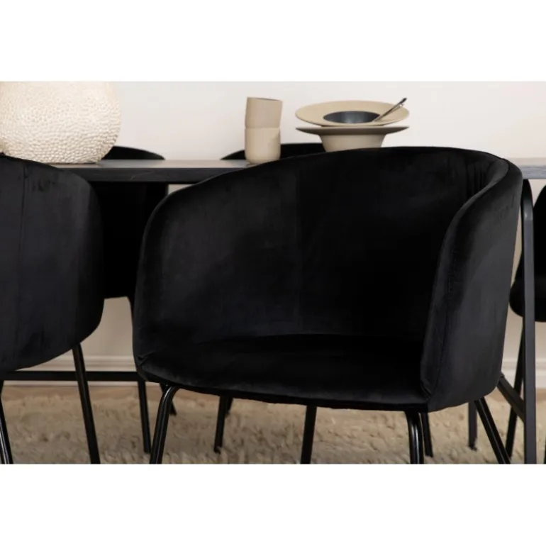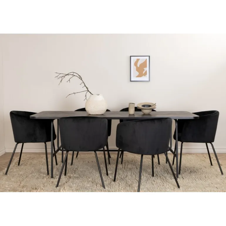 Et madgruppesæt, der fokuserer på komfort og elegance! Vores populære spisebord Uno er lige så stilfuldt som tidløst. Bordet er rektangulært designet med let afrundede hjørner, en topplade i sort MDF med finer og stilfulde underben i sort metal. Bordmål: Længde: 200 cm, Bredde: 90 cm, Højde: 74 cm. Her i perfekt kombination med 6 Berit spisebordsstole i sort velourstof og stilfulde smalle stoleben i sort jern. Stolemål: Højde: 78 cm, sædehøjde: 49 cm, bredde: 55 cm, dybde: 55 cm.