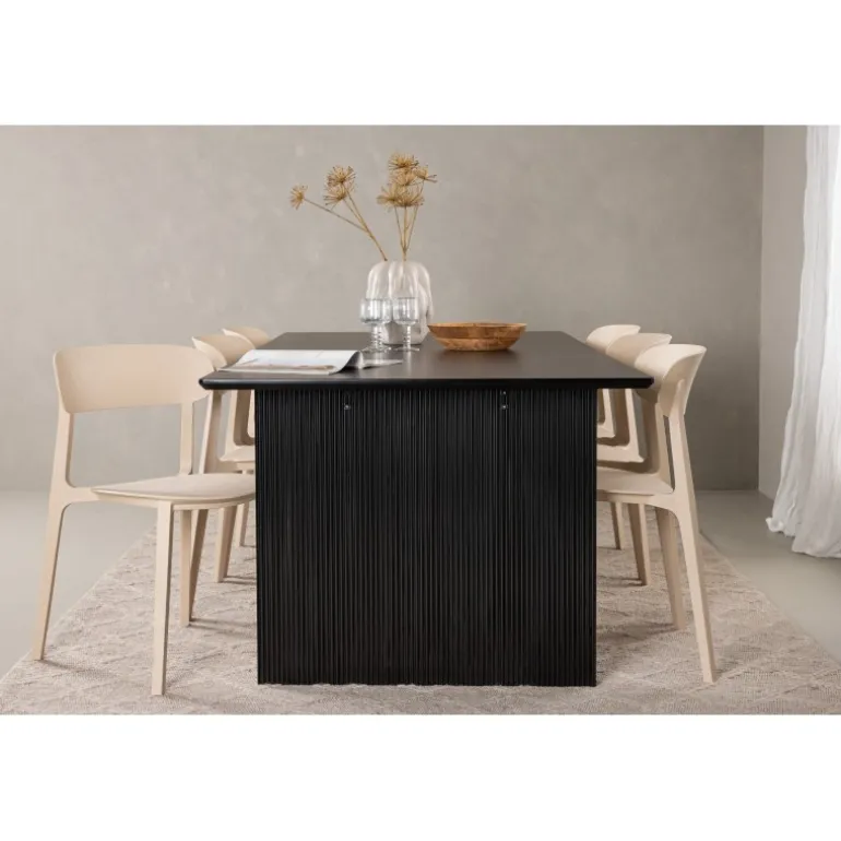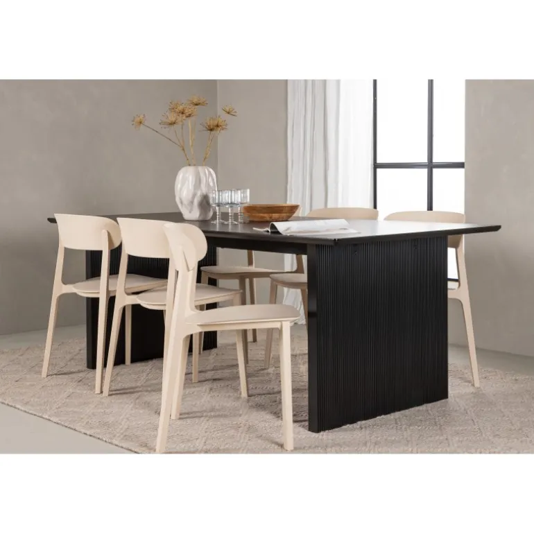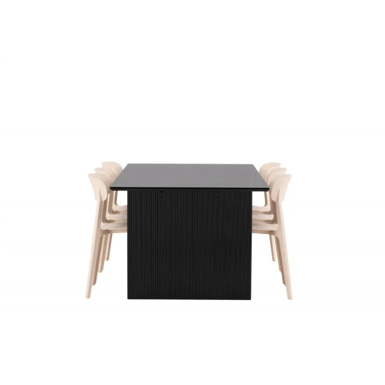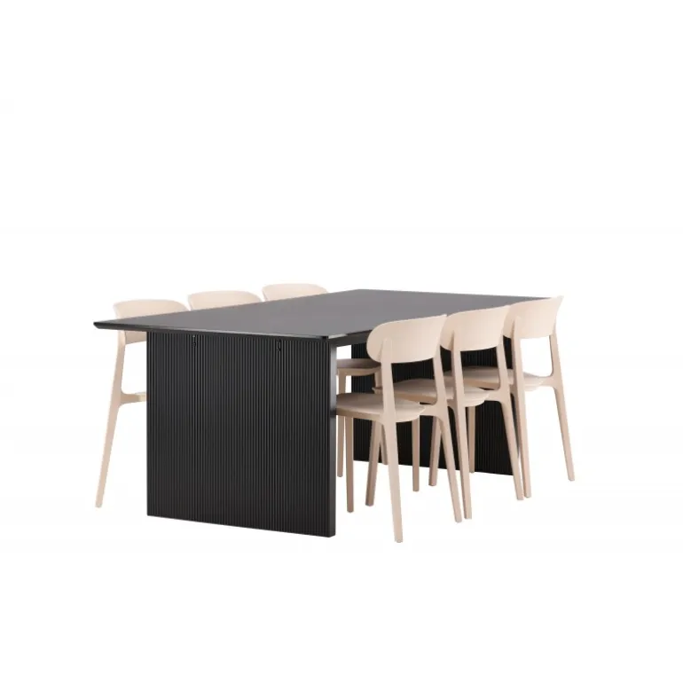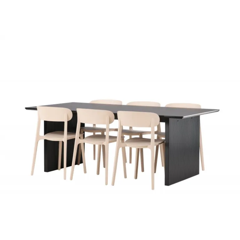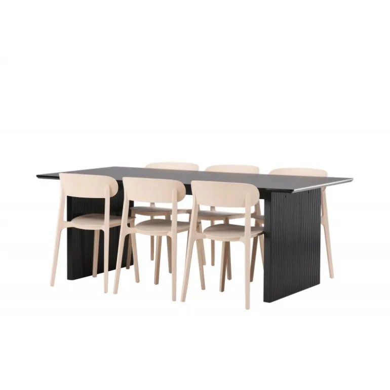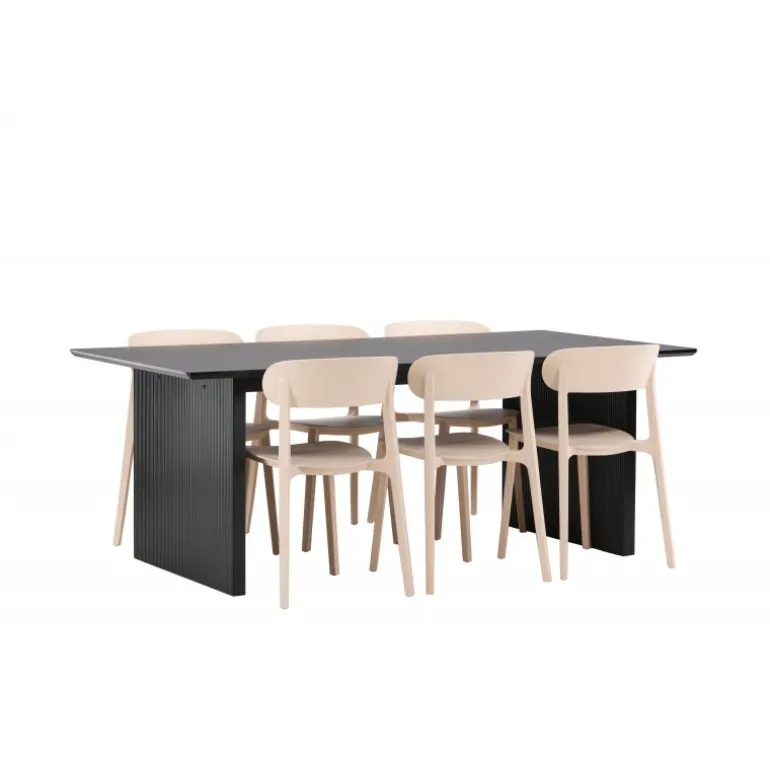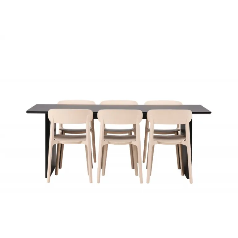 Stilfuldt, smart og elegant Spisebordssæt med alle de rigtige funktioner! Vail spisebordene har lige nordiske former og er lavet af holdbart sort MDF – både stilfuldt og praktisk. Bordpladen er tynd i et rektangulært design og balancerer på to robuste træplader, der udgør understellet. Her i fremragende kombination med vores klassiske spisebordsstole fra Åstol-serien. Stolen er samlet i en smagfuld lys-polished farve i trækomposit med et luftigt design og nordiske lige former. Nyd sociale tider foran – her får alle en plads!