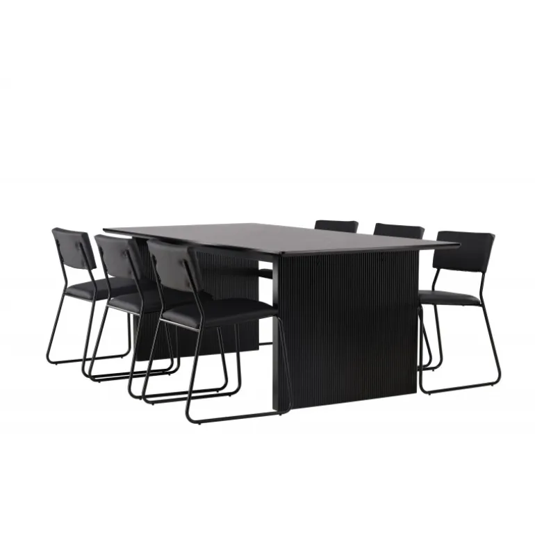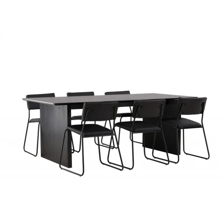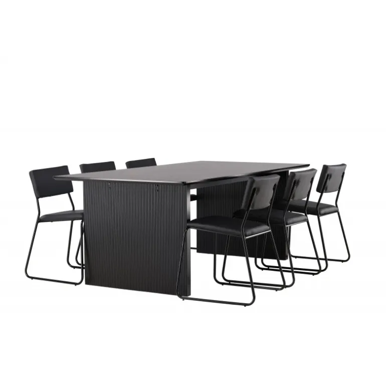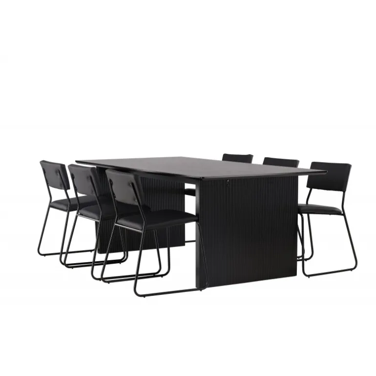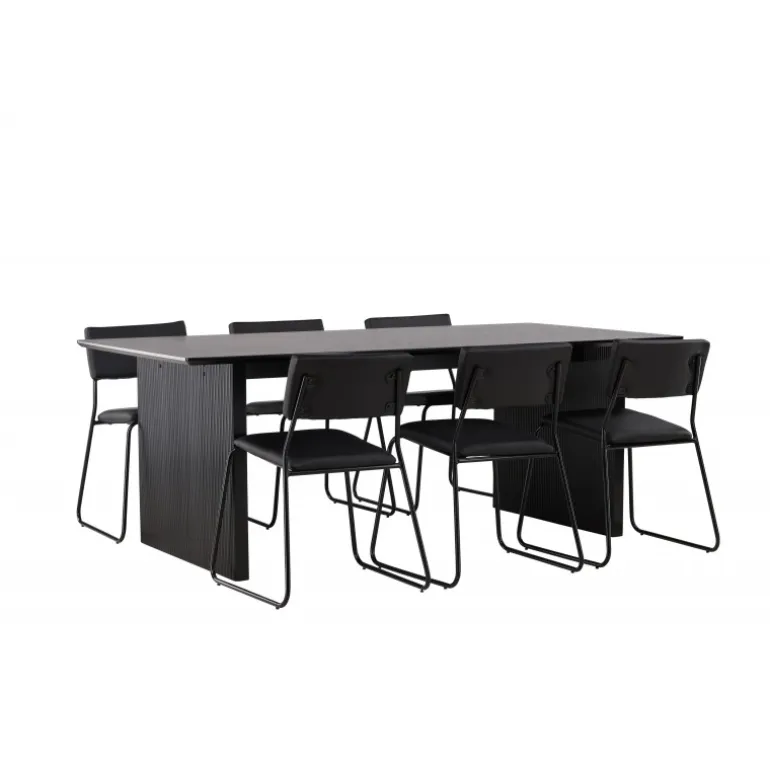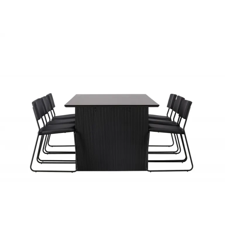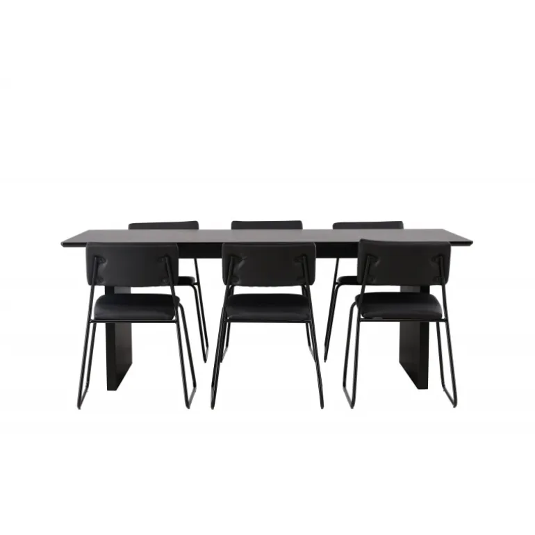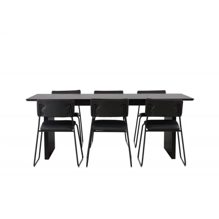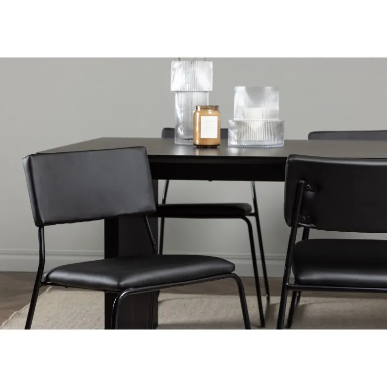 Skab en festlig atmosfære med vores Vail, Kenth Spisebordssæt! Dette sorte Spisebordssæt kommer med minimalistiske elementer og en nordisk stil. Det rektangulære spisebord Vail er lavet af holdbart MDF i en sodet sort farve. Bordpladen er tynd og rektangulær og balancerer på to robuste træplader, der udgør basen. Sættet inkluderer også vores sorte spisebordsstole fra serien Kenth. Stolene har ryg og sæde i sort polyurethanlæder og polyester samt dekorative, smalle ben i jern. Det minimalistiske design skaber en luftig følelse. Bordmål: 200×100 cm.