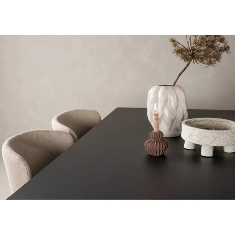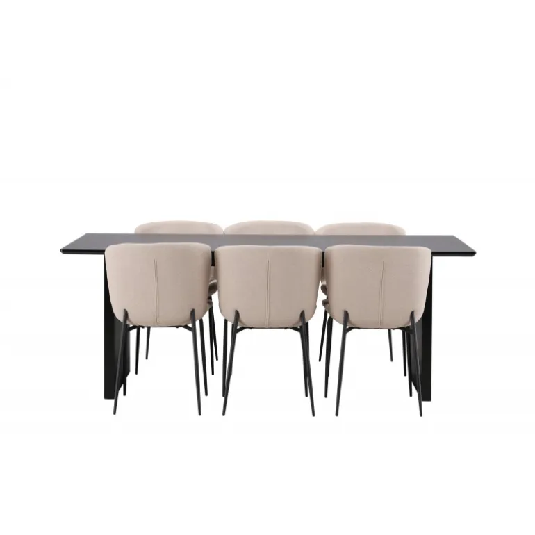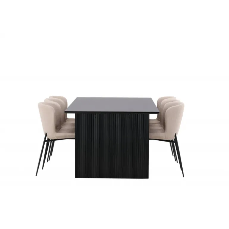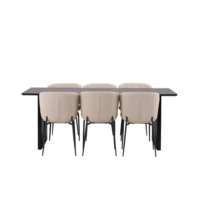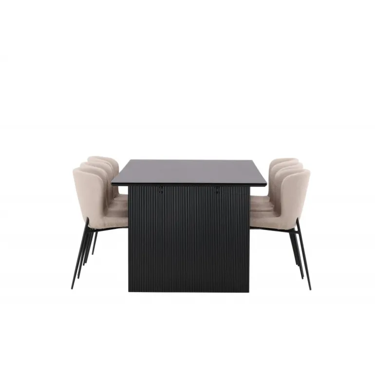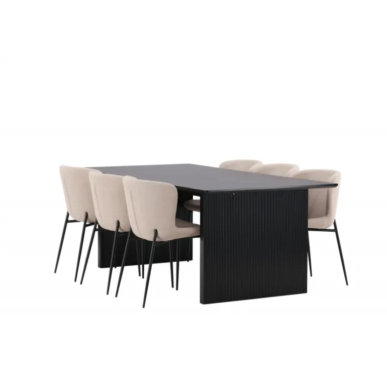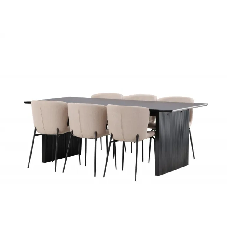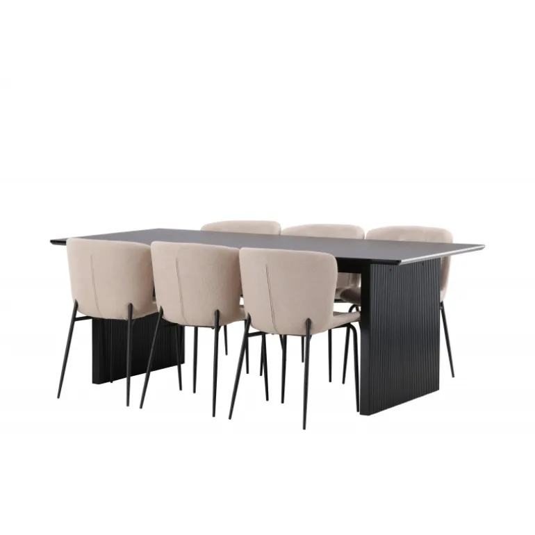 Et Spisebordssæt designet fuldstændigt i tråd med de nyeste tendenser! Vores rektangulære spisebord fra Vail-serien har lige nordiske former og er lavet af holdbart MDF i en sort farve. Bordpladen er tynd og balanceret på to robuste træplader, der udgør understellet – så pænt som det er holdbart. Her i en luksuriøs kombination med vores komfortable spisestole Modesto. Stolen er fuldt polstret i soot grå bouclé stof med stilfulde smalle ben i sort metal. Den let afrundede ryg og polstrede sædepude giver ekstra komfort og forlænger hyggelige måltider rundt om spisebordet. Det skal føles godt at sætte sig ned til et dejligt måltid!