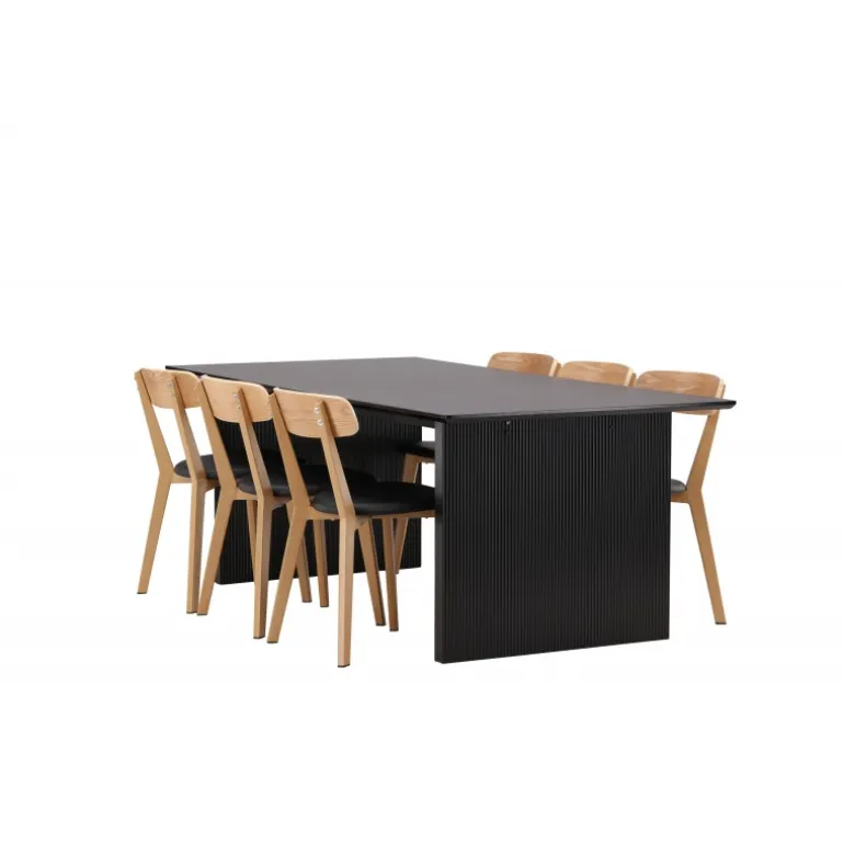 Det er et match! Vores rektangulære spisebord fra Vail-serien har lige nordiske former og er lavet af holdbart MDF i en sodsort farve. Bordpladen er tynd og balancerer på to robuste træplader, der udgør understellet – lige så pænt som det er holdbart. Her i perfekt kombination med vores smagfulde spisestole fra Sanjos-serien. Stolen tilhører Venture Home-kollektionen og har et fantastisk design i farverne sort og naturtræ. Det bløde sæde er skumfyldt for ekstra komfort og har et trendy PU-stof i sort. Ryggen og benene er lavet af lyst træ og giver indtryk af et klassisk design. Møbler stilfuldt og klassisk!