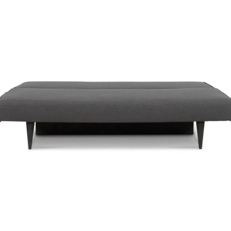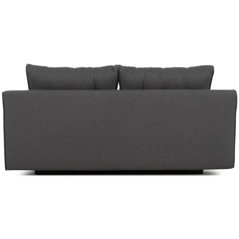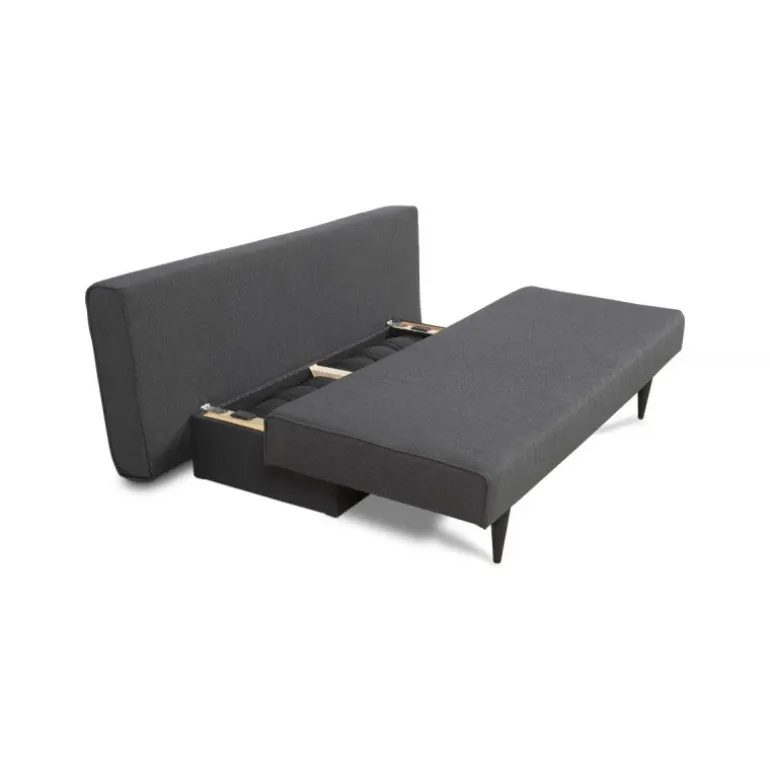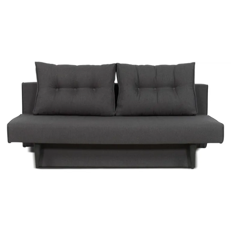 Smart sovesofa i praktisk design med god komfort. Sofaen er betrukket med slidstærkt sort tekstil og hviler på elegante ben i lyst træ. Sofaen er forsynet med store, løse, velpolstrede ryghynder med orange knapper. I magasinet under sædet er der plads til opbevaring af hynder, sengetøj m.m. En kompakt løsning, der nemt og hurtigt kan omdannes fra sofa til seng ved at trække sædet ud og tippe ryglænet frem. Ideel til f.eks. teenageværelset eller sommerhuset.